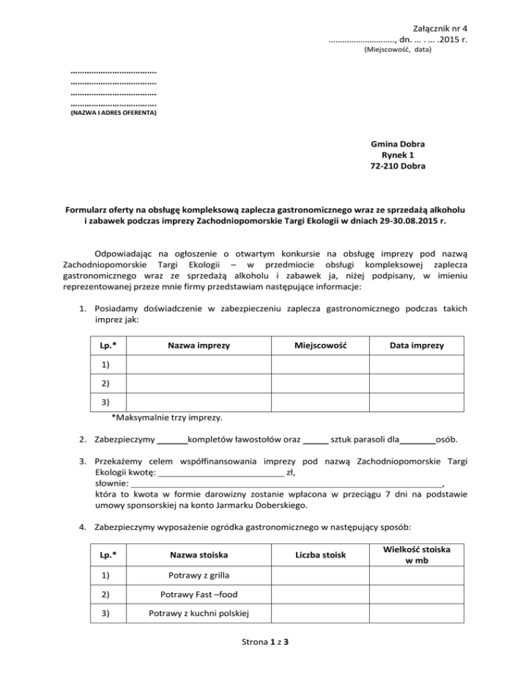 Załącznik nr 4 ……………………….., dn. … . … .2015 r. (Miejscowość, data) ………………………………. ………………………………. ………………………………. ………………………………. (NAZWA I ADRES OFERENTA) Gmina Dobra Rynek 1 72-210 Dobra Formularz oferty na obsługę kompleksową zaplecza gastronomicznego wraz ze sprzedażą alkoholu i zabawek podczas imprezy Zachodniopomorskie Targi Ekologii w dniach 29-30.08.2015 r. Odpowiadając na ogłoszenie o otwartym konkursie na obsługę imprezy pod nazwą Zachodniopomorskie Targi Ekologii – w przedmiocie obsługi kompleksowej zaplecza gastronomicznego wraz ze sprzedażą alkoholu i zabawek ja, niżej podpisany, w imieniu reprezentowanej przeze mnie firmy przedstawiam następujące informacje: 1. Posiadamy doświadczenie w zabezpieczeniu zaplecza gastronomicznego podczas takich imprez jak: Lp.* Nazwa imprezy Miejscowość Data imprezy 1) 2) 3) *Maksymalnie trzy imprezy. 2. Zabezpieczymy kompletów ławostołów oraz sztuk parasoli dla osób. 3. Przekażemy celem współfinansowania imprezy pod nazwą Zachodniopomorskie Targi Ekologii kwotę: zł, słownie: , która to kwota w formie darowizny zostanie wpłacona w przeciągu 7 dni na podstawie umowy sponsorskiej na konto Jarmarku Doberskiego. 4. Zabezpieczymy wyposażenie ogródka gastronomicznego w następujący sposób: Lp.* Nazwa stoiska Liczba stoisk 1) Potrawy z grilla 2) Potrawy Fast –food 3) Potrawy z kuchni polskiej Strona 1 z 3 Wielkość stoiska w mb 4) 5) 6) Małą gastronomię Lody włoskie Watę cukrową 7) 8) 9) 10) 5. Zabezpieczymy 6. Wystawimy szt. nalewaków roll – bar w celu obsługi gości. stoiska z zabawkami o długości mb każde. 7. Zgłaszamy również dodatkowe propozycje: 8. Numer kontaktowy: 9. Email: 10. Oświadczamy, że zapoznaliśmy się z mapą będącą załącznikiem do ogłoszenia, na której wskazana jest lokalizacja ogródków gastronomicznych i stoisk z zabawkami. 11. Oświadczamy, że w przypadku wyboru naszej oferty podpiszemy stosowną umowę dotyczącą wsparcia finansowego imprezy pod nazwą Zachodniopomorskie Targi Ekologii. 12. Oświadczamy, że do dnia 10.08.2015 r. nabędziemy ubezpieczenie od odpowiedzialności cywilnej w zakresie prowadzonej działalności. Ubezpieczenie musi obejmować przynajmniej czas trwania imprezy. 13. Oświadczamy, że sprzedaż napojów alkoholowych odbywać się będzie w miejscu wskazanym przez Organizatora oraz że do dnia 10.08.2015 r. zdobędziemy wszelkie dokumenty i pozwolenia niezbędne do sprzedaży napojów alkoholowych. 14. Oświadczamy, że na wyraźne słowne żądanie Organizatora, służb porządkowych, Policji lub Straży Pożarnej zaprzestaniemy sprzedaży alkoholu, aż do czasu odwołania zakazu. 15. Zobowiązujemy się do ogrodzenia terenu wskazanego przez Organizatora (ogródków gastronomicznych) i zabezpieczenia stosownego wejścia i wyjścia. 16. Zobowiązujemy się do informowania Klientów, iż spożywanie alkoholu dopuszczalne jest jedynie w obrębie ogródków gastronomicznych. 17. Zobowiązujemy się do zachowania bezpieczeństwa, porządku i czystości na terenie wyznaczonym pod ogródki gastronomiczne, poprzez zatrudnienie ochrony i służb porządkowych sprzątających stoły i opróżniających kosze na śmieci. Strona 2 z 3 Załączniki do oferty: 1) Oświadczenie Wykonawcy o dysponowaniu potencjałem technicznym; 2) Oświadczenie oferenta potwierdzające dobry stan techniczny urządzeń oraz posiadanie aktualnych decyzji dopuszczających urządzenia do eksploatacji. 3) Odpis z właściwego rejestru albo zaświadczenie o wpisie do ewidencji działalności gospodarczej (kserokopia); 4) …………………………………………………………………….. ………………………………………... (PIECZĘĆ I PODPIS OFERENTA) *(Podpis osoby uprawnionej lub osób uprawnionych do reprezentowania Wykonawcy w dokumentach rejestrowych lub we właściwym pełnomocnictwie) Strona 3 z 3