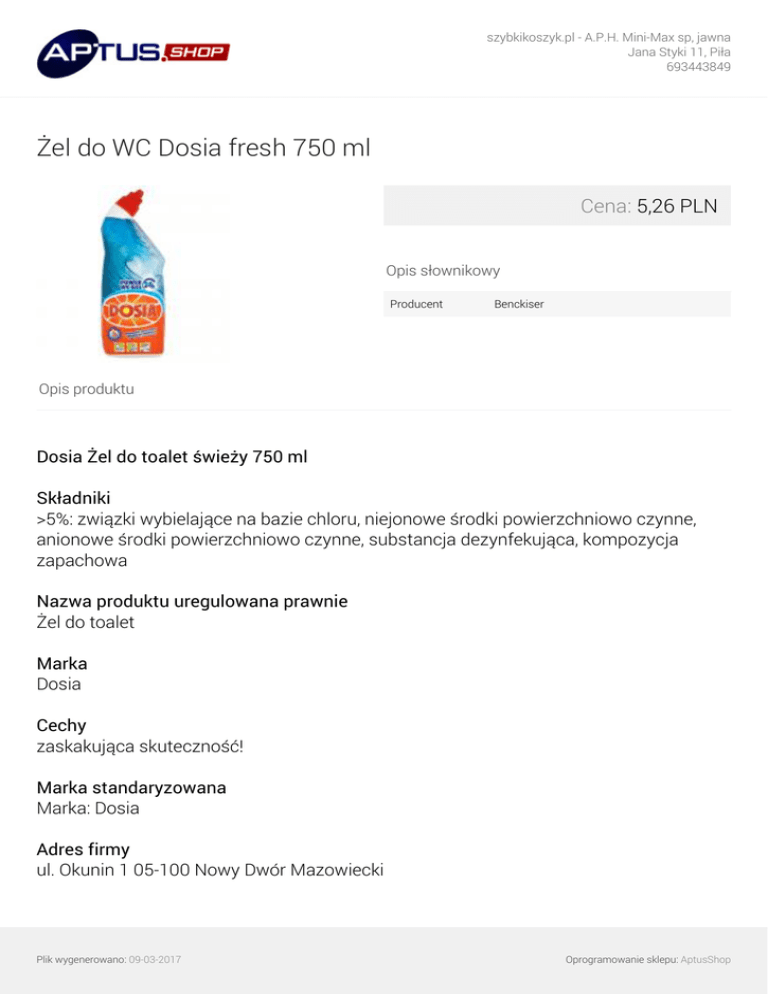 szybkikoszyk.pl - A.P.H. Mini-Max sp, jawna Jana Styki 11, Piła 693443849 Żel do WC Dosia fresh 750 ml Cena: 5,26 PLN Opis słownikowy Producent Benckiser Opis produktu Dosia Żel do toalet świeży 750 ml Składniki >5%: związki wybielające na bazie chloru, niejonowe środki powierzchniowo czynne, anionowe środki powierzchniowo czynne, substancja dezynfekująca, kompozycja zapachowa Nazwa produktu uregulowana prawnie Żel do toalet Marka Dosia Cechy zaskakująca skuteczność! Marka standaryzowana Marka: Dosia Adres firmy ul. Okunin 1 05-100 Nowy Dwór Mazowiecki Plik wygenerowano: 09-03-2017 Oprogramowanie sklepu: AptusShop szybkikoszyk.pl - A.P.H. Mini-Max sp, jawna Jana Styki 11, Piła 693443849 Dodatkowe informacje Więcej informacji o składnikach na www.rbeuroinfo.com Company Name Reckitt Benckiser (Poland) S.A. Przygotowanie i stosowanie Sposób użycia: Toaleta: nanieść żel pod obrzeże muszli i pozostawić na noc. Łazienka: nanieść żel na powierzchnię umywalki, wanny itp., odczekać 2-3 min i spłukać dużą ilością wody. Rury w kuchni i łazience: Wlać żel do rury w celu pozbycia się nieprzyjemnego zapachu. Rodzaj przechowywania Typ: Przechowywać w temperaturze otoczenia Rozmiar opakowania 750 Jednostka (tekst opisowy) ml Średnia miara Średnia miara (e) Informacje o recyklingu Opakowanie: Nadające się do recyklingu Jednostka (specyficzna) Jednostka (specyficzna): Mililitrów Rodzaj opakowania Typ: Butelka plastikowa Wymiar liczbowy Wymiar liczbowy: 750 Wymiar Plik wygenerowano: 09-03-2017 Oprogramowanie sklepu: AptusShop szybkikoszyk.pl - A.P.H. Mini-Max sp, jawna Jana Styki 11, Piła 693443849 Wymagana wysokość na półce: 261 Wymagana szerokość na półce: 93 Wymagana głębokość na półce: 58 Waga Waga brutto: 859 Sprzedaż jednostkowa Wysokość: 261 Szerokość: 93 Głębokość: 58 Adres zwrotny Reckitt Benckiser (Poland) S.A. ul. Okunin 1 05-100 Nowy Dwór Mazowiecki tel. +48 22 76 59 00 www.dosia.info Tel. +48 22 5419115 Adres dystrybutora Reckitt Benckiser (Poland) S.A. ul. Okunin 1 05-100 Nowy Dwór Mazowiecki Telefon/Fax kontaktowy +4822765900, +48225419115 Adres internetowy www.dosia.info Ostrzeżenie dotyczące bezpieczeństwa Dosia żel do toalet - świeży. Niebezpieczeństwo. Zawiera: Podchloryn sodu, Wodorotlenek sodu. Może powodować korozję metali. Powoduje poważne oparzenia skóry oraz uszkodzenia oczu. Chronić przed dziećmi. W razie konieczności zasięgnięcia porady lekarza, należy pokazać pojemnik lub etykietę. Stosować rękawice ochronne i ochronę oczu / ochronę twarzy. W PRZYPADKU POŁKNIĘCIA: Wypłukać usta. NIE wywoływać wymiotów. Natychmiast skontaktować się z OŚRODKIEM ZATRUĆ / lekarzem. W PRZYPADKU KONTAKTU ZE SKÓRĄ (lub z włosami): Natychmiast zdjąć całą zanieczyszczoną odzież. Spłukać skórę pod strumieniem wody. Wyprać zanieczyszczoną odzież przed ponownym użyciem. Natychmiast skontaktować się z OŚRODKIEM ZATRUĆ / lekarzem. W PRZYPADKU DOSTANIA SIĘ DO OCZU: Ostrożnie płukać wodą przez kilka minut. Wyjąć soczewki kontaktowe, jeżeli są i można je łatwo usunąć. Nadal płukać. Natychmiast skontaktować się z OŚRODKIEM ZATRUĆ / Plik wygenerowano: 09-03-2017 Oprogramowanie sklepu: AptusShop szybkikoszyk.pl - A.P.H. Mini-Max sp, jawna Jana Styki 11, Piła 693443849 lekarzem. Przechowywać pod zamknięciem. Zawartość i pojemnik usuwać zgodnie z lokalnymi, regionalnymi, krajowymi i międzynarodowymi przepisami. Uwaga! Nie stosować razem z innymi produktami. Może wydzielać niebezpieczne gazy (chlor). A.I.S.E. Ostrzeżenia Nie połykać. W razie połknięcia skontaktować się z lekarzem., Przechowywać poza zasięgiem dzieci, Unikać kontaktu z oczami. W razie kontaktu dokładnie przemyć oczy wodą Języki na opakowaniu czeski, węgierski, polski, słowacki Regulacje CLP działanie żrące: Niebezpieczeństwo Język produktu Główny język opisu: polski Język danych: polski Podzielony opis produktu Nazwa funkcjonalna: Żel do toalet Wariant: świeży Plik wygenerowano: 09-03-2017 Powered by TCPDF (www.tcpdf.org) Oprogramowanie sklepu: AptusShop