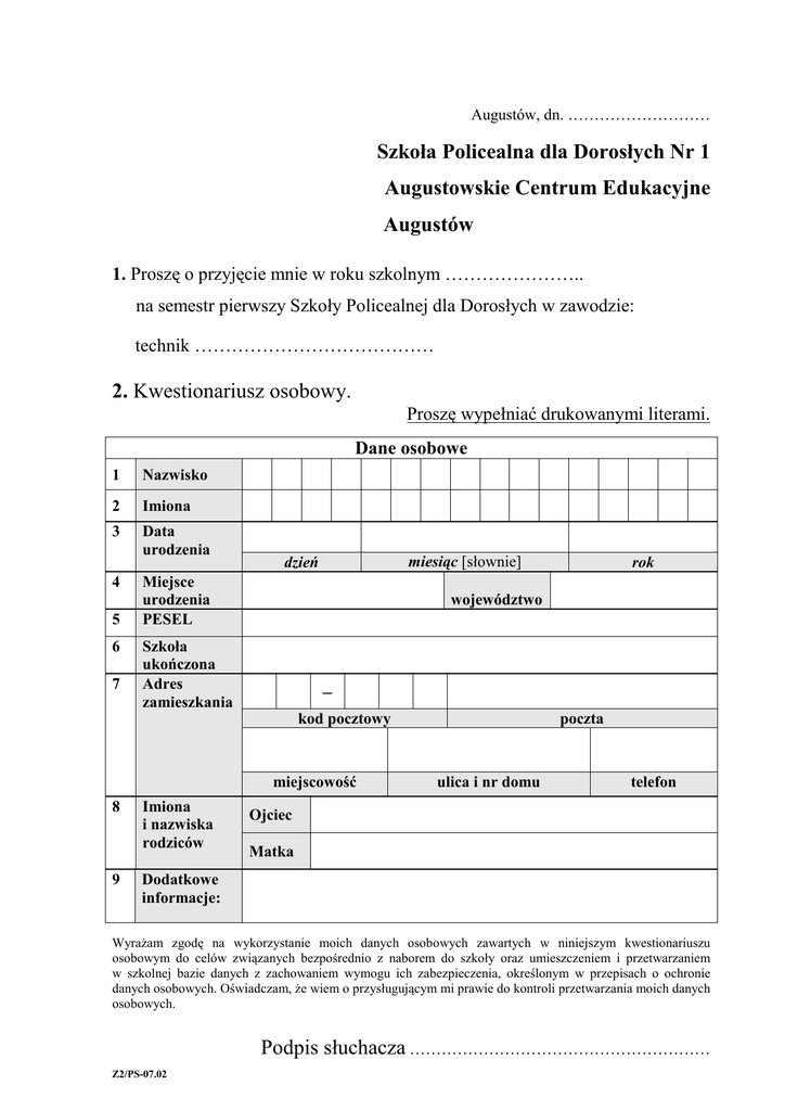 Augustów, dn. ……………………… Szkoła Policealna dla Dorosłych Nr 1 Augustowskie Centrum Edukacyjne Augustów 1. Proszę o przyjęcie mnie w roku szkolnym ………………….. na semestr pierwszy Szkoły Policealnej dla Dorosłych w zawodzie: technik ………………………………… 2. Kwestionariusz osobowy. Proszę wypełniać drukowanymi literami. Dane osobowe 1 Nazwisko 2 Imiona 3 Data urodzenia 4 5 6 7 miesiąc [słownie] dzień Miejsce urodzenia PESEL województwo Szkoła ukończona Adres zamieszkania – kod pocztowy miejscowość 8 9 Imiona i nazwiska rodziców rok poczta ulica i nr domu telefon Ojciec Matka Dodatkowe informacje: Wyrażam zgodę na wykorzystanie moich danych osobowych zawartych w niniejszym kwestionariuszu osobowym do celów związanych bezpośrednio z naborem do szkoły oraz umieszczeniem i przetwarzaniem w szkolnej bazie danych z zachowaniem wymogu ich zabezpieczenia, określonym w przepisach o ochronie danych osobowych. Oświadczam, że wiem o przysługującym mi prawie do kontroli przetwarzania moich danych osobowych. Podpis słuchacza ………………………………………………… Z2/PS-07.02