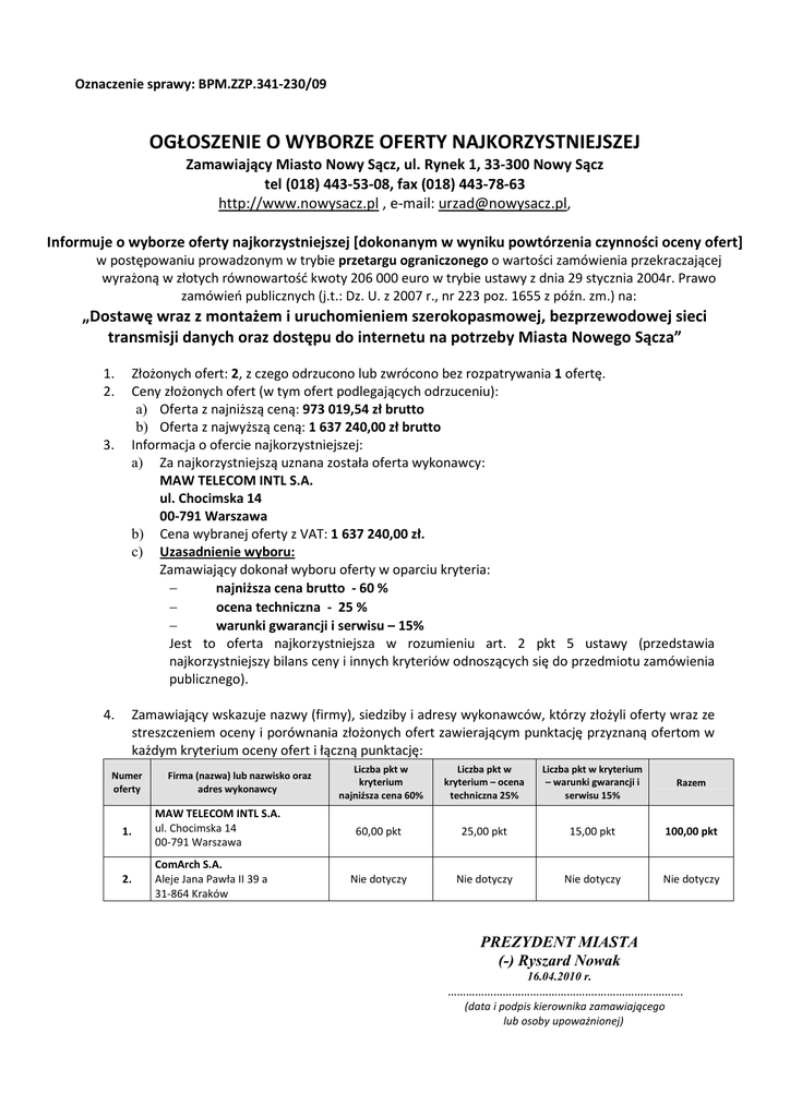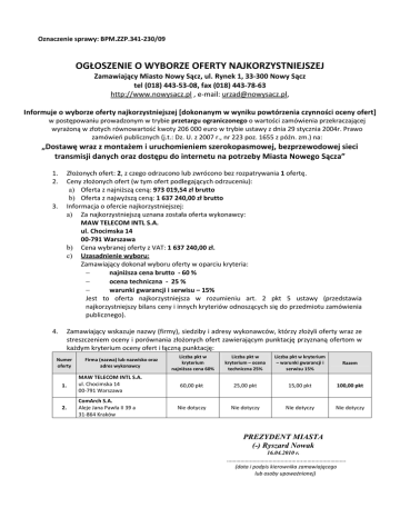 Oznaczenie sprawy: BPM.ZZP.341-230/09 OGŁOSZENIE O WYBORZE OFERTY NAJKORZYSTNIEJSZEJ Zamawiający Miasto Nowy Sącz, ul. Rynek 1, 33-300 Nowy Sącz tel (018) 443-53-08, fax (018) 443-78-63 http://www.nowysacz.pl , e-mail: [email protected], Informuje o wyborze oferty najkorzystniejszej [dokonanym w wyniku powtórzenia czynności oceny ofert] w postępowaniu prowadzonym w trybie przetargu ograniczonego o wartości zamówienia przekraczającej wyrażoną w złotych równowartość kwoty 206 000 euro w trybie ustawy z dnia 29 stycznia 2004r. Prawo zamówień publicznych (j.t.: Dz. U. z 2007 r., nr 223 poz. 1655 z późn. zm.) na: „Dostawę wraz z montażem i uruchomieniem szerokopasmowej, bezprzewodowej sieci transmisji danych oraz dostępu do internetu na potrzeby Miasta Nowego Sącza” 1. 2. 3. 4. Złożonych ofert: 2, z czego odrzucono lub zwrócono bez rozpatrywania 1 ofertę. Ceny złożonych ofert (w tym ofert podlegających odrzuceniu): a) Oferta z najniższą ceną: 973 019,54 zł brutto b) Oferta z najwyższą ceną: 1 637 240,00 zł brutto Informacja o ofercie najkorzystniejszej: a) Za najkorzystniejszą uznana została oferta wykonawcy: MAW TELECOM INTL S.A. ul. Chocimska 14 00-791 Warszawa b) Cena wybranej oferty z VAT: 1 637 240,00 zł. c) Uzasadnienie wyboru: Zamawiający dokonał wyboru oferty w oparciu kryteria: − najniższa cena brutto - 60 % − ocena techniczna - 25 % − warunki gwarancji i serwisu – 15% Jest to oferta najkorzystniejsza w rozumieniu art. 2 pkt 5 ustawy (przedstawia najkorzystniejszy bilans ceny i innych kryteriów odnoszących się do przedmiotu zamówienia publicznego). Zamawiający wskazuje nazwy (firmy), siedziby i adresy wykonawców, którzy złożyli oferty wraz ze streszczeniem oceny i porównania złożonych ofert zawierającym punktację przyznaną ofertom w każdym kryterium oceny ofert i łączną punktację: Numer oferty Firma (nazwa) lub nazwisko oraz adres wykonawcy 1. MAW TELECOM INTL S.A. ul. Chocimska 14 00-791 Warszawa 2. ComArch S.A. Aleje Jana Pawła II 39 a 31-864 Kraków Liczba pkt w kryterium najniższa cena 60% Liczba pkt w kryterium – ocena techniczna 25% Liczba pkt w kryterium – warunki gwarancji i serwisu 15% Razem 60,00 pkt 25,00 pkt 15,00 pkt 100,00 pkt Nie dotyczy Nie dotyczy Nie dotyczy Nie dotyczy PREZYDENT MIASTA (-) Ryszard Nowak 16.04.2010 r. ………………………………………….………………………. (data i podpis kierownika zamawiającego lub osoby upoważnionej)