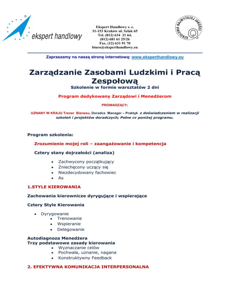 Ekspert Handlowy s. c. 31-153 Kraków ul. Szlak 65 Tel. (012) 634 21 64, (012) 681 61 25/26 Fax. (12) 631 91 70 [email protected] Zapraszamy na naszą stronę internetową: www.eksperthandlowy.eu Zarządzanie Zasobami Ludzkimi i Pracą Zespołową Szkolenie w formie warsztatów 2 dni Program dedykowany Zarządowi i Menedżerom PROWADZĄCY; UZNANY W KRAJU Trener Biznesu, Doradca Manager – Praktyk z doświadczeniem w realizacji szkoleń i projektów doradczych; Pełne cv poniżej programu. Program szkolenia: Zrozumienie mojej roli – zaangażowanie i kompetencja Cztery stany dojrzałości (analiza) Zachwycony początkujący Zniechęcony uczący się Niezdecydowany fachowiec As 1.STYLE KIEROWANIA Zachowania kierownicze dyrygujące i wspierające Cztery Style Kierowania Dyrygowanie Trenowanie Wspieranie Delegowanie Autodiagnoza Menedżera Trzy podstawowe zasady kierowania Wyznaczanie celów Pochwała, uznanie, nagana Konstruktywny Feedback 2. EFEKTYWNA KOMUNIKACJA INTERPERSONALNA Warstwowy model „Mojego Ja” Komunikat TY – Komunikat JA Konstruktywna krytyka - Model FUKO - Warunki przekazywania konstruktywnej krytyki 3. KIEROWANIE A ZARZĄDZANIE Definicja zarządzania i kierowania Podstawowe style w zarządzaniu. Zarządzanie zorientowane na zasoby Zarządzanie zorientowane na procesy Zarządzanie zorientowane na rezultaty Jak pracować ze swoimi podwładnymi, kiedy jaki styl stosować? Trzy obszary działania menedżera Kierowanie skoncentrowane na zadaniu Kierowanie skoncentrowane na zespole Kierowanie skoncentrowane na jednostce 4. ZARZĄDZANIE ZESPOŁEM Definicja zespołu Analiza sił hamujących i napędzających w zespole Skuteczna komunikacja w zespole Podstawowe elementy składające się na skuteczną komunikację w zespole Rola lidera w zespole, a skuteczna komunikacja Prośba, czy polecenie Cztery płaszczyzny kontaktów międzyludzkich – rozwiązywanie problemów Sposób komunikowania problemu Etapy rozwiązywania problemu i podejmowania decyzji Emocje a problem Cztery etapy rozwoju zespołu – charakterystyka, zadania do realizacji 1.Orientacja 2.Niezadowolenie 3.Rozwiązanie 4.Produkcja Zachowania dyrektywne i wspierające w zespole Etapy rozwoju zespołu, a dopasowanie odpowiedniego stylu kierowania Rola lidera w zespole Metodologia szkolenia: Intensywny warsztat (ćwiczenia, case stady, gry), którego podstawą jest uczestnictwo w symulacjach przeplatanych krótkimi komentarzami trenera, moderowanymi przez niego dyskusjami i pracą nad indywidualnymi obszarami rozwoju. Przygotowanie przez uczestników Osobistego Planu Działania w zakresie udoskonalenia własnych umiejętności kierowania sytuacyjnego oraz zarządzania własnym zespołem. PROWADZĄCY: UZNANY W KRAJU Trener Biznesu, Doradca Manager – Praktyk z doświadczeniem w realizacji szkoleń i projektów doradczych; posiada wykształcenie biznesowe (AE w Krakowie – Handel Zagraniczny; Ecole Superieure de Commerce de Rouen – Bankowość i Finanse); zajmowała stanowiska menedżerskie w takich koncernach, jak Auchan Polska, Groupe Andre, PPG, głównie w obszarach zarządzania, sprzedaży i obsługi Klienta; w PPG stworzyła od podstaw nowoczesny i wysoce profesjonalny Dział Obsługi Klienta (telemarketing, zespół ds. reklamacji, zespół ds. szkoleń, zarządzanie programem lojalnościowym, Badania Satysfakcji Klientów i Pracowników i Mystery Shopping), którym zarządzała przez 7 lat. Szkoliła kierownictwo i siły sprzedaży strategicznych Klientów firmy oraz zbudowała wewnętrzny zespół trenerski na najwyższym poziomie; to za jej główną przyczyną firma w roku 2003 otrzymała prestiżową nagrodę nadaną przez Kapitułę Programu organizowanego przez Instytut Zarządzania – godło „Firma Przyjazna Klientowi”; inicjator i lider wielu projektów ogólnofirmowych i wdrożeń biznesowych silnie zorientowanych na rozwój zasobów ludzkich i kultury organizacji oraz doskonalenie jakości i poziomu obsługi Klienta; doświadczenie w obszarach zarządzania, sprzedaży, obsługi Klienta/call center, customer marketingu, komunikacji, budowaniu zespołów, edukacji, psychologii Klienta; członek Komitetu Organizacyjnego Projektu HORYZONT mającego na celu zmianę wizerunku i kultury organizacyjnej firmy zatrudniającej 1 400 pracowników o profilu sprzedażowym i produkcyjnym; licencjonowany i certyfikowany Praktyk Wywierania Wpływu i Perswazji oraz Sztuki NLP; prowadzi z pasją i energią szkolenia menedżerski w wielu branżach; Wybrane z wielu firmy przeszkolone: BOT Kopalnia Węgla Brunatnego Bełchatów, Bonus Eurotech Sp z o.o., CENTROFARB Konin, CHEMIA Gdańsk, Getin Bank, NESTLE WATERS POLSKA S.A. Raiffeizen Bank Polska S.A. Fabryka Farb i Lakierów Śnieżka S.A., Przedsiębiorstwo Farmaceutyczne Jelfa S.A. CENTROFARB Konin i wiele innych.