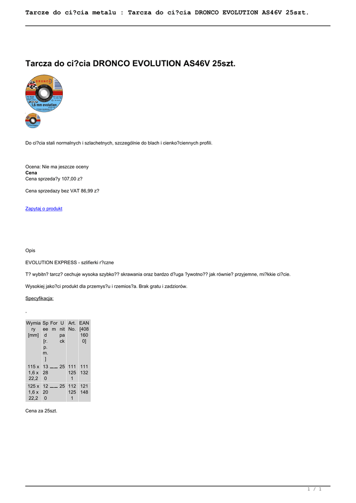 Tarcze do ci?cia metalu : Tarcza do ci?cia DRONCO EVOLUTION AS46V 25szt. Tarcza do ci?cia DRONCO EVOLUTION AS46V 25szt. Do ci?cia stali normalnych i szlachetnych, szczególnie do blach i cienko?ciennych profili. Ocena: Nie ma jeszcze oceny Cena Cena sprzeda?y 107,00 z? Cena sprzedazy bez VAT 86,99 z? Zapytaj o produkt Opis EVOLUTION EXPRESS - szlifierki r?czne T? wybitn? tarcz? cechuje wysoka szybko?? skrawania oraz bardzo d?uga ?ywotno?? jak równie? przyjemne, mi?kkie ci?cie. Wysokiej jako?ci produkt dla przemys?u i rzemios?a. Brak gratu i zadziorów. Specyfikacja: Wymia Sp For U Art. EAN ry ee m nit No. [408 [mm] d pa 160 [r. ck 0] p. m. ] 115 x 13 1,6 x 28 22,2 0 25 111 111 125 132 1 125 x 12 1,6 x 20 22,2 0 25 112 121 125 148 1 Cena za 25szt. 1 / 1 Powered by TCPDF (www.tcpdf.org)