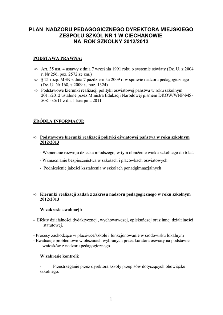 PLAN NADZORU PEDAGOGICZNEGO DYREKTORA MIEJSKIEGO ZESPOŁU SZKÓŁ NR 1 W CIECHANOWIE NA ROK SZKOLNY 2012/2013 PODSTAWA PRAWNA: • • • Art. 35 ust. 4 ustawy z dnia 7 września 1991 roku o systemie oświaty (Dz. U. z 2004 r. Nr 256, poz. 2572 ze zm.) § 21 rozp. MEN z dnia 7 października 2009 r. w sprawie nadzoru pedagogicznego (Dz. U. Nr 168, z 2009 r., poz. 1324) Podstawowe kierunki realizacji polityki oświatowej państwa w roku szkolnym 2011/2012 ustalone przez Ministra Edukacji Narodowej pismem DKOW/WNP-MS5081-35/11 z dn. 11sierpnia 2011 ŹRÓDŁA INFORMACJI: • Podstawowe kierunki realizacji polityki oświatowej państwa w roku szkolnym 2012/2013 - Wspieranie rozwoju dziecka młodszego, w tym obniżenie wieku szkolnego do 6 lat. - Wzmacnianie bezpieczeństwa w szkołach i placówkach oświatowych - Podniesienie jakości kształcenia w szkołach ponadgimnazjalnych • Kierunki realizacji zadań z zakresu nadzoru pedagogicznego w roku szkolnym 2012/2013 W zakresie ewaluacji: - Efekty działalności dydaktycznej , wychowawczej, opiekuńczej oraz innej działalności statutowej. - Procesy zachodzące w placówce/szkole i funkcjonowanie w środowisku lokalnym - Ewaluacje problemowe w obszarach wybranych przez kuratora oświaty na podstawie wniosków z nadzoru pedagogicznego W zakresie kontroli: Przestrzeganie przez dyrektora szkoły przepisów dotyczących obowiązku szkolnego. 1 - Zgodność z przepisami prawa organizacji pracy świetlicy szkolnej zorganizowanej w publicznej szkole podstawowej. - Zgodność organizacji zajęć edukacyjnych z języków obcych nowożytnych z ramowymi planami nauczania w publicznych gimnazjach. - Prawidłowość organizacji oddziału przedszkolnego. - Organizacja zajęć rewalidacyjnych , w tym liczba godzin i rodzaj tych zajęć oraz ich zgodność za zaleceniami zawartymi w orzeczeniu o potrzebie kształcenia specjalnego z uwagi na niepełnosprawność w szkole ogólnodostępnej. - Organizacja i realizacja zajęć rewalidacyjno-wychowawczych w publicznych przedszkolach, szkołach podstawowych, gimnazjach. • • Plan nadzoru pedagogicznego Mazowieckiego Kuratora Oświaty na rok szkolny 2012/2013 ( załącznik) Wnioski z nadzoru pedagogicznego za rok szkolny 2011/2012 (kuratora oświaty i dyrektora szkoły) - kuratora oświaty - dyrektora szkoły)- ( zał. raport z nadzoru r. szk. 2011/ 12) 2 I. EWALUACJA WEWNĘTRZNA 1. Celem zaplanowanych ewaluacji wewnętrznych jest: - zebranie informacji, czy w szkole analizuje się podejmowane działania wychowawcze, czy ocenia się ich skuteczność oraz modyfikuje w razie potrzeb(1.4), - zebranie informacji czy nauczyciele wspomagają siebie nawzajem o organizowaniu i realizacji procesów edukacyjnych (4.1). 2. Harmonogram zaplanowanych ewaluacji Tematyka/Przedmiot ewaluacji 1.4. Respektowane są normy społeczne Wymagania wg harmonogramu prac zespołu ds. ewaluacji 2.4. Procesy edukacyjne są efektem współdziałania nauczycieli. 2. Procesy zachodzące w szkole 1. Efekty działalności dydaktycznej, wychowawczej i opiekuńczej oraz innej działalności statutowej szkoły Obszar ewaluacji wg harmonogramu prac zespołu ds. ewaluacji Termin zakończenia ewaluacji Odpowiedzialni Czerwiec 2013 p.Kaczerska p. Cichocka p. Sadowska A. p. Jaroszewska p. Kącka Czerwiec 2013 p.Kaczerska p. Cichocka p.Sadowska A. p. Jaroszewska p. Kącka 3 II. KONTROLA Plan kontroli L.p. Tematyka kontroli Nauczyciele, których kontrola dotyczy Terminy Forma kontroli Nauczyciele uczący w kl. I – III, IV SP i I - III Gim. Nauczyciele uczący w kl. V VI Do końca września Analiza planów pracy nauczycieli Do końca września Analiza planów pracy nauczycieli 1. Planowanie pracy dydaktycznej zgodnie z założeniami nowej podstawy programowej 2. Planowanie pracy dydaktycznej zgodnie z założeniami starej podstawy programowej 3. Realizacja zaleceń PPP dla uczniów o specjalnych potrzebach edukacyjnych Wszyscy nauczyciele uczący uczniów o specjalnych potrzebach edukacyjnych Wrzesień Grudzień Marzec Maj Analiza planów pracy nauczycieli, obserwacja zajęć 4. Realizacja godzin z art. 42 ust. 2 pkt 2 ustawy KN Wszyscy nauczyciele Raz w miesiącu Analiza prowadzonej dokumentacji, obserwacja zajęć 5. Monitorowanie wdrażania podstawy programowej kształcenia ogólnego w kl. I - III Gim. oraz I - III , IVSP Nauczyciele klas I – III , IV SP i Gim. 2 razy w roku; podczas obserwacji zajęć Analiza prowadzonej dokumentacji, rozmowa, sprawozdanie 6. Przestrzeganie zasad oceniania zawartych w Statucie szkoły Wytypowani nauczyciele Listopad Styczeń Marzec Czerwiec Analiza prowadzonej dokumentacji, rozmowa Dwa razy w Analiza prowadzonej 7. Sposób prowadzenia dokumentacji przebiegu nauczania Wszyscy nauczyciele 4 8. Pełnienie dyżurów przez nauczycieli Wszyscy nauczyciele III. semestrze dokumentacji W miarę potrzeb obserwacja SZKOLENIA I NARADY DLA NAUCZYCIELI TEMATYKA SZKOLEŃ NAUCZYCIELI SZKOŁY /PLACÓWKI Termin: Osoba odpowiedzialna za realizację Tematyka szkolenia: Forma szkolenia: Odbiorca szkolenia: 1.Poradnictwo zawodowe w szkole Szkolenie rady Rada pedagogiczna gimnazjum listopad Milena Załuska - pracownik PPP 2.Jak sobie radzić z prowokacją uczniowską 3.Wpływ deficytów rozwojowych na naukę poszczególnych przedmiotów 4.Stymulacja psychoruchowego rozwoju dzieci 6-8 letnich 5. Skuteczne formy promocji szkoły. 6l.Metody efektywnego uczenia się ( narzędzia TOC) w prasy dydaktycznej. Szkolenie rady n-le SP - 3 i G - 2 paździer nik Szkolenie rady n-le SP - 3 klas IV - VI listopad Wiesława Machul pracownik PPP Wiesława Machul pracownik PPP warsztaty n-le SP – 3 klas I - III grudzień Wiesława Machul pracownik PPP szkolenie Rada ped. SP 3 Gim 2 marzec MSCDN Szkolenie n- le SP 3 marzec MSCDN TEMATYKA I TERMINARZ POSIEDZEŃ RADY PEGAGOGICZNEJ W ROKU SZKOLNYM 2011/2012 Lp. 1 Termin 30.08.12 2 17.09.12 Tematyka Organizacja nowego roku szkolnego 2012/2013 Zaopiniowanie planu nadzoru pedagogicznego Przygotowujący Odpowi