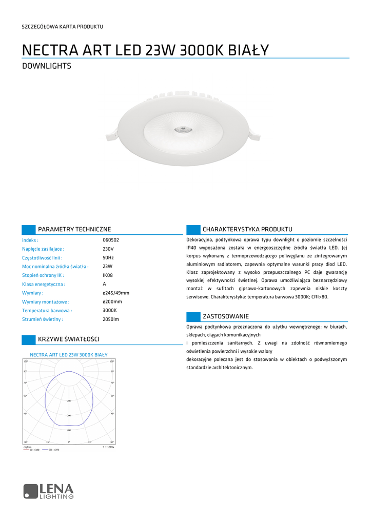 SZCZEGÓŁOWA KARTA PRODUKTU NECTRA ART LED 23W 3000K BIAŁY DOWNLIGHTS PARAMETRY TECHNICZNE CHARAKTERYSTYKA PRODUKTU indeks : 060502 Dekoracyjna, podtynkowa oprawa typu downlight o poziomie szczelności Napięcie zasilajace : 230V IP40 wyposażona została w energooszczędne źródła światła LED. Jej Częstotliwość linii : 50Hz korpus wykonany z termoprzewodzącego poliwęglanu ze zintegrowanym Moc nominalna źródła światła : 23W aluminiowym radiatorem, zapewnia optymalne warunki pracy diod LED. Stopień ochrony IK : IK08 Klasa energetyczna : A Wymiary : ø245/49mm Wymiary montażowe : ø200mm Temperatura barwowa : 3000K Strumień świetlny : 2050lm Klosz zaprojektowany z wysoko przepuszczalnego PC daje gwarancję wysokiej efektywności świetlnej. Oprawa umożliwiająca beznarzędziowy montaż w sufitach gipsowo-kartonowych zapewnia niskie koszty serwisowe. Charakterystyka: temperatura barwowa 3000K; CRI>80. ZASTOSOWANIE Oprawa podtynkowa przeznaczona do użytku wewnętrznego: w biurach, KRZYWE ŚWIATŁOŚCI NECTRA ART LED 23W 3000K BIAŁY sklepach, ciągach komunikacyjnych i pomieszczenia sanitarnych. Z uwagi na zdolność równomiernego oświetlenia powierzchni i wysokie walory dekoracyjne polecana jest do stosowania w obiektach o podwyższonym standardzie architektonicznym. SZCZEGÓŁOWA KARTA PRODUKTU NECTRA ART LED 23W 3000K BIAŁY DOWNLIGHTS TABELA PARAMETRÓW TECHNICZNYCH indeks: 060502 Napięcie zasilajace: 230V Częstotliwość linii: 50Hz Moc nominalna źródła światła: 23W Stopień ochrony IK: IK08 Stopień ochrony IP: IP40 Skuteczność świetlna: 89lm/W Klasa energetyczna: A Klasa ochrony: II Wymiary: ø245/49mm Wymiary montażowe: ø200mm Waga: 0,65kg Materiał korpusu: PC, Aluminium Temperatura barwowa: 3000K Sposób montażu: Podtynkowy Kolor: Biały Temperatura pracy oprawy: -17°C +35°C Strumień świetlny: 2050lm Kod EAN: 5905963060502 Oznaczenie CE: Tak Materiał klosza: PC Rodzaj klosza: Przezroczysty Źródło światła: LED Data aktualizacji karty: 2016-08-17 47/2015 www.lenalighting.pl | Strona 2