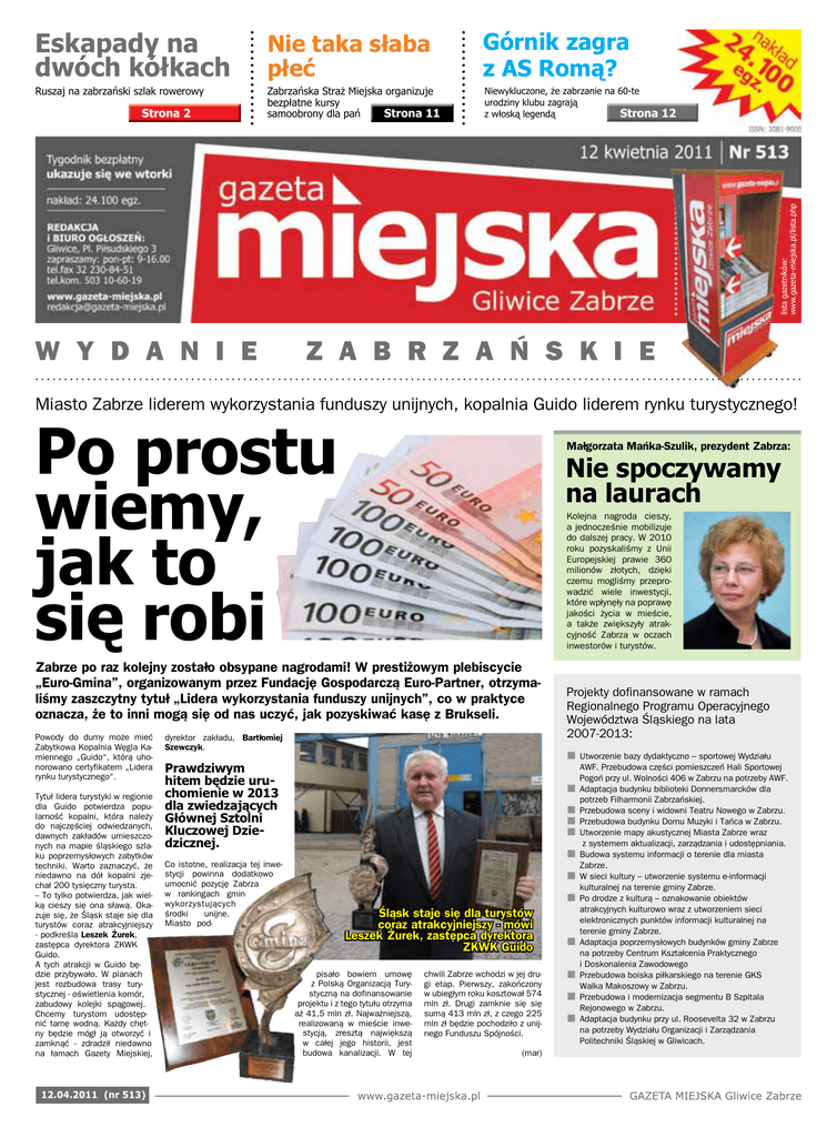 Zabrzańska Straż Miejska organizuje bezpłatne kursy Strona 11 samoobrony dla pań Górnik zagra z AS Romą? Niewykluczone, że zabrzanie na 60-te urodziny klubu zagrają Strona z włoską legendą 12 lista gazetników: www.gazeta-miejska.pl/lista.php Strona 2 Nie taka słaba płeć ............... Ruszaj na zabrzański szlak rowerowy ............... Eskapady na dwóch kółkach W Y D A N I E Z A B R Z A Ń S K I E ..................................................................................................................................... Miasto Zabrze liderem wykorzystania funduszy unijnych, kopalnia Guido liderem rynku turystycznego! Po prostu wiemy, jak to się robi Małgorzata Mańka-Szulik, prezydent Zabrza: Nie spoczywamy na laurach Kolejna nagroda cieszy, a jednocześnie mobilizuje do dalszej pracy. W 2010 roku pozyskaliśmy z Unii Europejskiej prawie 360 milionów złotych, dzięki czemu mogliśmy przeprowadzić wiele inwestycji, które wpłynęły na poprawę jakości życia w mieście, a także zwiększyły atrakcyjność Zabrza w oczach inwestorów i turystów. Zabrze po raz kolejny zostało obsypane nagrodami! W prestiżowym plebiscycie „Euro-Gmina”, organizowanym przez Fundację Gospodarczą Euro-Partner, otrzymaliśmy zaszczytny tytuł „Lidera wykorzystania funduszy unijnych”, co w praktyce oznacza, że to inni mogą się od nas uczyć, jak pozyskiwać kasę z Brukseli. Powody do dumy może mieć Zabytkowa Kopalnia Węgla Kamiennego „Guido“, którą uhonorowano certyfikatem „Lidera rynku turystycznego“. Tytuł lidera turystyki w regionie dla Guido potwierdza popularność kopalni, która należy do najczęściej odwiedzanych, dawnych zakładów umieszczonych na mapie śląskiego szlaku poprzemysłowych zabytków techniki. Warto zaznaczyć, że niedawno na dół kopalni zjechał 200 tysięczny turysta. -- To tylko potwierdza, jak wielką cieszy się ona sławą. Okazuje się, że Śląsk staje się dla turystów coraz atrakcyjniejszy - podkreśla Leszek Żurek, zastępca dyrektora ZKWK Guido. A tych atrakcji w Guido będzie przybywało. W planach jest rozbudowa trasy turystycznej - oświetlenia komór, zabudowy kolejki spągowej. Chcemy turystom udostępnić tamę wodną. Każdy chętny będzie mógł ją otworzyć i zamknąć - zdradził niedawno na łamach Gazety Miejskiej, dyrektor zakładu, Bartłomiej Szewczyk. ■ Utworzenie bazy dydaktyczno – sportowej Wydziału Prawdziwym hitem będzie uruchomienie w 2013 dla zwiedzających Głównej Sztolni Kluczowej Dziedzicznej. Co istotne, realizacja tej inwestycji powinna dodatkowo umocnić pozycję Zabrza w rankingach gmin wykorzystujących środki unijne. Miasto pod- Projekty dofinansowane w ramach Regionalnego Programu Operacyjnego Województwa Śląskiego na lata 2007-2013: Śląsk staje się dla turystów coraz atrakcyjniejszy - mówi Leszek Żurek, zastępca dyrektora ZKWK Guido pisało bowiem umowę z Polską Organizacją Turystyczną na dofinansowanie projektu i z tego tytułu otrzyma aż 41,5 mln zł. Najważniejszą, realizowaną w mieście inwestycją, zresztą największą w całej jego historii, jest budowa kanalizacji. W tej chwili Zabrze wchodzi w jej drugi etap. Pierwszy, zakończony w ubiegłym roku kosztował 574 mln zł. Drugi zamknie się się sumą 413 mln zł, z czego 225 mln zł będzie pochodziło z unijnego Funduszu Spójności. (mar) ■ ■ ■ ■ ■ ■ ■ ■ ■ ■ ■ AWF. Przebudowa części pomieszczeń Hali Sportowej Pogoń przy ul. Wolności 406 w Zabrzu na potrzeby AWF. Adaptacja budynku biblioteki Donnersmarcków dla potrzeb Filharmonii Zabrzańskiej. Przebudowa sceny i widowni Teatru Nowego w Zabrzu. Przebudowa budynku Domu Muzyki i Tańca w Zabrzu. Utworzenie mapy akustycznej Miasta Zabrze wraz z systemem aktualizacji, zarządzania i udostępniania. Budowa systemu informacji o terenie dla miasta Zabrze. W sieci kultury – utworzenie systemu e-informacji kulturalnej na terenie gminy Zabrze. Po drodze z kulturą – oznakowanie obiektów atrakcyjnych kulturowo wraz z utworzeniem sieci elektronicznych punktów informacji kulturalnej na terenie gminy Zabrze. Adaptacja poprzemysłowych budynków gminy Zabrze na potrzeby Centrum Kształcenia Praktycznego i Doskonalenia Zawodowego Przebudowa boiska piłkarskiego na terenie GKS Walka Makoszowy w Zabrzu. Przebudowa i modernizacja segmentu B Szpitala Rejonowego w Zabrzu. Adaptacja budynku przy ul. Roosevelta 32 w Zabrzu na potrzeby Wydziału Organizacji i Zarządzania Politechniki Śląskiej w Gliwicach.
