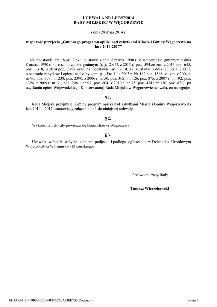 UCHWAŁA NR LII/397/2014 RADY MIEJSKIEJ W WĘGORZEWIE z dnia 28 maja 2014 r. w sprawie przyjęcia „Gminnego programu opieki nad zabytkami Miasta i Gminy Węgorzewo na lata 2014-2017” Na podstawie art. 18 ust. 2 pkt. 6 ustawy z dnia 8 marca 1990 r. o samorządzie gminnym z dnia 8 marca 1990 roku o samorządzie gminnym (t. j. Dz. U. z 2013 r. poz. 594 ze zm. z 2013 poz. 645, poz. 1318, z 2014 poz. 379) oraz na podstawie art. 87 ust. 3 i 4 ustawy z dnia 23 lipca 2003 r. o ochronie zabytków i opiece nad zabytkami (t. j Dz. U. z 2003 r. Nr 162 poz. 1568, ze zm. z 2004 r. nr 96, poz. 959 i nr 238, poz. 2390, z 2006 r. nr 50, poz. 362 i nr 126, poz. 875, z 2007 r. nr 192, poz. 1394, z 2009 r. nr 31, poz. 206. i nr 97, poz. 804, z 2010 r. nr 75, poz. 474 i nr 130, poz. 871), po uzyskaniu opinii Wojewódzkiego Konserwatora) Rada Miejska w Węgorzewie uchwala, co następuje: § 1. Rada Miejska przyjmuje „Gminy program opieki nad zabytkami Miasta i Gminy Węgorzewo na lata 2014 – 2017” stanowiący załącznik nr 1 do niniejszej uchwały. § 2. Wykonanie uchwały powierza się Burmistrzowi Węgorzewa. § 3. Uchwała wchodzi w życie z dniem podjęcia i podlega ogłoszeniu w Dzienniku Urzędowym Województwa Warmińsko - Mazurskiego. Przewodniczący Rady Tomasz Wierzchowski Id: 3AA6119F-F9B5-4BEE-94FE-6C7EA99EE7D5. Podpisany Strona 1 Załącznik Nr 1 do Uchwały Nr LII/397/2014 Rady Miejskiej w Węgorzewie z dnia 28 maja 2014 r. PROGRAM OPIEKI NAD ZABYTKAMI MIASTA I GMINY WĘGORZEWO 2014-2017 Węgorzewo 2014 SPIS TREŚCI I. Wprowadzenie s. 5 II. Uregulowania formalno – prawne s. 6-12 1 Id: 3AA6119F-F9B5-4BEE-94FE-6C7EA99EE7D5. Podpisany Strona 1 II.1. Prawo samorządowe s. 6 II.2. Prawo w zakresie ochrony zabytków i opieki nad zabytkami s. 6-12 II.2.1. Wybrane przepisy ogólne oraz formy i sposoby ochrony zabytków i opieki nad zabytkami s. 6-9 II.2.2. Organy ochrony zabytków s. 9-11 II.2.3. Podstawy prawne sporządzania i główne cele gminnego programu opieki III. Założenia zawarte w strategicznych dokumentach wykorzystane do opracowywania programu opieki nad zabytkami III.1. s. 12 s. 13-23 Założenia wynikające z tez do krajowego i wojewódzkiego programu ochrony zabytków i opieki nad zabytkami s. 13-16 III.2. Założenia zawarte w Narodowej Strategii Kultury na lata 2004-2020 s.16-17 III.3. Program opieki nad zabytkami a Plan Zagospodarowania Przestrzennego Województwa Warmińsko-Mazurskiego oraz Strategia Rozwoju Województwa Warmińsko-Mazurskiego s. 18-20 III.4. Program opieki nad zabytkami a akty prawa miejscowego s.20-23 IV. Chronione zabytki Miasta i Gminy Węgorzewo s. 23-28 IV.1. Zabytki wpisane do Rejestru Zabytków Województwa Warmińsko- s. 23-27 Mazurskiego IV.1.1. Rejestr zabytków nieruchomych. s.25-26 IV.1.2. Rejestr zabytków ruchomych. s. 27 IV.1.3. Rejestr zabytków archeologicznych s. 27 IV.2. Zabytki wpisane do Gminnej Ewidencji Zabytków s. 27-28 IV.3 Placówki muzealne s.29-32 IV.3.1 Działalność placówek. Zabytki ruchome w zbiorach muzealnych …s. 29-31 IV.3.1.1. Działalność i zasoby Muzeum Kultury Ludowej w Węgorzewie …s. 29-31 IV.3.1.2. Społeczne Mazurskie Muzeum Kolejnictwa w Węgorzewie Fundacji IV.4. „Dziedzictwo Nasze”. s. 31-32 Ochrona krajobrazu kulturowego miasta i gminy w dokumentach s. 32-33 prawa miejscowego V. Charakterystyka zasobów kulturowych miasta i gminy. s. 33-54 V.1. Rys historyczny s. 33-44 V.1.1. Pradzieje. s. 33-34 V.1.2. Osadnictwo na terenie gminy w XIII-XIV wieku. s. 35-37 V.1.3. Przemiany w XVII-XVIII wieku. s. 37-39 V.1.4. Wiek XIX. s.39-41 V.1.5. Od I wojny do końca II wojny światowej s. 41-42 V.1.6. Okres od roku 1945 do pocz. XXI w. s. 42-44 V.2. Historyczne układy urbanistyczne s. 44-47 2 Id: 3AA6119F-F9B5-4BEE-94FE-6C7EA99EE7D5. Podpisany Strona 2 V.3. Historyczne układy ruralistyczne s. 47-48 V.4. Charakterystyka zasobu obiektów zabytkowych s. 48-54 VI. Ocena stanu i funkcjonowania środowiska kulturowego s. 54-55 VI.1. Ochrona krajobrazu kulturowego miasta i gminy s. 54 VI.2. Współczesne funkcje obiektów zabytkowych s. 54-55 VI.3. Ocena stanu technicznego obiektów zabytkowych i stanu dokumentacji konserwatorskiej VII. Ocena słabych i mocnych stron mających wpływ na środowisko kulturowe Miasta i Gminy Węgorzewo VIII. s. 55 s. 55-56 Założenia programowe ochrony zabytków Miasta i Gminy Węgorzewo s. 56-59 VIII.1. Główne cele polityki gminnej związanej z opieką i ochroną zabytków s. 56-57 VIII.2. Działania związane z opieką nad zabytkami oraz ochroną krajobrazu kulturowego miasta i gminy VIII.3. s. 58 Działania informacyjne, popularyzacyjne i edukacyjne związane z promocją zabytków i walorów gminnej przestrzeni kulturowej Miasta i Gminy Węgorzewo IX. s.59 Realizacja i finansowanie przez miasto i gminę zadań z zakresu ochrony zabytków. s. 59-60 X. Zadania miasta i gminy związane z konserwacją zieleni zabytkowej s. 60-61 XI. Wykazy zabytków wpisanych do Rejestru Zabytków Województwa s. 62-70 Warmińsko-Mazurskiego TABELA 1.1. MIASTO WĘGORZEWO. WYKAZ ZABYTKÓW NIERUCHOMYCH. REJESTR ZABYTKÓW WOJEWÓDZTWA WARMIŃSKO-MAZUR SKIEGO. TABELA 1.2. TABELA 2.1. TABELA 2.2. TABELA 3.1. TABELA 3.2. GMINA WĘGORZEWO. WYKAZ ZABYTKÓW NIERUCHOMYCH. REJESTR ZABYTKÓW WOJEWÓDZTWA WARMIŃSKO-MAZURSKIEGO. s. 62 s. 63-66 MIASTO WĘGORZEWO. REJESTR ZABYTKÓW STANOWISK s. 66 ARCHEOLOGICZNYCH. s. 66 GMINA WĘGORZEWO. REJESTR ZABYTKÓW STANOWISK ARCHEOLOGICZNYCH. s. 68-69 MIASTO WĘGORZEWO. WYKAZ ZABYTKÓW RUCHOMYCH. REJESTR ZABYTKÓW WOJEWÓDZTWA WARMIŃSKO-MAZURSKIEGO. GMINA WĘGORZEWO. WYKAZ ZABYTKÓW RUCHOMYCH. REJESTR ZABYTKÓW WOJEWÓDZTWA WARMIŃSKO-MAZURSKIEGO. s. 69-70 s. 71-101 XI. Wykazy zabytków ujętych w Gminnej Ewidencji Zabytków. TABELA 4.1. MIASTO WĘGORZEWO. WYKAZ ZABYTKÓW NIERUCHOMYCH. GMINNA EWIDENCJA ZABYTKÓW. s.71-74 GMINA WĘGORZEWO. WYKAZ ZABYTKÓW NIERUCHOMYCH GMINNEJ EWIDENCJI ZABYTKÓW. s. 75-86 TABELA 4.2. TABELA 5.1. MIASTO WĘGORZEWO. WYKAZ STANOWISK ARCH