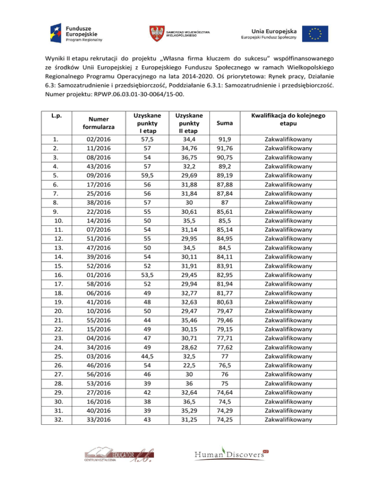 Wyniki II etapu rekrutacji do projektu „Własna firma kluczem do sukcesu” współfinansowanego ze środków Unii Europejskiej z Europejskiego Funduszu Społecznego w ramach Wielkopolskiego Regionalnego Programu Operacyjnego na lata 2014-2020. Oś priorytetowa: Rynek pracy, Działanie 6.3: Samozatrudnienie i przedsiębiorczość, Poddziałanie 6.3.1: Samozatrudnienie i przedsiębiorczość. Numer projektu: RPWP.06.03.01-30-0064/15-00. L.p. 1. 2. 3. 4. 5. 6. 7. 8. 9. 10. 11. 12. 13. 14. 15. 16. 17. 18. 19. 20. 21. 22. 23. 24. 25. 26. 27. 28. 29. 30. 31. 32. Numer formularza 02/2016 11/2016 08/2016 43/2016 09/2016 17/2016 25/2016 38/2016 22/2016 14/2016 07/2016 51/2016 47/2016 39/2016 52/2016 01/2016 58/2016 06/2016 41/2016 10/2016 55/2016 15/2016 04/2016 34/2016 03/2016 46/2016 56/2016 53/2016 27/2016 16/2016 40/2016 33/2016 Uzyskane punkty I etap 57,5 57 54 57 59,5 56 56 57 55 50 54 55 50 54 52 53,5 52 49 48 50 44 49 47 49 44,5 54 46 39 42 38 39 43 Uzyskane punkty II etap 34,4 34,76 36,75 32,2 29,69 31,88 31,84 30 30,61 35,5 31,14 29,95 34,5 30,11 31,91 29,45 29,94 32,77 32,63 29,47 35,46 30,15 30,71 28,62 32,5 22,5 30 36 32,64 36,5 35,29 31,25 Suma Kwalifikacja do kolejnego etapu 91,9 91,76 90,75 89,2 89,19 87,88 87,84 87 85,61 85,5 85,14 84,95 84,5 84,11 83,91 82,95 81,94 81,77 80,63 79,47 79,46 79,15 77,71 77,62 77 76,5 76 75 74,64 74,5 74,29 74,25 Zakwalifikowany Zakwalifikowany Zakwalifikowany Zakwalifikowany Zakwalifikowany Zakwalifikowany Zakwalifikowany Zakwalifikowany Zakwalifikowany Zakwalifikowany Zakwalifikowany Zakwalifikowany Zakwalifikowany Zakwalifikowany Zakwalifikowany Zakwalifikowany Zakwalifikowany Zakwalifikowany Zakwalifikowany Zakwalifikowany Zakwalifikowany Zakwalifikowany Zakwalifikowany Zakwalifikowany Zakwalifikowany Zakwalifikowany Zakwalifikowany Zakwalifikowany Zakwalifikowany Zakwalifikowany Zakwalifikowany Zakwalifikowany 33. 34. 35. 36. 37. 38. 39. 40. 41. 42. 43. 44. 45. 46. 47. 48. 49. 50. 51. 52. 53. 54. 55. 56. 57. 58. 59. 60. 37/2016 50/2016 35/2016 31/2016 24/2016 18/2016 19/2016 12/2016 44/2016 57/2016 30/2016 26/2016 23/2016 45/2016 48/2016 60/2016 59/2016 29/2016 05/2016 28/2016 21/2016 54/2016 36/2016 32/2016 42/2016 20/2016 49/2016 13/2016 44 46 44 44 38 39 42 36 38 44 40 41 44 48 42 39 39 41 37 41 37 39 38 53 47 54 58 54 30,2 28,2 29,62 29,42 35,22 34,09 31,02 36,5 34,43 28,27 32,16 25,73 21,61 17,13 22,5 25 23 20,97 23,56 19,55 22,72 18,81 18,5 31,24 26,52 18,13 14,1 17 74,2 74,2 73,62 73,42 73,22 73,09 73,02 72,5 72,43 72,27 72,16 66,73 65,61 65,13 64,5 64 62 61,97 60,56 60,55 59,72 57,81 56,5 84,24 73,52 72,13 72,10 71 Zakwalifikowany Zakwalifikowany Zakwalifikowany Zakwalifikowany Zakwalifikowany Zakwalifikowany Zakwalifikowany Zakwalifikowany Zakwalifikowany Zakwalifikowany Zakwalifikowany Zakwalifikowany Niezakwalifikowany Niezakwalifikowany Niezakwalifikowany Niezakwalifikowany Niezakwalifikowany Niezakwalifikowany Niezakwalifikowany Niezakwalifikowany Niezakwalifikowany Niezakwalifikowany Niezakwalifikowany Rezygnacja z projektu Rezygnacja z projektu Rezygnacja z projektu Rezygnacja z projektu Rezygnacja z projektu