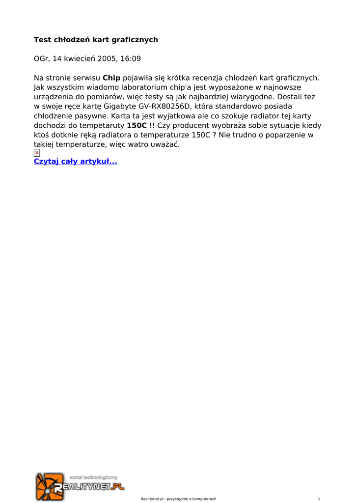 Test chłodzeń kart graficznych OGr, 14 kwiecień 2005, 16:09 Na stronie serwisu Chip pojawiła się krótka recenzja chłodzeń kart graficznych. Jak wszystkim wiadomo laboratorium chip'a jest wyposażone w najnowsze urządzenia do pomiarów, więc testy są jak najbardziej wiarygodne. Dostali też w swoje ręce kartę Gigabyte GV-RX80256D, która standardowo posiada chłodzenie pasywne. Karta ta jest wyjatkowa ale co szokuje radiator tej karty dochodzi do tempetaruty 150C !! Czy producent wyobraża sobie sytuacje kiedy ktoś dotknie ręką radiatora o temperaturze 150C ? Nie trudno o poparzenie w takiej temperaturze, więc watro uważać. Czytaj cały artykuł... Realitynet.pl - przystępnie o komputerach 1