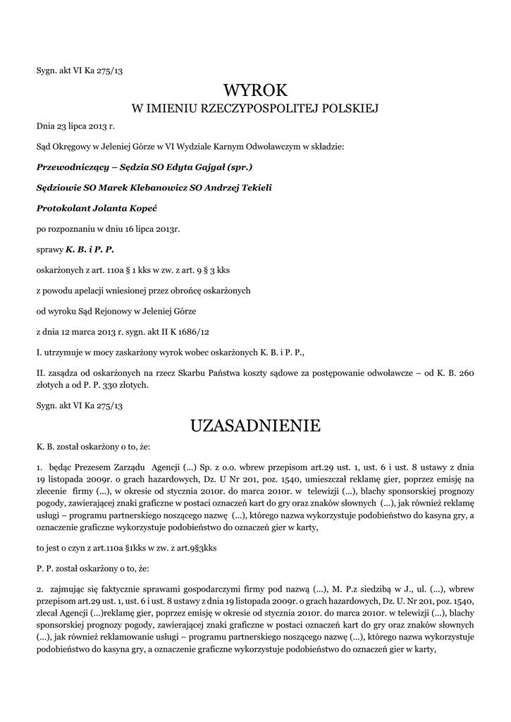 Sygn. akt VI Ka 275/13 WYROK W IMIENIU RZECZYPOSPOLITEJ POLSKIEJ Dnia 23 lipca 2013 r. Sąd Okręgowy w Jeleniej Górze w VI Wydziale Karnym Odwoławczym w składzie: Przewodniczący – Sędzia SO Edyta Gajgał (spr.) Sędziowie SO Marek Klebanowicz SO Andrzej Tekieli Protokolant Jolanta Kopeć po rozpoznaniu w dniu 16 lipca 2013r. sprawy K. B. i P. P. oskarżonych z art. 110a § 1 kks w zw. z art. 9 § 3 kks z powodu apelacji wniesionej przez obrońcę oskarżonych od wyroku Sąd Rejonowy w Jeleniej Górze z dnia 12 marca 2013 r. sygn. akt II K 1686/12 I. utrzymuje w mocy zaskarżony wyrok wobec oskarżonych K. B. i P. P., II. zasądza od oskarżonych na rzecz Skarbu Państwa koszty sądowe za postępowanie odwoławcze – od K. B. 260 złotych a od P. P. 330 złotych. Sygn. akt VI Ka 275/13 UZASADNIENIE K. B. został oskarżony o to, że: 1. będąc Prezesem Zarządu Agencji (...) Sp. z o.o. wbrew przepisom art.29 ust. 1, ust. 6 i ust. 8 ustawy z dnia 19 listopada 2009r. o grach hazardowych, Dz. U Nr 201, poz. 1540, umieszczał reklamę gier, poprzez emisję na zlecenie firmy (...), w okresie od stycznia 2010r. do marca 2010r. w telewizji (...), blachy sponsorskiej prognozy pogody, zawierającej znaki graficzne w postaci oznaczeń kart do gry oraz znaków słownych (...), jak również reklamę usługi – programu partnerskiego noszącego nazwę (...), którego nazwa wykorzystuje podobieństwo do kasyna gry, a oznaczenie graficzne wykorzystuje podobieństwo do oznaczeń gier w karty, to jest o czyn z art.110a §1kks w zw. z art.9§3kks P. P. został oskarżony o to, że: 2. zajmując się faktycznie sprawami gospodarczymi firmy pod nazwą (...), M. P.z siedzibą w J., ul. (...), wbrew przepisom art.29 ust. 1, ust. 6 i ust. 8 ustawy z dnia 19 listopada 2009r. o grach hazardowych, Dz. U. Nr 201, poz. 1540, zlecał Agencji (...)reklamę gier, poprzez emisję w okresie od stycznia 2010r. do marca 2010r. w telewizji (...), blachy sponsorskiej prognozy pogody, zawierającej znaki graficzne w postaci oznaczeń kart do gry oraz znaków słownych (...), jak również reklamowanie usługi – programu partnerskiego noszącego nazwę (...), którego nazwa wykorzystuje podobieństwo do kasyna gry, a oznaczenie graficzne wykorzystuje podobieństwo do oznaczeń gier w karty, to jest o czyn z art.110a §1kks w zw. z art.9§3kks Sąd Rejonowy w Jeleniej Górze wyrokiem z dnia 27 marca 2012r. w sprawie II K 18/12 uniewinnił oskarżonych od popełnienia zarzucanych im czynów, a kosztami postępowania obciążył Skarb Państwa. Sąd Okręgowy w Jeleniej Górze wyrokiem z dnia 14 września 2012r. w sprawie VI Ka 420/1, uwzględniając apelacje wniesione na niekorzyść oskarżonych przez prokuratora oraz Urząd Celny w W. uchylił zaskarżony wyrok w całości i sprawę przekazał do ponownego rozpoznania przez Sąd Rejonowy. Po ponownym rozpoznaniu sprawy Sąd Rejonowy w Jeleniej Górze wyrokiem z dnia 12 marca 2013r. (sygn. akt II K 1686/12): I. uznał oskarżonego K. B. za winnego popełnienia zarzucanego mu czynu z pkt 1 i za to na podstawie art. 110a § 1kks wymierzył mu karę 50 stawek dziennych grzywny, ustalając wysokość jednej stawki dziennej na kwotę 50 zł, II. uznał oskarżonego P. P. za winnego popełnienia zarzucanego mu czynu z pkt 2 i za to na podstawie art.110a § 1kks wymierzył mu karę 40 stawek dziennych grzywny, ustalając wysokość jednej stawki dziennej na kwotę 80 zł, III. na podstawie art.627kpk w zw. z art.113§1kks zasądził od oskarżonych na rzecz Skarbu Państwa koszty sądowe w części po 1/2, w tym na podstawie art.3 ust.1 ustawy z dnia 23 czerwca 1973r. o opłatach w sprawach karnych w zw. z art.21 pkt 1 tej ustawy K. B. wymierzył 250 zł opłaty, zaś P. P. 320 zł opłaty. Wyrok ten zaskarżył w całości obrońca oskarżonych podnosząc niezgodność przepisu art.110a § 1kks z art.2, art.7 w zw. z art.112, art.31 ust.3 oraz z art.42 ust.1 Konstytucji Rzeczypospolitej Polskiej z dnia 2 kwietnia 1997r. oraz powołując się na wynikającą z tego niemożność zastosowania tego przepisu jako podstawy odpowiedzialności karnej oskarżonych, stwierdzonej zaskarżonym wyrokiem skazującym. Na podstawie art.113§1kks w zw. z art.427§1 i 2kpk obrońca zarzucił (niezależnie od nieprawidłowego uznania, że oskarżeni zrealizowali zarzucane im przestępstwo, polegające na reklamie gier hazardowych wbrew przepisom ustawy) oparcie rozstrzygnięcia o odpowiedzialności karnej oskarżonych oraz przypisanie im popełnienia przestępstwa na mocy art.110a § 1kks, który to przepis niezgodny jest z art.31 ust.3 Konstytucji RP i wyrażoną w nim zasadą proporcjonalności, z art.42 ust.1 Konstytucji RP i wyrażoną w nim zasadą dostatecznej określoności przepisu karnego; jak również art.103 ustawy z dnia 19 listopada 2009r. o grach hazardowych, wprowadzający do ustawy z dnia 10 września 1999r. – Kodeks karny skarbowy art. 110a, penalizujący reklamę oraz promocję gier hazardowych, jest niezgodny z art.2 Konstytucji RP i wyrażoną w nim zasadą demokratycznego państwa prawnego, inkorporującą zasadę przyzwoitej legislacji oraz z art.7 Konstytucji RP i wyrażoną w nim zasadą działania organów państwa na podstawie przepisów prawa oraz w granicach przez nieprzewidzianych (zasadą legalizmu) w zw. z art.112 Konstytucji RP. Stawiając powyższe zarzuty obrońca wniósł o zmianę zaskarżonego wyroku przez uniewinnienie obu oskarżonych od zarzucanych im czynów. Sąd Okręgowy zważył, co następuje. Apelacja obrońcy oskarżonych nie zasługuje na uwzględnienie. W złożonej apelacji skarżący kwestionuje zgodność z Konstytucją przepisu art.110a §1kks, stanowiącego materialną podstawę przyjętej w zaskarżonym wyroku odpowiedzialności oskarżonych za zarzucane im czyny. W uzasadnieniu skargi apelacyjnej wywodzi o niekonstytucyjności tego przepisu na kilku płaszczyznach. Pierwszej, która związana z jest z trybem uchwalania ustawy z 