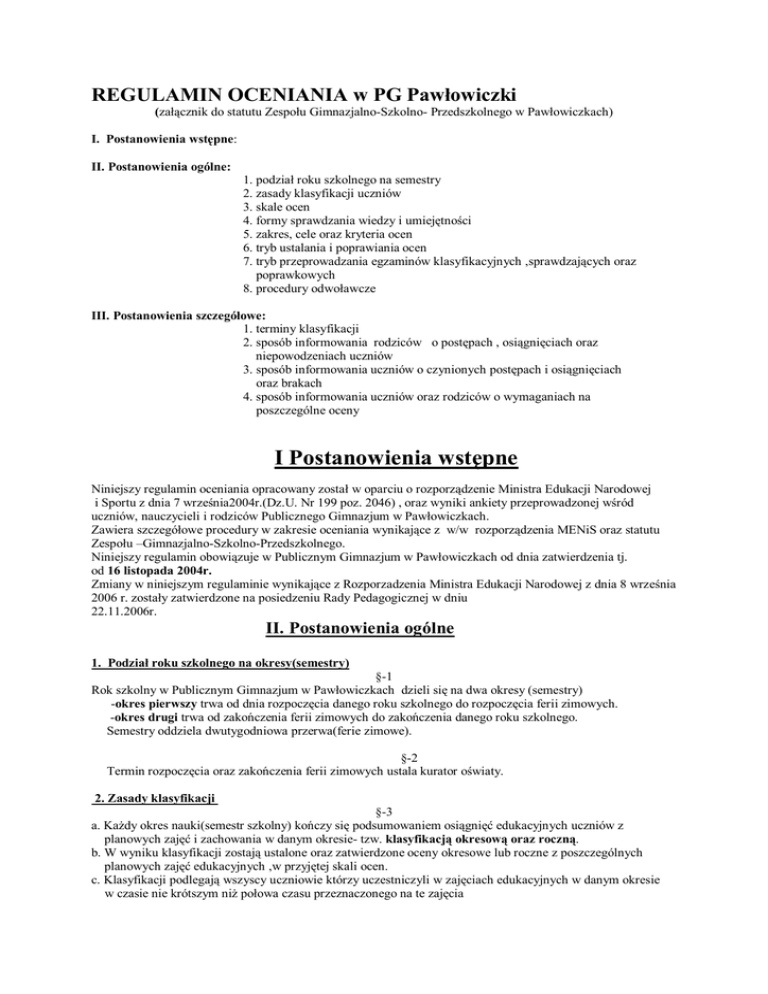 REGULAMIN OCENIANIA w PG Pawłowiczki (załącznik do statutu Zespołu Gimnazjalno-Szkolno- Przedszkolnego w Pawłowiczkach) I. Postanowienia wstępne: II. Postanowienia ogólne: 1. podział roku szkolnego na semestry 2. zasady klasyfikacji uczniów 3. skale ocen 4. formy sprawdzania wiedzy i umiejętności 5. zakres, cele oraz kryteria ocen 6. tryb ustalania i poprawiania ocen 7. tryb przeprowadzania egzaminów klasyfikacyjnych ,sprawdzających oraz poprawkowych 8. procedury odwoławcze III. Postanowienia szczegółowe: 1. terminy klasyfikacji 2. sposób informowania rodziców o postępach , osiągnięciach oraz niepowodzeniach uczniów 3. sposób informowania uczniów o czynionych postępach i osiągnięciach oraz brakach 4. sposób informowania uczniów oraz rodziców o wymaganiach na poszczególne oceny I Postanowienia wstępne Niniejszy regulamin oceniania opracowany został w oparciu o rozporządzenie Ministra Edukacji Narodowej i Sportu z dnia 7 września2004r.(Dz.U. Nr 199 poz. 2046) , oraz wyniki ankiety przeprowadzonej wśród uczniów, nauczycieli i rodziców Publicznego Gimnazjum w Pawłowiczkach. Zawiera szczegółowe procedury w zakresie oceniania wynikające z w/w rozporządzenia MENiS oraz statutu Zespołu –Gimnazjalno-Szkolno-Przedszkolnego. Niniejszy regulamin obowiązuje w Publicznym Gimnazjum w Pawłowiczkach od dnia zatwierdzenia tj. od 16 listopada 2004r. Zmiany w niniejszym regulaminie wynikające z Rozporzadzenia Ministra Edukacji Narodowej z dnia 8 września 2006 r. zostały zatwierdzone na posiedzeniu Rady Pedagogicznej w dniu 22.11.2006r. II. Postanowienia ogólne 1. Podział roku szkolnego na okresy(semestry) §-1 Rok szkolny w Publicznym Gimnazjum w Pawłowiczkach dzieli się na dwa okresy (semestry) -okres pierwszy trwa od dnia rozpoczęcia danego roku szkolnego do rozpoczęcia ferii zimowych. -okres drugi trwa od zakończenia ferii zimowych do zakończenia danego roku szkolnego. Semestry oddziela dwutygodniowa przerwa(ferie zimowe). §-2 Termin rozpoczęcia oraz zakończenia ferii zimowych ustala kurator oświaty. 2. Zasady klasyfikacji §-3 a. Każdy okres nauki(semestr szkolny) kończy się podsumowaniem osiągnięć edukacyjnych uczniów z planowych zajęć i zachowania w danym okresie- tzw. klasyfikacją okresową oraz roczną. b. W wyniku klasyfikacji zostają ustalone oraz zatwierdzone oceny okresowe lub roczne z poszczególnych planowych zajęć edukacyjnych ,w przyjętej skali ocen. c. Klasyfikacji podlegają wszyscy uczniowie którzy uczestniczyli w zajęciach edukacyjnych w danym okresie w czasie nie krótszym niż połowa czasu przeznaczonego na te zajęcia d. Uczniowie dla których z powodu usprawiedliwionej nieobecności, brak jest podstaw do ustalenia oceny klasyfikacyjnej z jednego, kilku lub wszystkich zajęć mogą zdawać egzamin klasyfikacyjny. e. Uczniowie dla których nie ustalono ocen klasyfikacyjnych z powodu nieusprawiedliwionej nieobecności trwającej nie mniej niż połowa czasu przeznaczonego na te zajęcia Rada Pedagogiczna może wyrazić zgodę na egzamin klasyfikacyjny. f. Tryb ,warunki oraz terminy przeprowadzania egzaminów klasyfikacyjnych określa pkt.7w cz.II niniejszego regulaminu. 3. Skala ocen §-4 Osiągnięcia edukacyjne uczniów Publicznego Gimnazjum w Pawłowiczkach wyrażają oceny bieżące (cząstkowe), okresowe oraz roczne. §-5 Oceny bieżące oraz okresowe(semestralne) wyrażają stopnie szkolne wg następującej skali: stopień celujący cel 6 stopień bardzo dobry bdb 5 stopień dobry db 4 stopień dostateczny dst 3 stopień dopuszczający dp 2 stopień niedostateczny ndst 1 z możliwością stosowania rozszerzeń o plus(+) oraz minus(-) dla każdego z w/w stopni. §-6 Oceny roczne z planowych zajęć edukacyjnych wyrażają stopnie wg następującej skali: stopień celujący cel 6 stopień dostateczny dst 3 stopień bardzo dobry bdb 5 stopień dopuszczający dp 2 stopień dobry db 4 stopień niedostateczny ndst 1 §-7 Do wyrażenia oceny rocznej nie można stosować rozszerzeń przyjętych dla ocen bieżących oraz semestralnych tj .(+) oraz (-). §-8 Oceny z zachowania wyrażają stopnie wg następującej skali: wzorowe wz poprawne pop bardzo dobre dobre bdb db nieodpowiednie naganne ndp ng 4. Formy sprawdzania osiągnięć §-9 Stopień opanowania przez uczniów wiadomości oraz umiejętności sprawdza się w oparciu o wypowiedzi ustne prace pisemne, ćwiczenia praktyczne tzn. -odpowiedzi ustne na lekcji -prace klasowe -testy -sprawdziany pisemne -ćwiczenia praktyczne -pracę domową §-10 1. Nauczyciel prowadzący określone w planie zajęcia edukacyjne ustala oraz podaje do wiadomości uczniów(rodziców bądź prawnych opiekunów): a. szczegółowe wymagania na poszczególne oceny b. ilość, rodzaj oraz zakres obowiązujących w danym okresie form sprawdzania osiągnięć 1. sposób oraz termin poprawiania otrzymanych ocen bieżących 2. Wychowawca klasy na początku każdego roku szkolnego informuje uczniów oraz ich rodziców (prawnych opiekunów) o warunkach i sposobie oraz kryteriach oceniania zachowania, warunkach i trybie uzyskania wyższej niż przewidywana rocznej oceny klasyfikacyjnej zachowania oraz o skutkach ustalenia uczniowi nagannej rocznej oceny klasyfikacyjnej zachowania. 5. Zakres, cele oraz kryteria ocen §-11 Ocenianie osiągnięć edukacyjnych ucznia polega na rozpoznawaniu przez nauczycieli poziomu oraz postępów w opanowaniu przez ucznia wiadomości i umiejętności w stosunku do wymagań edukacyjnych wynikających z podstawy programowej i realizowanych w szkole programów nauczania uwzględniających tę podstawę jak również na formułowaniu oceny. §-12 Ocenianie ma na celu: a. poinformowanie ucznia o poziomie jego osiągnięć edukacyjnych oraz postępach w tym zakresie b. pomoc w samodzielnym planowaniu swojego rozwoju c. motywowanie do dalszej pracy(nauki) d. dostarczenie rodzicom ucznia oraz nauczycielom informacji o postępach trudnościach oraz specjalnych uzdoln