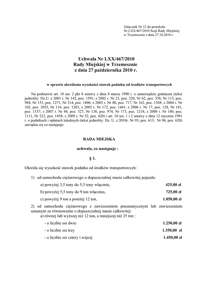 Załącznik Nr 12 do protokołu Nr LXX/467/2010 Sesji Rady Miejskiej w Trzemesznie z dnia 27.10.2010 r. Uchwała Nr LXX/467/2010 Rady Miejskiej w Trzemesznie z dnia 27 października 2010 r. w sprawie określenia wysokości stawek podatku od środków transportowych Na podstawie art. 18 ust. 2 pkt 8 ustawy z dnia 8 marca 1990 r. o samorządzie gminnym (tekst jednolity: Dz.U. z 2001 r. Nr 142, poz. 1591; z 2002 r. Nr 23, poz. 220, Nr 62, poz. 558, Nr 113, poz. 984, Nr 153, poz. 1271, Nr 214, poz. 1806; z 2003 r. Nr 80, poz. 717, Nr 162, poz. 1568; z 2004 r. Nr 102, poz. 1055, Nr 116, poz. 1203, z 2005 r. Nr 172, poz. 1441; z 2006 r. Nr 17, poz. 128, Nr 181, poz. 1337; z 2007 r. Nr 48, poz. 327, Nr 138, poz. 974, Nr 173, poz. 1218; z 2008 r. Nr 180, poz. 1111, Nr 223, poz. 1458; z 2009 r. Nr 52, poz. 420) i art. 10 ust. 1 i 2 ustawy z dnia 12 stycznia 1991 r. o podatkach i opłatach lokalnych (tekst jednolity: Dz. U. z 2010r. Nr 95, poz. 613; Nr 96, poz. 620) zarządza się co następuje: RADA MIEJSKA uchwala, co następuje : § 1. Określa się wysokość stawek podatku od środków transportowych: 1) od samochodu ciężarowego o dopuszczalnej masie całkowitej pojazdu: a) powyżej 3,5 tony do 5,5 tony włącznie, 425,00 zł b) powyżej 5,5 tony do 9 ton włącznie, 725,00 zł c) powyżej 9 ton a poniżej 12 ton, 1.050,00 zł 2) od samochodu ciężarowego z zawieszeniem pneumatycznym lub zawieszeniem uznanym za równoważne o dopuszczalnej masie całkowitej: a) równej lub wyższej niż 12 ton, a mniejszej niż 25 ton : - o liczbie osi dwie 1.250,00 zł - o liczbie osi trzy 1.350,00 zł - o liczbie osi cztery i więcej 1.450,00 zł b) równej lub wyższej niż 25 ton, a mniejszej niż 31 ton: - o liczbie osi dwie 1.550,00 zł - o liczbie osi trzy 1.650,00 zł - o liczbie osi cztery i więcej 1.800,00 zł c) równej lub wyższej niż 31 ton: - bez względu na liczbę osi 2.000,00 zł 3) od samochodu ciężarowego z innym systemem zawieszenia osi jezdnych o dopuszczalnej masie całkowitej: a) równej lub wyższej niż 12 ton, a mniejszej niż 25 ton: - o liczbie osi dwie 1.450,00 zł - o liczbie osi trzy 1.650,00 zł - o liczbie osi cztery i więcej 1.650,00 zł b) równej lub wyższej niż 25 ton, a mniejszej niż 31 ton: - o liczbie osi dwie - o liczbie osi trzy 1.750,00 zł 1.800,00 zł c) równej lub wyższej niż 31 ton : - o liczbie osi dwie i trzy 2.100,00 zł d) równej lub wyższej niż 25 ton i mniejszej niż 29 ton - o liczbie osi cztery i więcej 1.800,00 zł e) równej lub wyższej niż 29 ton - o liczbie osi cztery i więcej 2.500,00 zł 4) od ciągnika siodłowego i balastowego przystosowanych do używania łącznie z naczepą lub przyczepą o dopuszczalnej masie całkowitej zespołu pojazdów: a) od 3,5 tony do 5,5 tony włącznie 425, 00 zł b) powyżej 5,5 tony do 9 ton włącznie c) powyżej 9 ton a poniżej 12 ton 725, 00 zł 1.050, 00 zł 5) od ciągnika siodłowego i balastowego przystosowanych do używania łącznie z naczepą lub przyczepą, z zawieszeniem pneumatycznym lub zawieszeniem uznanym za równoważne, o dopuszczalnej masie całkowitej zespołu pojazdów: a) równej lub wyższej niż 12 ton i mniejszej niż 25 ton: - o liczbie osi dwie 1.050,00 zł - o liczbie osi trzy 1.350,00 zł b) równej lub wyższej niż 25 ton i mniejszej niż 31 ton: - o liczbie osi dwie - o liczbie osi trzy 1.350,00 zł 1.450,00 zł c) równej lub wyższej niż 31 ton i nie wyższej niż 36 ton: - o liczbie osi dwie - o liczbie osi trzy 1.550,00 zł 1.650,00 zł d) wyższej niż 36 ton: - bez względu na liczbę osi 1.800,00 zł 6) od ciągnika siodłowego i balastowego przystosowanego do używania łącznie z naczepą lub przyczepą, z innym systemem zawieszenia osi jezdnych, o dopuszczalnej masie całkowitej zespołu pojazdów: a) równej lub wyższej niż 12 ton i mniejszej niż 25 ton: - o liczbie osi dwie 1.250,00 zł - o liczbie osi trzy 1.800,00 zł b) równej lub wyższej niż 25 ton i mniejszej niż 31 ton : - o liczbie osi dwie 1.550,00 zł - o liczbie osi trzy 1.800,00 zł c) równej lub wyższej niż 31 ton do 36 ton włącznie : - o liczbie osi dwie 2.000,00 zł - o liczbie osi trzy 1.800,00 zł d) powyżej 36 ton i mniejszej niż 40 ton : - o liczbie osi dwie 2.000,00 zł - o liczbie osi trzy 2.100,00 zł e) równej lub wyższej niż 40 ton - o liczbie osi dwie 2.100,00 zł - o liczbie osi trzy 2.600,00 zł 7) od przyczep i naczep, które łącznie z pojazdem silnikowym posiadają dopuszczalną masę całkowitą od 7 ton i poniżej 12 ton, z wyjątkiem związanych wyłącznie z działalnością rolniczą prowadzoną przez podatnika podatku rolnego, 325,00 zł 8) od przyczepy lub naczepy ( z wyjątkiem związanych wyłącznie z działalnością rolniczą przez podatnika podatku rolnego) z zawieszeniem pneumatycznym lub zawieszeniem uznanym za równoważne, które łącznie z pojazdem wskazanym posiadają dopuszczalną masę całkowitą zespołu pojazdów : a) równą lub wyższą niż 12 ton i mniejszą niż 25 ton: - z jedną osią jezdną 225,00 zł - o liczbie osi dwie 325,00 zł - o liczbie osi trzy 725,00 zł b) równą lub wyższą niż 25 ton i nie wyższą niż 36 ton: - z jedną osią jezdną 425,00 zł - o liczbie osi dwie 925,00 zł - o liczbie osi trzy 725,00 zł c) wyższą niż 36 ton : - bez względu na liczbę osi 1.250,00 zł 9) od przyczepy lub naczepy ( z wyjątkiem związanych wyłącznie z działalnością rolniczą przez podatnika podatku rolnego) z innym systemem zawieszenia osi jezdnych, które łącznie z pojazdem silnikowym posiadają dopuszczalną masę całkowitą zespołu pojazdów: a) równą lub wyższą niż 12 ton i mniejszą niż 25 ton : - z jedną osią jezdną 425,00 zł - o liczbie osi dwie 425,00 zł - o liczbie osi trzy 1.050,00 zł b) równą lub wyższą niż 25 ton i nie wyższą niż 36 ton: - z jedną osią jezdną 625,00 zł - o liczbie osi dwie 1.350,00 zł - o liczbie osi trzy 1.050,00 zł c) wyższą niż 36 ton : - bez wz