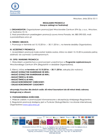 Wrocław, dnia 2016-10-11 REGULAMIN PROMOCJI Gorące zabiegi na Teatralnej! I. ORGANIZATOR: Organizatorem promocji jest Wrocławskie Centrum SPA Sp. z o.o., Wrocław, ul. Teatralna 10-12. 2. Nad prawidłowym przebiegiem promocji czuwa Anna Porada, tel. 885 590 053, mail: [email protected] II. TERMIN i MIEJSCE. 1. Promocja w terminie od 15.10.2016 r. – 30.11.2016 r., na terenie siedziby Organizatora. III. UCZESTNICY PROMOCJI. 1. Uczestnikiem promocji może zostać każda osoba, która na dzień 15.10.2016 posiada pełną zdolność do czynności cywilnoprawnych. IV. OPIS I WARUNKI PROMOCJI. 1. Warunkiem uczestnictwa w promocji jest uczestnictwo w Programie Lojalnościowym Wrocławskiego Centrum SPA [Regulamin w siedzibie Organizatora]. 2. Klienci, którzy w terminie od 15.10.2016r. – 30.11.2016r. zakupią (do wyboru): - MASAŻ GORĄCYMI KAMIENIAMI 30 MIN.; - MASAŻ GORĄCYMI KAMIENIAMI 60 MIN.; - MASAŻ ŚWIECĄ 30 MIN.; - MASAŻ ŚWIECĄ 60 MIN.; - OKŁAD BOROWINOWY CZĘŚCIOWY; - OKŁAD BOROWINOWY CAŁKOWITY otrzymają Voucher dla dwóch osób: 60 minut Saunarium lub 60 minut strefy odnowy biologicznej w siłowni. V. POSTANOWIENIA KOŃCOWE. 1. Wzięcie udziału w promocji jest równoznaczne z akceptacją niniejszego Regulaminu. 2. Regulamin promocji dostępny jest w Punkcie Obsługi Klienta i na stronie internetowej Organizatora www.spa.wroc.pl. Wrocławskie Centrum SPA Sp. z o. o., ul. Teatralna 10-12, 50-055 Wrocław, e-mail: [email protected], Regon: 932266216, NIP: 8971649492, Konto: BGŻ BNP Paribas S.A. 71 2030 0045 1110 0000 0035 7630,KRS nr 0000003584, Sąd Rej. we Wrocławiu, VI Wydz. Gosp. KRS, Kap. zak. i kap. wpł.: 41.366.500 PLN. www.spa.wroc.pl
