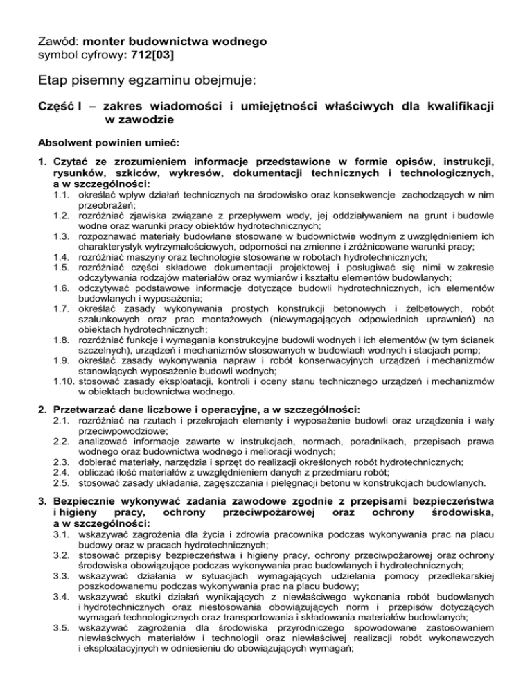 Zawód: monter budownictwa wodnego symbol cyfrowy: 712[03] Etap pisemny egzaminu obejmuje: Część I − zakres wiadomości i umiejętności właściwych dla kwalifikacji w zawodzie Absolwent powinien umieć: 1. Czytać ze zrozumieniem informacje przedstawione w formie opisów, instrukcji, rysunków, szkiców, wykresów, dokumentacji technicznych i technologicznych, a w szczególności: 1.1. określać wpływ działań technicznych na środowisko oraz konsekwencje zachodzących w nim przeobrażeń; 1.2. rozróżniać zjawiska związane z przepływem wody, jej oddziaływaniem na grunt i budowle wodne oraz warunki pracy obiektów hydrotechnicznych; 1.3. rozpoznawać materiały budowlane stosowane w budownictwie wodnym z uwzględnieniem ich charakterystyk wytrzymałościowych, odporności na zmienne i zróżnicowane warunki pracy; 1.4. rozróżniać maszyny oraz technologie stosowane w robotach hydrotechnicznych; 1.5. rozróżniać części składowe dokumentacji projektowej i posługiwać się nimi w zakresie odczytywania rodzajów materiałów oraz wymiarów i kształtu elementów budowlanych; 1.6. odczytywać podstawowe informacje dotyczące budowli hydrotechnicznych, ich elementów budowlanych i wyposażenia; 1.7. określać zasady wykonywania prostych konstrukcji betonowych i żelbetowych, robót szalunkowych oraz prac montażowych (niewymagających odpowiednich uprawnień) na obiektach hydrotechnicznych; 1.8. rozróżniać funkcje i wymagania konstrukcyjne budowli wodnych i ich elementów (w tym ścianek szczelnych), urządzeń i mechanizmów stosowanych w budowlach wodnych i stacjach pomp; 1.9. określać zasady wykonywania napraw i robót konserwacyjnych urządzeń i mechanizmów stanowiących wyposażenie budowli wodnych; 1.10. stosować zasady eksploatacji, kontroli i oceny stanu technicznego urządzeń i mechanizmów w obiektach budownictwa wodnego. 2. Przetwarzać dane liczbowe i operacyjne, a w szczególności: 2.1. rozróżniać na rzutach i przekrojach elementy i wyposażenie budowli oraz urządzenia i wały przeciwpowodziowe; 2.2. analizować informacje zawarte w instrukcjach, normach, poradnikach, przepisach prawa wodnego oraz budownictwa wodnego i melioracji wodnych; 2.3. dobierać materiały, narzędzia i sprzęt do realizacji określonych robót hydrotechnicznych; 2.4. obliczać ilość materiałów z uwzględnieniem danych z przedmiaru robót; 2.5. stosować zasady układania, zagęszczania i pielęgnacji betonu w konstrukcjach budowlanych. 3. Bezpiecznie wykonywać zadania zawodowe zgodnie z przepisami bezpieczeństwa i higieny pracy, ochrony przeciwpożarowej oraz ochrony środowiska, a w szczególności: 3.1. wskazywać zagrożenia dla życia i zdrowia pracownika podczas wykonywania prac na placu budowy oraz w pracach hydrotechnicznych; 3.2. stosować przepisy bezpieczeństwa i higieny pracy, ochrony przeciwpożarowej oraz ochrony środowiska obowiązujące podczas wykonywania prac budowlanych i hydrotechnicznych; 3.3. wskazywać działania w sytuacjach wymagających udzielania pomocy przedlekarskiej poszkodowanemu podczas wykonywania prac na placu budowy; 3.4. wskazywać skutki działań wynikających z niewłaściwego wykonania robót budowlanych i hydrotechnicznych oraz niestosowania obowiązujących norm i przepisów dotyczących wymagań technologicznych oraz transportowania i składowania materiałów budowlanych; 3.5. wskazywać zagrożenia dla środowiska przyrodniczego spowodowane zastosowaniem niewłaściwych materiałów i technologii oraz niewłaściwej realizacji robót wykonawczych i eksploatacyjnych w odniesieniu do obowiązujących wymagań; 712[03] Monter budownictwa wodnego 3.6. dobierać odzież roboczą i sprzęt ochrony indywidualnej do wykonywanych prac budowlanych i hydrotechnicznych; 3.7. stosować zasady ochrony budowli wodnych przed uszkodzeniami mechanicznymi i niekorzystnymi warunkami atmosferycznymi. Część II − zakres wiadomości i umiejętności związanych z zatrudnieniem i działalnością gospodarczą Absolwent powinien umieć: 1. Czytać ze zrozumieniem informacje przedstawione w formie opisów, instrukcji, tabel, wykresów, a w szczególności: 1.1. rozróżniać podstawowe pojęcia i terminy z obszaru funkcjonowania gospodarki oraz prawa pracy, prawa podatkowego i przepisów regulujących podejmowanie i wykonywanie działalności gospodarczej; 1.2. rozróżniać dokumenty związane z zatrudnieniem oraz podejmowaniem i wykonywaniem działalności gospodarczej; 1.3. identyfikować i analizować informacje dotyczące wymagań i uprawnień pracownika, pracodawcy, bezrobotnego i klienta. 2. Przetwarzać dane liczbowe i operacyjne, a w szczególności: 2.1. analizować informacje związane z podnoszeniem kwalifikacji, poszukiwaniem pracy i zatrudnieniem oraz podejmowaniem i wykonywaniem działalności gospodarczej; 2.2. sporządzać dokumenty związane z poszukiwaniem pracy i zatrudnieniem oraz podejmowaniem i wykonywaniem działalności gospodarczej; 2.3. rozróżniać skutki wynikające z nawiązania i rozwiązania stosunku pracy. Etap praktyczny egzaminu obejmuje praktyczne umiejętności z zakresu kwalifikacji w zawodzie, objęte tematami: 1. Wykonanie szalunku z desek dla określonego elementu konstrukcyjnego związanego z budownictwem wodnym zgodnie z dokumentacją. 2. Wykonanie określonych prac związanych z konserwacją lub eksploatacją wskazanego urządzenia wodnego zgodnie z dokumentacją. Absolwent powinien umieć: 1. Planować czynności związane z wykonaniem zadania: 1.1. sporządzić plan działania; 1.2. sporządzić wykaz niezbędnych surowców, materiałów, sprzętu kontrolno-pomiarowego, narzędzi; 1.3. wykonać niezbędne obliczenia, rysunki lub szkice pomocnicze. 2. Organizować stanowisko pracy: 2.1. zgromadzić i rozmieścić na stanowisku pracy materiały, narzędzia, urządzenia i sprzęt zgodnie z zasadami bezpieczeństwa i higieny pracy oraz ochrony przeciwpożarowej; 2.2. sprawdzić stan techniczny ma