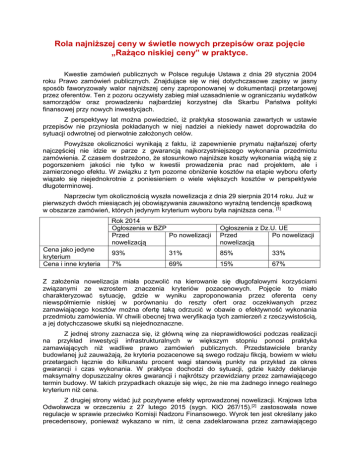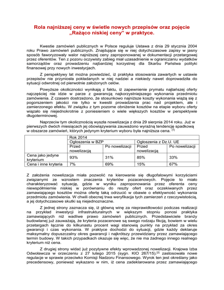 Rola najniższej ceny w świetle nowych przepisów oraz pojęcie „Rażąco niskiej ceny” w praktyce. Kwestie zamówień publicznych w Polsce reguluje Ustawa z dnia 29 stycznia 2004 roku Prawo zamówień publicznych. Znajdujące się w niej dotychczasowe zapisy w jasny sposób faworyzowały walor najniższej ceny zaproponowanej w dokumentacji przetargowej przez oferentów. Ten z pozoru oczywisty zabieg miał uzasadnienie w ograniczaniu wydatków samorządów oraz prowadzeniu najbardziej korzystnej dla Skarbu Państwa polityki finansowej przy nowych inwestycjach. Z perspektywy lat można powiedzieć, iż praktyka stosowania zawartych w ustawie przepisów nie przyniosła pokładanych w niej nadziei a niekiedy nawet doprowadziła do sytuacji odwrotnej od pierwotnie założonych celów. Powyższe okoliczności wynikają z faktu, iż zapewnienie prymatu najtańszej oferty najczęściej nie idzie w parze z gwarancją najkorzystniejszego wykonania przedmiotu zamówienia. Z czasem dostrzeżono, że stosunkowo najniższe koszty wykonania wiążą się z pogorszeniem jakości nie tylko w kwestii prowadzenia prac nad projektem, ale i zamierzonego efektu. W związku z tym pozorne obniżenie kosztów na etapie wyboru oferty wiązało się niejednokrotnie z poniesieniem o wiele większych kosztów w perspektywie długoterminowej. Naprzeciw tym okolicznością wyszła nowelizacja z dnia 29 sierpnia 2014 roku. Już w pierwszych dwóch miesiącach jej obowiązywania zauważono wyraźną tendencję spadkową w obszarze zamówień, których jedynym kryterium wyboru była najniższa cena. [1] Cena jako jedyne kryterium Cena i inne kryteria Rok 2014 Ogłoszenia w BZP Przed Po nowelizacji nowelizacją Ogłoszenia z Dz.U. UE Przed Po nowelizacji nowelizacją 93% 31% 85% 33% 7% 69% 15% 67% Z założenia nowelizacja miała pozwolić na kierowanie się długofalowymi korzyściami związanymi ze wzrostem znaczenia kryteriów pozacenowych. Pojęcie to miało charakteryzować sytuację, gdzie w wyniku zaproponowania przez oferenta ceny niewspółmiernie niskiej w porównaniu do reszty ofert oraz oczekiwanych przez zamawiającego kosztów można ofertę taką odrzucić w obawie o efektywność wykonania przedmiotu zamówienia. W chwili obecnej trwa weryfikacja tych zamierzeń z rzeczywistością, a jej dotychczasowe skutki są niejednoznaczne. Z jednej strony zaznacza się, iż główną winę za nieprawidłowości podczas realizacji na przykład inwestycji infrastrukturalnych w większym stopniu ponosi praktyka zamawiających niż wadliwe prawo zamówień publicznych. Przedstawiciele branży budowlanej już zauważają, że kryteria pozacenowe są swego rodzaju fikcją, bowiem w wielu przetargach łącznie do kilkunastu procent wagi stanowią punkty na przykład za okres gwarancji i czas wykonania. W praktyce dochodzi do sytuacji, gdzie każdy deklaruje maksymalny dopuszczalny okres gwarancji i najkrótszy przewidziany przez zamawiającego termin budowy. W takich przypadkach okazuje się więc, że nie ma żadnego innego realnego kryterium niż cena. Z drugiej strony widać już pozytywne efekty wprowadzonej nowelizacji. Krajowa Izba Odwoławcza w orzeczeniu z 27 lutego 2015 (sygn. KIO 267/15).[2] zastosowała nowe regulacje w sprawie przeciwko Komisji Nadzoru Finansowego. Wyrok ten jest określany jako precedensowy, ponieważ wykazano w nim, iż cena zadeklarowana przez zamawiającego jest rażąco niska w stosunku do pozostałych ofert w związku z brakiem zaliczenia na poczet kosztów wykonania usługi wydatków, które zostaną sfinansowane ze środków unijnych na pomoc w zatrudnieniu osobom niepełnosprawnym. Krajowa Izba Odwoławcza uznając tego typu praktyki za niedopuszczalne postanowiła wybór unieważnić. Na chwilę obecną zmiany w omawianej kwestii można ocenić jako pozytywne, jednak jedynie praktyka a zatem i orzeczenia podobne do powyższego wskażą jednoznacznie, czy zastosowane rozwiązania będą miały pełną skuteczność w kwestii zwalczania prymatu najniższej. Równocześnie trzeba wspomnieć o tym, że trwają prace nad zupełnie nową ustawą o zamówieniach publicznych, będącej m.in. efektem implementacji dyrektyw unijnych. Konsultacje społeczne miały się zacząć na przełomie marca i kwietnia tego roku. Przewidywany czas przyjęcia ustawy to jesień 2015 r., a wejścia w życie to kwiecień 2016 r. Można więc uznać, że obecna nowelizacja i jej stosowanie stanowią pole doświadczalne dla regulacji, które miałyby znaleźć się w nowej ustawie. „Rażąco niska cena” Rażąco niska cena to pozbawione definicji legalnej pojęcie służące do określenia sytuacji, gdy ogólnie mówiąc wysokość ceny przynajmniej jednej z ofert pozwala w wysokim stopniu domniemywać, iż została ona w pewien sposób „sztucznie” zaniżona przez oferenta poprzez zastosowanie instrumentów mogących w istotny sposób oddziaływać na jakość wykonania zamówienia ze szkodą dla zamawiającego. Mechanizm działania zasady ustalania rażąco niskiej ceny opiera się przede wszystkim na art. 90 ust. 1 Ustawy prawo zamówień publicznych. Procedura ta oddaje w ręce jej adresatów narzędzie mające wymusić, w wypadkach uzasadnionych wątpliwości, dowiedzenie przez występujących w przetargu oferentów adekwatności ceny złożonych projektów do zakresu obejmującego przedmiot zamówienia. Na podstawie nowelizacji, która weszła w życie z dniem 19 października 2014 roku w szczególności w skrajnych przypadkach, jak zgłoszenie oferty równej wartości 30% średniej arytmetycznej ogółu ofert lub ceny niższej o 30% od zgłoszonej przez zamawiającego wartości zamówienia, ustawodawca zobowiązuje zamawiającego do wszczęcia owej procedury sprawdzającej. W nawiązaniu do nowych już zasad ustalania rażąco niskiej ceny Krajowa Izba Odwoławcza dnia 23 września 2014 r. wydała wyrok, zgodnie z którym w stosunku do zamawiającego w osobie związku celowego gmin organizuj