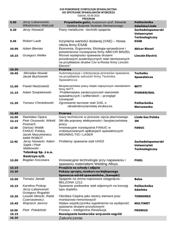 9.00 XVII POMORSKIE SYMPOZJUM SPAWALNICTWA XIX SPOTKANIE SPAWALNIKÓW WYBRZEŻA Gdańsk, 03.09.2015 PROGRAM Przywitanie gości, Audytorium prof. Edwarda Geislera Budynek Wydziału Mechanicznego Politechnika Gdańska/Linde Zachodniopomorski Uniwersytet Technologiczny ESAB 9.30 Jerzy Łabanowski, Włodzimierz Walczak Jerzy Nowacki 9.45 Robert Lazik Inżynieria wartości dodanej (VAE) – Nowa oferta firmy ESAB 10.00 Adam Bienias Abicor Binzel 10.15 Grzegorz Welke Ekonomia, Ergonomia, Ekologia-sprawdzone i potwierdzone rozwiązania firmy ABICOR BINZEL Wzrost wydajności spawania drutami proszkowymi austenitycznych stali nierdzewnych na przykładzie drutów Cor-a-Rosta firmy Lincoln Electric” Przerwa Automatyzacja i robotyzacja procesów spawania na przykładzie wdrożeń firmy Technika Spawalnicza 10.30 10.45 Mirosław Nowak Jacek Buchowski Piany metaliczne –techniki spajania Lincoln Electric Technika Spawalnicza 11.00 Paweł Niedzwiedź Bezpieczeństwo pracy dzięki najwyższym standardom firmy WITT. WITT 11.15 Adam Szepietowski PIONIER/IDAL 11.30 Tomasz Chmielewski Problematyka zanieczyszczeń stanowisk spawalniczych i szlifierskich – przegląd rozwiązań Zgrzewanie tarciowe stali 316L o ultradrobnoziarnistej strukturze. 11.45 12.00 12.15 12 30 12 45 Stanisław Opara Piotr Ossowski, Witold Postrach Dariusz Wabik FANUC Polska, Jacek Mazurkiewicz AMM ROBOT. Jerzy Nowacki, Adam Sajek i Piotr Matkowski - Przerwa Gazy techniczne w procesie cięcia plazmowego 3M dla poprawy efektywności i bezpieczeństwa pracy Innowacyjne rozwiązania FANUC w zrobotyzowanych aplikacjach spawalniczych MIG/MAG,TIG i LASER Bogdan Koczwara 13.15 13.30 15.00 Tomasz Janiak 15.15 Karolina Prokop Jerzy Łabanowski Grzegorz Rogalski Leszek Mirecki, Rafał Czarnasiewicz. Wojciech Jamroz 15.30 15.45 16 00 16.15 16.30 Piotr Połubiński Linde Gaz Polska 3M FANUC Problemy spawania stali UHSS Zachodniopomorski Uniwersytet Technologiczny Innowacyjne technologie przy napawaniu i spawaniu materiałami Welding Alloys. FIGEL Teleskop Sp. z o.o. Kostrzyn n/O. 13.00 Politechnika Warszawska Przejście na schody i zdjęcie Pokazy sprzętu, konkurs na Najlepszego Spawacza wśród spawalników, (kanapki) Spajanie na zimno-najnowsze osiągnięcia BELZONA 1212. Spawanie podwodne stali odpornych na korozję typu dupleks Obróbka Cieplna jako istotny element prac montażowo-remontowych Wpływ współczynnika wypełnienia na wydajność spawania drutami proszkowymi Fronius – Inteligentna Rewolucja Rozwiązanie konkursów wręczenie nagród Zakończenie Belse Politechnika Gdańska TERMOREX MULTIMET FRONIUS 16.45 23 00 Odjazd Autobusów do Wróblówki Odjazd drugiego autobusu z Wróblówki