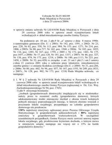 Uchwała Nr XLIV/402/09 Rady Miejskiej w Pyrzycach z dnia 25 czerwca 2009r. w sprawie zmiany uchwały Nr LII/418/06 Rady Miejskiej w Pyrzycach z dnia 29 czerwca 2006 roku w sprawie zasad wynajmowania lokali wchodzących w skład mieszkaniowego zasobu Gminy Pyrzyce Na podstawie art. 18 ust. 2 pkt.9 lit ,,a” ustawy z dnia 8 marca 1990r. o samorządzie gminnym (Dz. U. z 2001r. Nr 142, poz. 1591, z 2002r. Nr 23, poz. 220, Nr 62, poz. 558, Nr 113, poz. 984, Nr 153, poz. 1271, Nr 214, poz. 1806, z 2003r. Nr 80, poz.717, Nr 162, poz. 1568, z 2004r. Nr 102, poz. 1055, Nr 116, poz. 1203, Nr 167, poz. 1759, z 2005 r. Nr 172, poz. 1441, Nr 175, poz.1457, z 2006r. Nr 17, poz.128, Nr 181, poz. 1337, z 2007r. Nr 48, poz. 327, Nr 138, poz. 974, Nr 173, poz. 1218, z 2008r. Nr 180, poz.1111, Nr 223, poz. 1458, z 2009r. Nr 52, poz.420) w związku z art. 21 ust.1 pkt.2 i ust.3 ustawy z dnia 21 czerwca 2001 roku o ochronie praw lokatorów, mieszkaniowym zasobie gminy i o zmianie Kodeksu cywilnego (Dz.U. z 2005r. Nr 31, poz.266, z 2006r. Nr 86, poz. 602, Nr 94, poz. 657, Nr 167, poz.1193, Nr 249, poz.1833, z 2007r., Nr 128, poz. 902, Nr 173, poz. 1218) Rada Miejska uchwala, co następuje: § 1. W § 2 uchwały Nr LII/418/06 Rady Miejskiej w Pyrzycach z dnia 29 czerwca 2006 roku w sprawie zasad wynajmowania lokali wchodzących w skład mieszkaniowego zasobu Gminy Pyrzyce (ogłoszonej w Dz. Urz. Woj. Zachodniopomorskiego Nr 94, poz. 1765): 1) pkt 9 otrzymuje brzmienie: ,,osobach (gospodarstwach domowych) znajdujących się w niedostatkunależy przez to rozumieć osoby (gospodarstwa domowe), których udokumentowany średni miesięczny dochód z okresu trzech kolejnych pełnych miesięcy poprzedzających miesiąc, w którym złożono wniosek o przyznanie lokalu socjalnego, przypadający na członka gospodarstwa domowego nie przekracza: 130% najniższej emerytury ogłoszonej przez Prezesa Głównego Urzędu Statystycznego w gospodarstwach jednoosobowych i 80% najniższej emerytury w gospodarstwach wieloosobowych. W szczególnie uzasadnionych przypadkach, Gmina Pyrzyce może zawrzeć umowę najmu lokalu socjalnego, gdy przekroczone kryterium dochodu, o którym mowa w niniejszym ustępie następuje nie więcej niż o 15% na każde gospodarstwo domowe.” 2) pkt 10 otrzymuje brzmienie: ,,osobach (gospodarstwach domowych) o niskich dochodach- należy przez to rozumieć osoby (gospodarstwa domowe), których udokumentowany średni miesięczny dochód z okresu trzech kolejnych pełnych miesięcy poprzedzających miesiąc, w którym złożono wniosek o przyznanie lokalu mieszkalnego, przypadający na członka gospodarstwa domowego nie przekracza 175% najniższej emerytury ogłoszonej przez Prezesa Głównego Urzędu Statystycznego w gospodarstwie jednoosobowym i 125% najniższej emerytury w gospodarstwie wieloosobowym. W szczególnie uzasadnionych przypadkach, Gmina Pyrzyce może zawrzeć umowę najmu lokalu, gdy przekroczone kryterium dochodu, o którym mowa w niniejszym punkcie następuje nie więcej niż o 20% na każde gospodarstwo domowe.” § 2. Wykonanie uchwały powierza się Burmistrzowi Pyrzyc. § 3. Uchwała wchodzi w życie po upływie 14 dni od dnia ogłoszenia w Dzienniku Urzędowym Województwa Zachodniopomorskiego. Przewodniczący Rady Andrzej Gumowski .