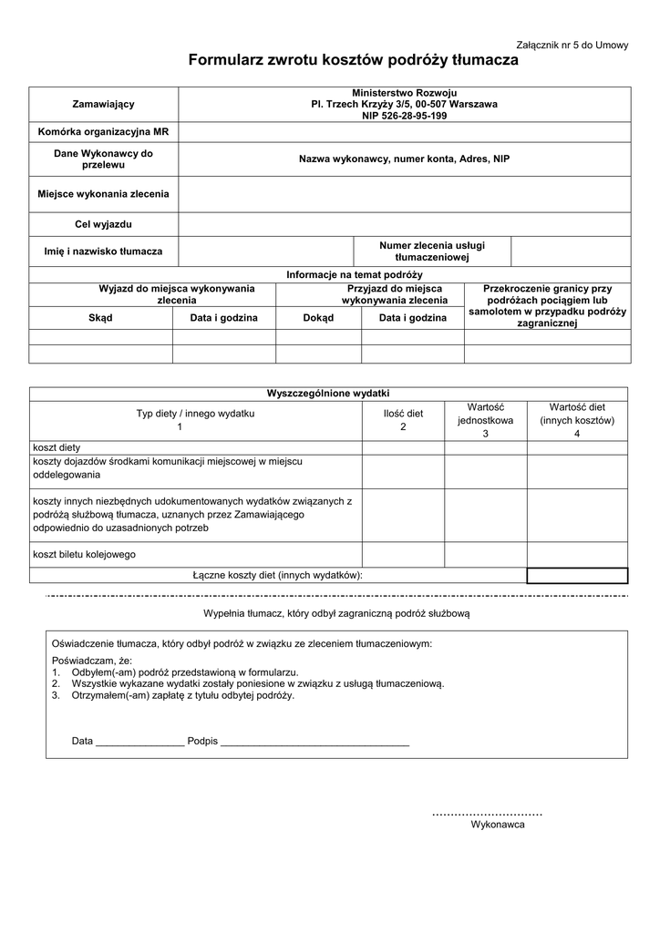 Załącznik nr 5 do Umowy Formularz zwrotu kosztów podróży tłumacza Ministerstwo Rozwoju Pl. Trzech Krzyży 3/5, 00-507 Warszawa NIP 526-28-95-199 Zamawiający Komórka organizacyjna MR Dane Wykonawcy do przelewu Nazwa wykonawcy, numer konta, Adres, NIP Miejsce wykonania zlecenia Cel wyjazdu Numer zlecenia usługi tłumaczeniowej Imię i nazwisko tłumacza Wyjazd do miejsca wykonywania zlecenia Skąd Informacje na temat podróży Przyjazd do miejsca wykonywania zlecenia Data i godzina Dokąd Data i godzina Przekroczenie granicy przy podróżach pociągiem lub samolotem w przypadku podróży zagranicznej Wyszczególnione wydatki Typ diety / innego wydatku 1 Wartość jednostkowa 3 Ilość diet 2 Wartość diet (innych kosztów) 4 koszt diety koszty dojazdów środkami komunikacji miejscowej w miejscu oddelegowania koszty innych niezbędnych udokumentowanych wydatków związanych z podróżą służbową tłumacza, uznanych przez Zamawiającego odpowiednio do uzasadnionych potrzeb koszt biletu kolejowego Łączne koszty diet (innych wydatków): Wypełnia tłumacz, który odbył zagraniczną podróż służbową Oświadczenie tłumacza, który odbył podróż w związku ze zleceniem tłumaczeniowym: Poświadczam, że: 1. Odbyłem(-am) podróż przedstawioną w formularzu. 2. Wszystkie wykazane wydatki zostały poniesione w związku z usługą tłumaczeniową. 3. Otrzymałem(-am) zapłatę z tytułu odbytej podróży. Data ________________ Podpis __________________________________ .............................. Wykonawca