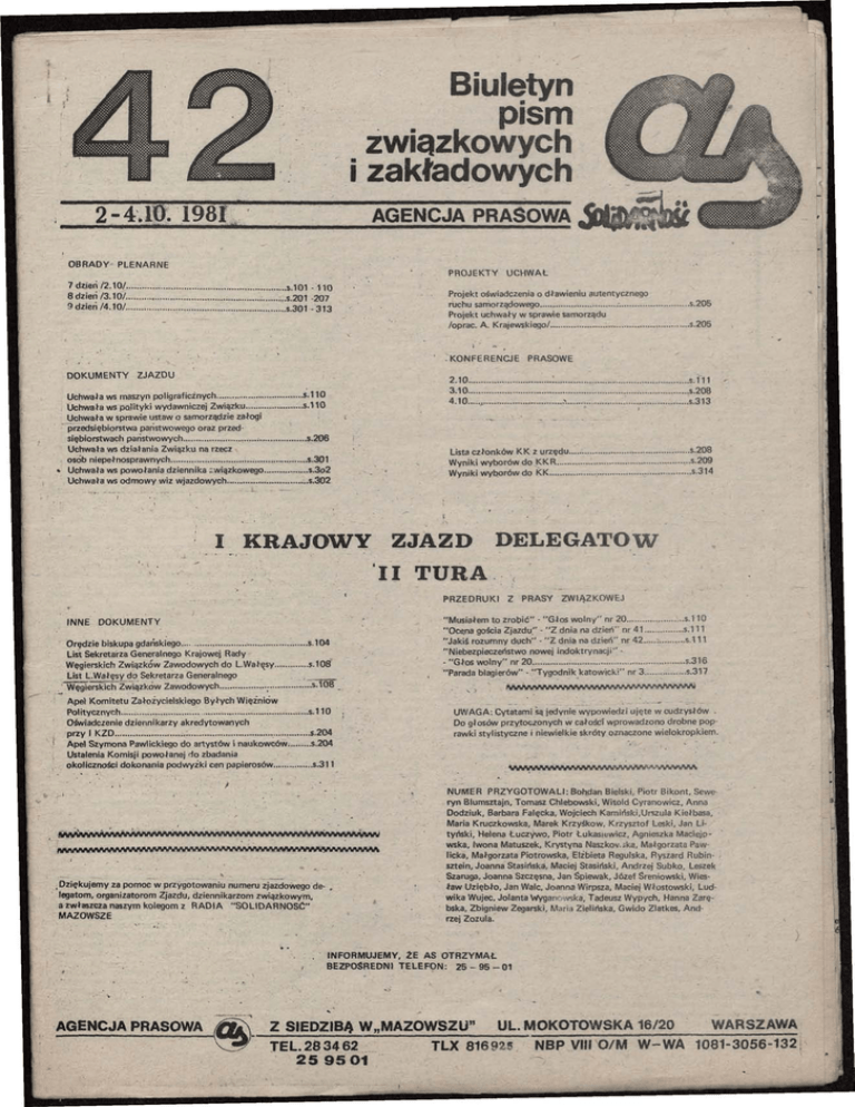 pondentów CTK, ADN', BTA, TASS od wszelkich dyskusji z propozycjami programowymi Związku. Z kontrrewolucjonistą wszak*