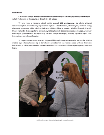 EDU SALON Kilkanaście tysięcy młodych osób uczestniczyło w Targach Edukacyjnych zorganizowanych w hali Podpromie w Rzeszowie, w dniach 28 – 29 lutego. W tym roku w targach udział wzięło ponad 100 wystawców. Na płycie głównej rzeszowskiej hali prezentowały się uczelnie wyższe z Podkarpacia, ale nie tylko, bowiem swoją obecnośd zaznaczyły także szkoły z Krakowa, Lublina, Gdyni, a nawet z Wielkiej Brytanii, Irlandii, Danii i Holandii. Ze swoją ofertą przyjechały także placówki doskonalenia zawodowego, wydawcy edukacyjni, producenci i dystrybutorzy sprzętu komputerowego, pomocy dydaktycznych oraz internetowe portale edukacyjne. W targach uczestniczył również Wojewódzki Urząd Pracy w Rzeszowie. Na stoisku WUP-u można było skonsultowad się z doradcami zawodowymi na temat zasad wyboru kierunku kształcenia, a także porozmawiad z doradcami EURES o aktualnych ofertach pracy poza granicami kraju. Stoisko informacyjne Wojewódzkiego Urzędu Pracy w Rzeszowie.