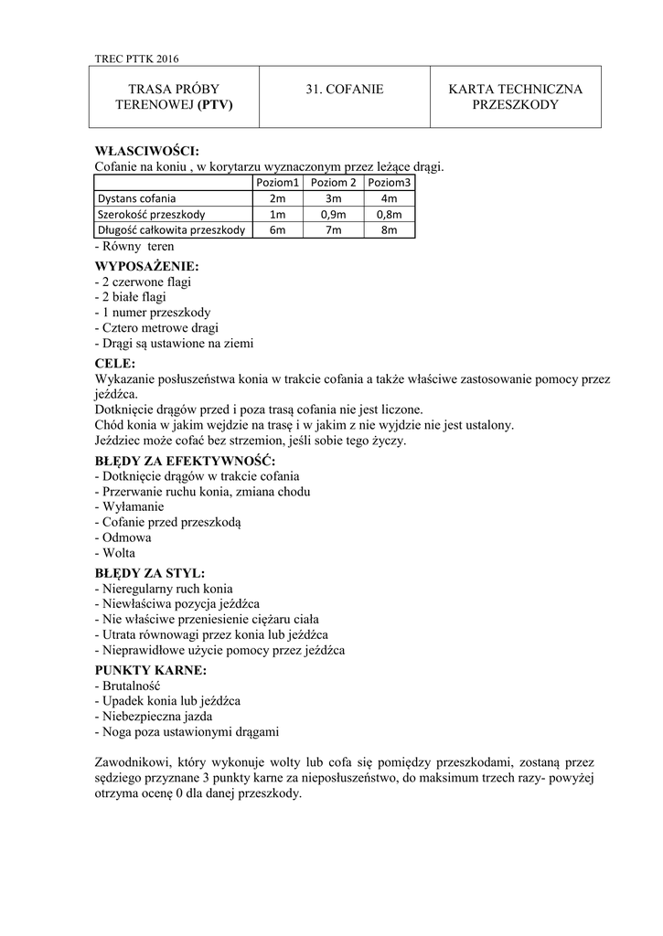TREC PTTK 2016 TRASA PRÓBY TERENOWEJ (PTV) 31. COFANIE KARTA TECHNICZNA PRZESZKODY WŁASCIWOŚCI: Cofanie na koniu , w korytarzu wyznaczonym przez leżące drągi. Poziom1 Poziom 2 Poziom3 Dystans cofania 2m 3m 4m Szerokość przeszkody 1m 0,9m 0,8m Długość całkowita przeszkody 6m 7m 8m - Równy teren WYPOSAŻENIE: - 2 czerwone flagi - 2 białe flagi - 1 numer przeszkody - Cztero metrowe dragi - Drągi są ustawione na ziemi CELE: Wykazanie posłuszeństwa konia w trakcie cofania a także właściwe zastosowanie pomocy przez jeźdźca. Dotknięcie drągów przed i poza trasą cofania nie jest liczone. Chód konia w jakim wejdzie na trasę i w jakim z nie wyjdzie nie jest ustalony. Jeździec może cofać bez strzemion, jeśli sobie tego życzy. BŁĘDY ZA EFEKTYWNOŚĆ: - Dotknięcie drągów w trakcie cofania - Przerwanie ruchu konia, zmiana chodu - Wyłamanie - Cofanie przed przeszkodą - Odmowa - Wolta BŁĘDY ZA STYL: - Nieregularny ruch konia - Niewłaściwa pozycja jeźdźca - Nie właściwe przeniesienie ciężaru ciała - Utrata równowagi przez konia lub jeźdźca - Nieprawidłowe użycie pomocy przez jeźdźca PUNKTY KARNE: - Brutalność - Upadek konia lub jeźdźca - Niebezpieczna jazda - Noga poza ustawionymi drągami Zawodnikowi, który wykonuje wolty lub cofa się pomiędzy przeszkodami, zostaną przez sędziego przyznane 3 punkty karne za nieposłuszeństwo, do maksimum trzech razy- powyżej otrzyma ocenę 0 dla danej przeszkody. TREC PTTK 2016 KARTA OCENY PRZESZKODY COFANIE NR PRZESZKODY……………. SĘDZIA……………………… …. NR STAR T. E S P RAZEM + - = Uwagi: SCHEMAT OCENIANIA : E+S-P EFEKTYWNOŚĆ E STYL S PKT.KARNE P Poprawna 7 bardzo dobry +3 Brutalność -3 1 błąd 4 dobry +2 Niebezpieczna jazda -3 2 błąd 1 prawie dobry +1 Upadek 0 3 błąd 0 przeciętny 0 Noga poza drągami 0 słaby -1 zły -2 Punktacja 0 za efektywność lub za punkty karne oznacza całkowitą ocenę 0 za daną przeszkodę 7 = 0 błędów za efektywność: brak dotkniętych drągów ,brak przerwania ruchu konia, brak wyłamania, brak cofania, brak odmowy, brak wolty 4 = 1 błąd: 1- drąg dotknięty, etc. 1 = 2 błąd: 2- drąg dotknięty, etc. 0 = 3 błąd: etc. Te oceny należy wpisać w kratkę E w karcie oceny
