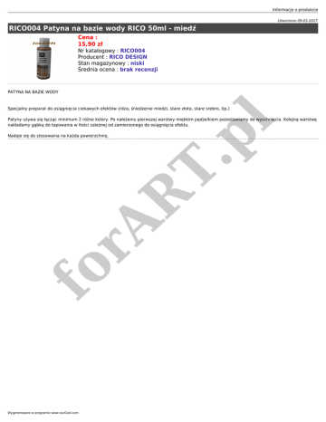 Informacje o produkcie Utworzono 09-03-2017 RICO004 Patyna na bazie wody RICO 50ml - miedź Cena : 15,90 zł Nr katalogowy : RICO004 Producent : RICO DESIGN Stan magazynowy : niski Średnia ocena : brak recenzji PATYNA NA BAZIE WODY Specjalny preparat do osiągnięcia ciekawych efektów (rdza, śniedzenie miedzi, stare złoto, stare srebro, itp.) fo rA R Nadaje się do stosowania na każda powierzchnię. T. pl Patyny używa się łącząc minimum 2 różne kolory. Po nałożeniu pierwszej warstwy miękkim pędzelkiem pozostawiamy do wyschnięcia. Kolejną warstwę nakładamy gąbką do tapowania w ilości zależnej od zamierzonego do osiągnięcia efektu. Wygenerowano w programie www.oscGold.com
