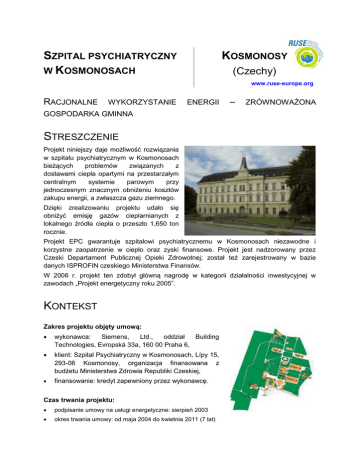 SZPITAL PSYCHIATRYCZNY W KOSMONOSACH KOSMONOSY (Czechy) www.ruse-europe.org RACJONALNE WYKORZYSTANIE ENERGII – ZRÓWNOWAŻONA GOSPODARKA GMINNA STRESZCZENIE Projekt niniejszy daje możliwość rozwiązania w szpitalu psychiatrycznym w Kosmonosach bieżących problemów związanych z dostawami ciepła opartymi na przestarzałym centralnym systemie parowym przy jednoczesnym znacznym obniżeniu kosztów zakupu energii, a zwłaszcza gazu ziemnego. Dzięki zrealizowaniu projektu udało się obniżyć emisję gazów cieplarnianych z lokalnego źródła ciepła o przeszło 1,650 ton rocznie. Projekt EPC gwarantuje szpitalowi psychiatrycznemu w Kosmonosach niezawodne i korzystne zaopatrzenie w ciepło oraz zyski finansowe. Projekt jest nadzorowany przez Czeski Departament Publicznej Opieki Zdrowotnej; został też zarejestrowany w bazie danych ISPROFIN czeskiego Ministerstwa Finansów. W 2006 r. projekt ten zdobył główną nagrodę w kategorii działalności inwestycyjnej w zawodach „Projekt energetyczny roku 2005”. KONTEKST Zakres projektu objęty umową: wykonawca: Siemens, Ltd., oddział Building Technologies, Evropská 33a, 160 00 Praha 6, klient: Szpital Psychiatryczny w Kosmonosach, Lípy 15, 293-06 Kosmonosy, organizacja finansowana z budżetu Ministerstwa Zdrowia Republiki Czeskiej, finansowanie: kredyt zapewniony przez wykonawcę. Czas trwania projektu: podpisanie umowy na usługi energetyczne: sierpień 2003 okres trwania umowy: od maja 2004 do kwietnia 2011 (7 lat) Podstawowe informacje o projekcie Na terenie szpitala psychiatrycznego znajduje się 15 zasadniczych ogrzewanych obiektów, z których siedem ma znaczenie z punktu widzenia energii cieplnej. Wspomniany powyżej system pomiarów i regulacji (MaR) zapewnia wytwarzanie i dystrybucję medium grzewczego w sposób precyzyjnie odpowiadający potrzebom szpitala psychiatrycznego. Obiekty, o których tu mowa są widoczne w centrum kontroli systemu, co umożliwia zdalne zarządzanie wszystkimi częściami systemu i nadzór nad nimi. Obecnie w szpitalu znajduje się 600 łóżek, a pacjentami opiekuje się 500-osobowy personel. Energia – zużycie energii cieplnej: 23.600 GJ/rok – zużycie energii elektrycznej: 985 MWh/rok – zużycie wody: 81.100 m3/rok Skala świadczonych usług: – restrukturyzacja gospodarki ciepłem – usługi systemu MaR KOSZTY I KORZYŚCI Ekonomiczne inwestycja wykonawcy w sprzęt: 18,56 mln CZK zysk gwarantowany dla szpitala psychiatrycznego w Kosmonosach w okresie 7 lat: 19,67 mln CZK (wartość bieżąca netto: 16,74 mln CZK) oczekiwane wyniki faktyczne w ciągu 7 lat: 45,44 mln CZK (wartość bieżąca netto: 36,89 mln CZK) koszty energii przed rozpoczęciem projektu: 10,46 mln CZK uzyskane oszczędności: – oszczędności na kosztach zakupu gazu ziemnego do celów grzewczych: 44% finansowanie: – kredyt inwestycyjny zapewniony przez Siemensa; spłata z uzyskanych oszczędności bez konieczności wykorzystania zasobów własnych klienta. OCENA I PERSPEKTYWY ROZWOJU Wykonane działania – wyposażenie starego kotła parowego w nowe źródła: dwa kotły gazowe do ogrzewania wody, – wybudowanie niezależnego generatora średniociśnieniowej pary technologicznej na potrzeby pralni, – wybudowanie nowego podziemnego systemu przesyłu wody grzewczej, – wybudowanie siedmiu stacji wymiennikowych przygotowanych na ÚT i TUV, – przygotowanie systemu centralnego ogrzewania psychiatrycznego do regulacji ogrzewania, – dostosowanie ciśnień i hydrauliki w systemie centralnego ogrzewania, – doposażenie systemów pompowych w kotłach, – wdrożenie pełnego systemu pomiarów i regulacji (Siemens Unigyr), optymalizacja działania w zależności od potrzeb bieżących, – zdalny monitoring wszystkich elementów systemu oraz zarządzania energią. w budynkach szpitala Przepływy gotówkowe w projekcie WIĘCEJ INFORMACJI imię i nazwisko osoby kontaktowej: Juraj Krivošík stanowisko: kierownik projektu organizacja: SEVEn, Centrum Efektywnego Wykorzystywania Energii adres: Americka 17, 120 00 Praha 2, Czechy tel./fax: +420 – 224 252 115 / +420 – 224 247 597 e-mail: [email protected] Niniejsze studium przypadku zostało przygotowane przez SEVEn, Centrum Efektywnego Wykorzystywania Energii, Czechy, www.svn.cz we współpracy z projektem RUSE współfinansowanym ze środków Komisji Europejskiej w ramach Programu INTERREG IIIC (DG REGIO – “Interreg IIIC West Zone”/Kontrakt RUSE 2W0057N).