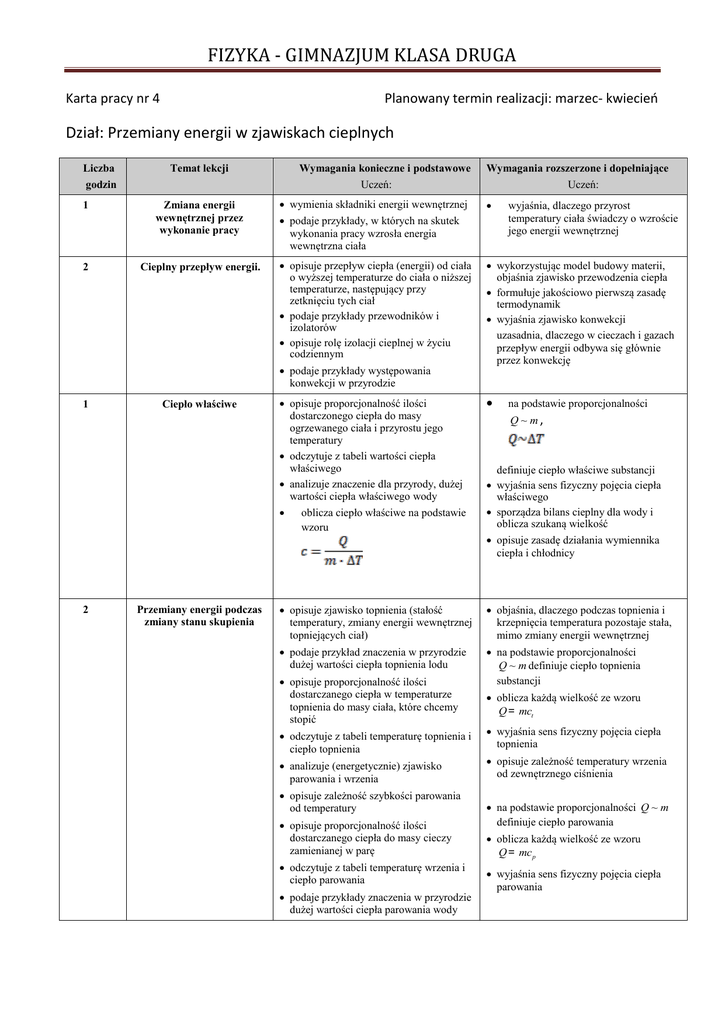 FIZYKA - GIMNAZJUM KLASA DRUGA Karta pracy nr 4 Planowany termin realizacji: marzec- kwiecień Dział: Przemiany energii w zjawiskach cieplnych Liczba godzin 1 2 Temat lekcji Wymagania konieczne i podstawowe Uczeń: Zmiana energii wewnętrznej przez wykonanie pracy wymienia składniki energii wewnętrznej Cieplny przepływ energii. opisuje przepływ ciepła (energii) od ciała o wyższej temperaturze do ciała o niższej temperaturze, następujący przy zetknięciu tych ciał podaje przykłady przewodników i izolatorów opisuje rolę izolacji cieplnej w życiu codziennym Ciepło właściwe opisuje proporcjonalność ilości dostarczonego ciepła do masy ogrzewanego ciała i przyrostu jego temperatury odczytuje z tabeli wartości ciepła właściwego analizuje znaczenie dla przyrody, dużej wartości ciepła właściwego wody 2 Przemiany energii podczas zmiany stanu skupienia podaje przykłady, w których na skutek wykonania pracy wzrosła energia wewnętrzna ciała podaje przykłady występowania konwekcji w przyrodzie 1 Wymagania rozszerzone i dopełniające Uczeń: oblicza ciepło właściwe na podstawie wzoru wyjaśnia, dlaczego przyrost temperatury ciała świadczy o wzroście jego energii wewnętrznej wykorzystując model budowy materii, objaśnia zjawisko przewodzenia ciepła formułuje jakościowo pierwszą zasadę termodynamik wyjaśnia zjawisko konwekcji uzasadnia, dlaczego w cieczach i gazach przepływ energii odbywa się głównie przez konwekcję na podstawie proporcjonalności Q ~ m, definiuje ciepło właściwe substancji wyjaśnia sens fizyczny pojęcia ciepła właściwego sporządza bilans cieplny dla wody i oblicza szukaną wielkość opisuje zasadę działania wymiennika ciepła i chłodnicy opisuje zjawisko topnienia (stałość temperatury, zmiany energii wewnętrznej topniejących ciał) objaśnia, dlaczego podczas topnienia i krzepnięcia temperatura pozostaje stała, mimo zmiany energii wewnętrznej podaje przykład znaczenia w przyrodzie dużej wartości ciepła topnienia lodu na podstawie proporcjonalności Q ~ m definiuje ciepło topnienia substancji opisuje proporcjonalność ilości dostarczanego ciepła w temperaturze topnienia do masy ciała, które chcemy stopić odczytuje z tabeli temperaturę topnienia i ciepło topnienia analizuje (energetycznie) zjawisko parowania i wrzenia opisuje zależność szybkości parowania od temperatury opisuje proporcjonalność ilości dostarczanego ciepła do masy cieczy zamienianej w parę odczytuje z tabeli temperaturę wrzenia i ciepło parowania podaje przykłady znaczenia w przyrodzie dużej wartości ciepła parowania wody oblicza każdą wielkość ze wzoru Q = mct wyjaśnia sens fizyczny pojęcia ciepła topnienia opisuje zależność temperatury wrzenia od zewnętrznego ciśnienia na podstawie proporcjonalności Q ~ m definiuje ciepło parowania oblicza każdą wielkość ze wzoru Q = mc p wyjaśnia sens fizyczny pojęcia ciepła parowania FIZYKA - GIMNAZJUM KLASA DRUGA Liczba godzin Temat lekcji 2 Rozwiązywanie zadań 1 Zmiana energii elektrycznej w inne formy energii. Wyznaczanie ciepła właściwego wody za pomocą czajnika elektrycznego 3 Powtórzenie. Sprawdzian. Omówienie sprawdzianu. Wymagania konieczne i podstawowe Uczeń: wykonuje pomiary masy wody, temperatury i czasu ogrzewania wody odczytuje moc z tablicy znamionowej czajnika podaje rodzaj energii, w jaki zmienia się w tym doświadczeniu energia elektryczna Wymagania rozszerzone i dopełniające Uczeń: wykonuje obliczenia zaokrągla wynik do trzech cyfr znaczących