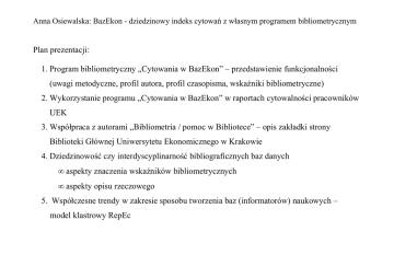 Anna Osiewalska: BazEkon - dziedzinowy indeks cytowań z własnym programem bibliometrycznym Plan prezentacji: 1. Program bibliometryczny „Cytowania w BazEkon” – przedstawienie funkcjonalności (uwagi metodyczne, profil autora, profil czasopisma, wskaźniki bibliometryczne) 2. Wykorzystanie programu „Cytowania w BazEkon” w raportach cytowalności pracowników UEK 3. Współpraca z autorami „Bibliometria / pomoc w Bibliotece” – opis zakładki strony Biblioteki Głównej Uniwersytetu Ekonomicznego w Krakowie 4. Dziedzinowość czy interdyscyplinarność bibliograficznych baz danych • aspekty znaczenia wskaźników bibliometrycznych • aspekty opisu rzeczowego 5. Współczesne trendy w zakresie sposobu tworzenia baz (informatorów) naukowych – model klastrowy RepEc Anna Osiewalska: BazEkon - dziedzinowy indeks cytowań z własnym programem bibliometrycznym Anna Osiewalska: BazEkon - dziedzinowy indeks cytowań z własnym programem bibliometrycznym Uwagi metodologiczne Anna Osiewalska: BazEkon - dziedzinowy indeks cytowań z własnym programem bibliometrycznym Profil autora Anna Osiewalska: BazEkon - dziedzinowy indeks cytowań z własnym programem bibliometrycznym Profil czasopisma Anna Osiewalska: BazEkon - dziedzinowy indeks cytowań z własnym programem bibliometrycznym Raporty ogólne z bazy BazEkon: raport cytowalności czasopism naukowych Anna Osiewalska: BazEkon - dziedzinowy indeks cytowań z własnym programem bibliometrycznym Wykorzystanie programu Cytowania w BazEkon w raportach cytowalności pracowników UEK Anna Osiewalska: BazEkon - dziedzinowy indeks cytowań z własnym programem bibliometrycznym Anna Osiewalska: BazEkon - dziedzinowy indeks cytowań z własnym programem bibliometrycznym Współpraca środowskowa Anna Osiewalska: BazEkon - dziedzinowy indeks cytowań z własnym programem bibliometrycznym Modele bibliograficznych baz danych : lata 50. XX wieku dziedzinowe interdyscyplinarne John Tukey Eugene Garfield Citation Index for Statistics and Probability1963 Science Citation Index 1964 Anna Osiewalska: BazEkon - dziedzinowy indeks cytowań z własnym programem bibliometrycznym Wady i zalety różnych podejść w zakresie wyszukiwania informacji (ang. information retrieval) Baza dziedzinowa Baza interdysyplinarna Zestaw metadanych oprócz tytułu i abstraktu zawiera terminologię dziedziny nauki Przynależność do subdyscypliny określana automatycznie, m.in. jako pochodna specjalizacji czasopisma wyższa precyzja (liczba wyszukanych trafnych dokumentów do liczby wszystkich wyszukanych dokumentów); wskaźniki cytowalności niższe, ale lepiej określające związek autora lub czasopisma z daną dziedziną nauki wyższy zwrot (liczba wyszukanych trafnych dokumentów do liczby wszystkich trafnych dokumentów w bazie); bardzo ważne dla ogólnej cytowalności autorów lub czasopism Anna Osiewalska: BazEkon - dziedzinowy indeks cytowań z własnym programem bibliometrycznym Porównanie IF w bazie dziedzinowej i interdyscyplinarnej – casus JASA Anna Osiewalska: BazEkon - dziedzinowy indeks cytowań z własnym programem bibliometrycznym WoS 4,5 Journal of Econometrics 4 3,5 Journal of Finance 3 2,5 Econometrica 2 Journal of the American Statistical Association 1,5 1 Journal of Business and Economic Statistics 0,5 0 2007 2008 2009 2010 2011 RepEc 6 Journal of Econometrics 5 Journal of Finance 4 Econometrica 3 Journal of the American Statistical Association Journal of Business and Economic Statistics 2 1 0 2007 2008 2009 2010 2011 Anna Osiewalska: BazEkon - dziedzinowy indeks cytowań z własnym programem bibliometrycznym Porównanie metadanych : baza interdyscyplinarna Anna Osiewalska: BazEkon - dziedzinowy indeks cytowań z własnym programem bibliometrycznym Porównanie metadanych : baza dziedzinowa