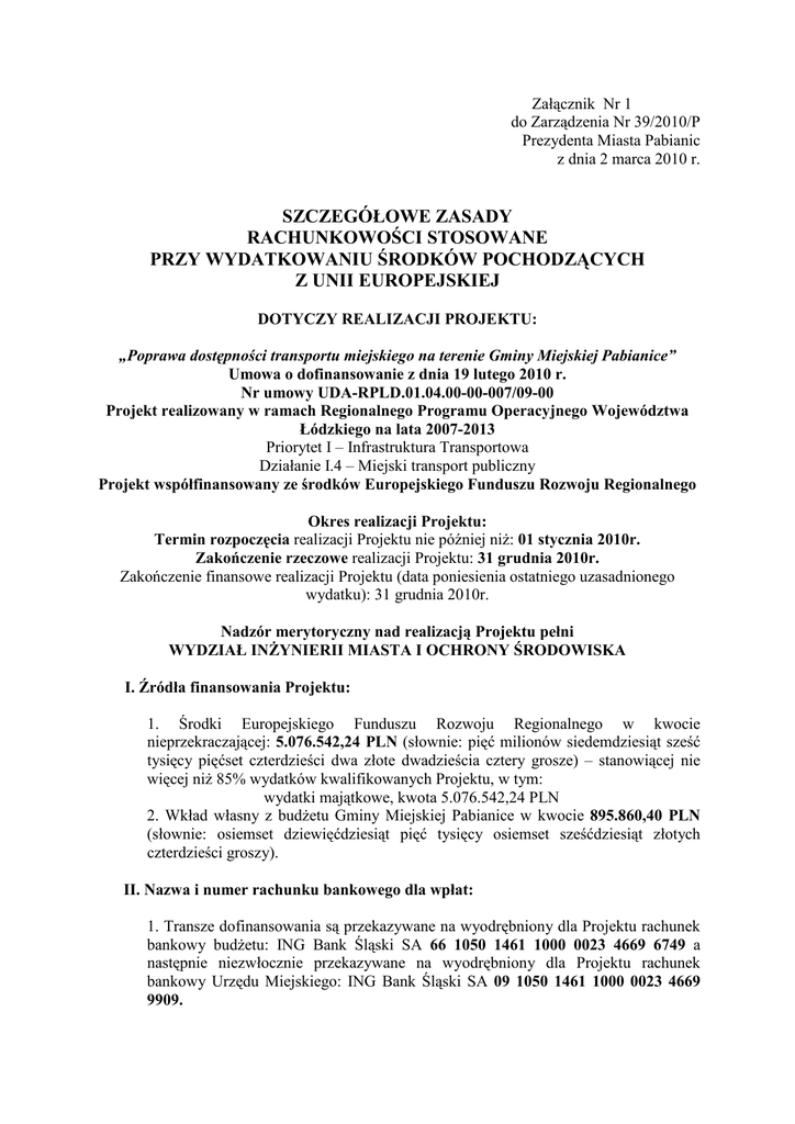 Załącznik Nr 1 do Zarządzenia Nr 39/2010/P Prezydenta Miasta Pabianic z dnia 2 marca 2010 r. SZCZEGÓŁOWE ZASADY RACHUNKOWOŚCI STOSOWANE PRZY WYDATKOWANIU ŚRODKÓW POCHODZĄCYCH Z UNII EUROPEJSKIEJ DOTYCZY REALIZACJI PROJEKTU: „Poprawa dostępności transportu miejskiego na terenie Gminy Miejskiej Pabianice” Umowa o dofinansowanie z dnia 19 lutego 2010 r. Nr umowy UDA-RPLD.01.04.00-00-007/09-00 Projekt realizowany w ramach Regionalnego Programu Operacyjnego Województwa Łódzkiego na lata 2007-2013 Priorytet I – Infrastruktura Transportowa Działanie I.4 – Miejski transport publiczny Projekt współfinansowany ze środków Europejskiego Funduszu Rozwoju Regionalnego Okres realizacji Projektu: Termin rozpoczęcia realizacji Projektu nie później niŜ: 01 stycznia 2010r. Zakończenie rzeczowe realizacji Projektu: 31 grudnia 2010r. Zakończenie finansowe realizacji Projektu (data poniesienia ostatniego uzasadnionego wydatku): 31 grudnia 2010r. Nadzór merytoryczny nad realizacją Projektu pełni WYDZIAŁ INśYNIERII MIASTA I OCHRONY ŚRODOWISKA I. Źródła finansowania Projektu: 1. Środki Europejskiego Funduszu Rozwoju Regionalnego w kwocie nieprzekraczającej: 5.076.542,24 PLN (słownie: pięć milionów siedemdziesiąt sześć tysięcy pięćset czterdzieści dwa złote dwadzieścia cztery grosze) – stanowiącej nie więcej niŜ 85% wydatków kwalifikowanych Projektu, w tym: wydatki majątkowe, kwota 5.076.542,24 PLN 2. Wkład własny z budŜetu Gminy Miejskiej Pabianice w kwocie 895.860,40 PLN (słownie: osiemset dziewięćdziesiąt pięć tysięcy osiemset sześćdziesiąt złotych czterdzieści groszy). II. Nazwa i numer rachunku bankowego dla wpłat: 1. Transze dofinansowania są przekazywane na wyodrębniony dla Projektu rachunek bankowy budŜetu: ING Bank Śląski SA 66 1050 1461 1000 0023 4669 6749 a następnie niezwłocznie przekazywane na wyodrębniony dla Projektu rachunek bankowy Urzędu Miejskiego: ING Bank Śląski SA 09 1050 1461 1000 0023 4669 9909. 2. Wkład własny z budŜetu miasta zostanie przekazany na wyodrębniony rachunek bankowy Urzędu Miejskiego: ING Bank Śląski SA 87 1050 1461 1000 0023 4766 3946. III. Klasyfikacja budŜetowa: Środki finansowe na realizację Projektu zarówno po stronie dochodów jak i wydatków zostają ujęte w klasyfikacji budŜetowej: dział 600 (Transport i łączność), rozdział 60004 (Lokalny transport zbiorowy) i w paragrafie, który zostanie utworzony w następujący sposób: 1) dla dochodów: a) których źródłem są środki z Unii Europejskiej klasyfikując poprzez dopisanie jako czwartej cyfry paragrafu – cyfry 8; b)których źródłem są inne środki (krajowe) przekazywane jako współfinansowanie projektów klasyfikując przez dopisanie jako czwartej cyfry paragrafu – cyfry 9, 2) dla wydatków: a) ponoszonych w trakcie realizacji projektu finansowanego ze środków z Unii Europejskiej klasyfikując do właściwego paragrafu klasyfikacji budŜetowej dopisując, jako czwartą cyfrę paragrafu – cyfrę 8; b) ponoszonych na realizację projektu, którego źródłem są środki finansowe, stanowiące krajowy wkład oraz środki własne miasta klasyfikując do właściwego paragrafu klasyfikacji budŜetowej dopisując jako czwartą cyfrę paragrafu – cyfrę 9. IV. Określenie systemu nadzoru i kontroli w ramach programu operacyjnego: 1) 2) 3) Instytucja płatnicza – Województwo Łódzkie; Instytucja zarządzająca –Zarząd Województwa Łódzkiego; Beneficjent końcowy – Gmina Miejska Pabianice. V. Forma rozliczeń finansowych: 1. Dofinansowanie na realizację Projektu jest wypłacane w wysokości i terminach określonych w harmonogramie płatności stanowiącym załącznik nr 2 do umowy o dofinansowanie. 2. Dofinansowanie jest przekazywane na rachunek bankowy budŜetu. Środki są wydatkowane przez Urząd Miejski w Pabianicach z wyodrębnionego rachunku bankowego. 3. Pierwsza transza dofinansowania wypłacana jest w wysokości i terminie określonym w harmonogramie płatności o którym mowa w pkt 1, natomiast wypłata kolejnych transz jest uzaleŜnione od rozliczenia co najmniej 70% łącznej kwoty przekazanych wcześniej transz oraz od rozliczenia otrzymanej zaliczki. 4. Urząd Miejski w Pabianicach, jako jednostka realizująca Projekt: 1) realizuje wydatki związane z Projektem z wyodrębnionego dla Projektu rachunku bankowego Urzędu Miejskiego na podstawie faktur lub innych dokumentów o równowaŜnej wartości dowodowej, 2) zatwierdza sporządzone przez MenadŜera Projektu „Wnioski beneficjenta o płatność” kolejnych transz dofinansowania, z załączonymi fakturami lub innymi dokumentami o równowaŜnej wartości dowodowej i wyciągi z konta potwierdzające dokonanie przelewu lub inne dowody płatności. 5. Odsetki bankowe od przekazanych transz dofinansowania stanowią dochód własny budŜetu Gminy Miejskiej Pabianice. VI. Zasady kwalifikowalności kosztów Projektu 1. Przez wydatki kwalifikowane naleŜy rozumieć wydatki lub koszty poniesione zgodnie z wytycznymi zawartymi w: 1) zakresie kwalifikowania wydatków w ramach funduszy strukturalnych i Funduszu Spójności w okresie programowania 2007-2013 (Narodowe Strategiczne Ramy Odniesienia 2007-2013) – zamieszczonymi na stronie internetowej Ministerstwa Rozwoju Regionalnego oraz w Biuletynie Informacji Publicznej, 2) dokumencie opublikowanym na stronie internetowej Instytucji Zarządzającej www.rpo.lodzkie.pl, tj. Zasady kwalifikowalności wydatków objętych dofinansowaniem w ramach Regionalnego Programu Operacyjnego Województwa Łódzkiego na lata 2007 – 2013. VII. Obieg, opis i kontrola dokumentów finansowych: 1. Przelewy dotyczące realizacji Projektu są dokonywane elektronicznie przez Urząd Miejski w Pabianicach w systemie bankowym ING Business OnLine na podstawie dokumentów księgowych stwierdzających konieczność dokonania ww. przelewu. Dokumenty powinny być oznaczone zgodnie z zasadami promocji Projektu i zaw