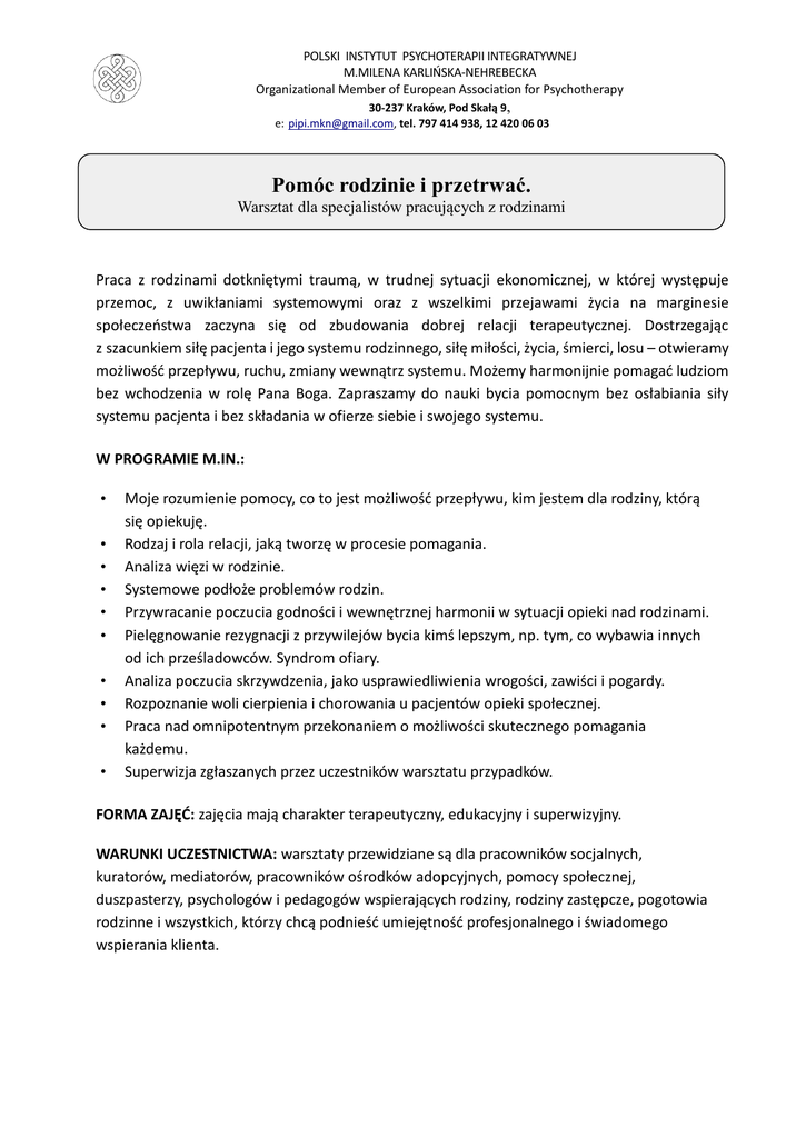 POLSKI INSTYTUT PSYCHOTERAPII INTEGRATYWNEJ M.MILENA KARLIŃSKA-NEHREBECKA Organizational Member of European Association for Psychotherapy 30-237 Kraków, Pod Skałą 9, e: [email protected], tel. 797 414 938, 12 420 06 03 Pomóc rodzinie i przetrwać. Warsztat dla specjalistów pracujących z rodzinami Praca z rodzinami dotkniętymi traumą, w trudnej sytuacji ekonomicznej, w której występuje przemoc, z uwikłaniami systemowymi oraz z wszelkimi przejawami życia na marginesie społeczeństwa zaczyna się od zbudowania dobrej relacji terapeutycznej. Dostrzegając z szacunkiem siłę pacjenta i jego systemu rodzinnego, siłę miłości, życia, śmierci, losu – otwieramy możliwość przepływu, ruchu, zmiany wewnątrz systemu. Możemy harmonijnie pomagać ludziom bez wchodzenia w rolę Pana Boga. Zapraszamy do nauki bycia pomocnym bez osłabiania siły systemu pacjenta i bez składania w ofierze siebie i swojego systemu. W PROGRAMIE M.IN.: • • • • • • • • • • Moje rozumienie pomocy, co to jest możliwość przepływu, kim jestem dla rodziny, którą się opiekuję. Rodzaj i rola relacji, jaką tworzę w procesie pomagania. Analiza więzi w rodzinie. Systemowe podłoże problemów rodzin. Przywracanie poczucia godności i wewnętrznej harmonii w sytuacji opieki nad rodzinami. Pielęgnowanie rezygnacji z przywilejów bycia kimś lepszym, np. tym, co wybawia innych od ich prześladowców. Syndrom ofiary. Analiza poczucia skrzywdzenia, jako usprawiedliwienia wrogości, zawiści i pogardy. Rozpoznanie woli cierpienia i chorowania u pacjentów opieki społecznej. Praca nad omnipotentnym przekonaniem o możliwości skutecznego pomagania każdemu. Superwizja zgłaszanych przez uczestników warsztatu przypadków. FORMA ZAJĘĆ: zajęcia mają charakter terapeutyczny, edukacyjny i superwizyjny. WARUNKI UCZESTNICTWA: warsztaty przewidziane są dla pracowników socjalnych, kuratorów, mediatorów, pracowników ośrodków adopcyjnych, pomocy społecznej, duszpasterzy, psychologów i pedagogów wspierających rodziny, rodziny zastępcze, pogotowia rodzinne i wszystkich, którzy chcą podnieść umiejętność profesjonalnego i świadomego wspierania klienta. 21 – 23 kwiecień 2017 (weekend, 23 godziny akademickie) JAK SIĘ ZAPISAĆ: A. Telefonicznie 1. Wpłać zaliczkę. 2. Zadzwoń do Instytutu na numer: 797 414 938. Podaj swoje dane kontaktowe, wykształcenie oraz nazwę szkolenia. 3. Prześlemy potwierdzenie i inne informacje na Twój adres e-mail. B. Mailowo 1. Wpłać zaliczkę. 2. Napisz do Instytutu na adres [email protected] Prześlemy potwierdzenie i inne informacje na Twój adres e-mail. KOSZT SZKOLENIA: • płatne w ratach, łącznie: 640 zł 250 zł - zaliczka do 21.03.2017 390 zł - do 21.04.2017 (można zapłacić na zajęciach) • lub wczesna wpłata ze zniżką: 540 zł płatne do 21.02.2017 Z uwagi na ograniczoną ilość miejsc decyduje kolejność wpłat. WPŁATY NA KONTO: Polski Instytut Psychoterapii Integratywnej M. Maria Karlińska-Nehrebecka (z dopiskiem: „Rodzina") Bank Millenium 76 1160 2202 0000 0003 1838 8259 INFORMACJE I ZGŁOSZENIA: TEL. 797 414 938, 12 420 06 03, , e-mail: [email protected] PROWADZENIE ZAJĘĆ: lek. med. DAGMARA KUCZYŃSKA-GINKO – psychoterapeuta i superwizor certyfikowany przez Polskie Towarzystwo Psychoterapii Integratywnej, ma też certyfikat psychoterapeuty European Association for Psychotherapy (EAP). Superwizor Certyfikowany przez Polską Federację Psychoterapii. Lekarz. Absolwent Studium Psychoterapii Polskiego Instytutu Psychoterapii Integratywnej. Twórca autorskich programów szkoleniowych. Specjalizuje się w leczeniu zaburzeń jedzenia. Poetka i artysta-grafik. mgr URSZULA WOJCIECHOWSKA-JAWORSKA – certyfikowany psychoterapeuta Polskiego Towarzystwa Psychoterapii Integratywnej oraz European Association for Psychotherapy, superwizor Certyfikowany przez Polską Federację Psychoterapii. Absolwentka Studium Psychoterapii Instytutu. Stały współpracownik Instytutu. Wiele lat była dyrektorem Publicznej Poradni Psychologiczno-Pedagogicznej, obecnie pracuje w Poradni Zdrowia Psychicznego S.P. ZOZ i prowadzi praktykę prywatną.