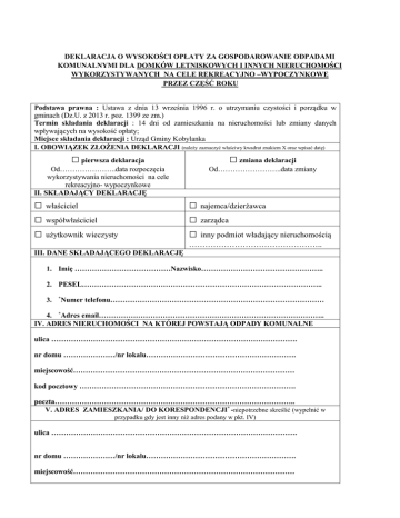 DEKLARACJA O WYSOKOŚCI OPŁATY ZA GOSPODAROWANIE ODPADAMI KOMUNALNYMI DLA DOMKÓW LETNISKOWYCH I INNYCH NIERUCHOMOŚCI WYKORZYSTYWANYCH NA CELE REKREACYJNO –WYPOCZYNKOWE PRZEZ CZĘŚĆ ROKU Podstawa prawna : Ustawa z dnia 13 września 1996 r. o utrzymaniu czystości i porządku w gminach (Dz.U. z 2013 r. poz. 1399 ze zm.) Termin składania deklaracji : 14 dni od zamieszkania na nieruchomości lub zmiany danych wpływających na wysokość opłaty; Miejsce składania deklaracji : Urząd Gminy Kobylanka I. OBOWIĄZEK ZŁOŻENIA DEKLARACJI (należy zaznaczyć właściwy kwadrat znakiem X oraz wpisać datę) □ pierwsza deklaracja Od…………………..data rozpoczęcia wykorzystywania nieruchomości na cele rekreacyjno- wypoczynkowe II. SKŁADAJĄCY DEKLARACJĘ □ właściciel □ współwłaściciel □ użytkownik wieczysty □ zmiana deklaracji Od……………………..data zmiany □ najemca/dzierżawca □ zarządca □ inny podmiot władający nieruchomością ………………………………………….. III. DANE SKŁADAJĄCEGO DEKLARACJĘ 1. Imię …………………………………Nazwisko………………………………………….. 2. PESEL…………………………………………………………………………………….. 3. Numer telefonu…………………………………………………………………………… * 4. *Adres email……………………………………………………………………………….. IV. ADRES NIERUCHOMOŚCI NA KTÓREJ POWSTAJĄ ODPADY KOMUNALNE ulica ………………………………………………………………………………………. nr domu …………………/nr lokalu……………………………………………………. miejscowość……………………………………………………………………………… kod pocztowy ……………………………………………………………………………. poczta…………………………………………………………………………………….. V. ADRES ZAMIESZKANIA/ DO KORESPONDENCJI* -niepotrzebne skreślić (wypełnić w przypadku gdy jest inny niż adres podany w pkt. IV) ulica ………………………………………………………………………………………. nr domu …………………/nr lokalu……………………………………………………. miejscowość……………………………………………………………………………… kod pocztowy ……………………………………/poczta................................................. VI. NA NIERUCHOMOŚCI WSKAZANEJ W PKT. IV PROWADZONA BĘDZIE (właściwe zaznaczyć X) : □ segregacja odpadów □ brak segregacji VII. ROCZNA RYCZAŁTOWA STAWKA OPŁATY DLA NIERUCHOMOŚCI WYKORZYSTYWANYCH NA CELE REKREACYJNE PRZEZ CZĘŚC ROKU ZGODNIE ZE SPOSOBEM POSTĘPOWANIA ZDEKLAROWANYM W PKT. VI WYNOSI (zgodnie z uchwałą w sprawie metody ustalania opłaty za gospodarowanie odpadami oraz stawki opłaty) Segregacja odpadów Brak segregacji odpadów …………………………..zł …………………………..zł VIII. OKRESLENIE MIESIĘCY, W KTÓRYCH NIERUCHOMOŚC JEST WYKORZYSTYWANA NA CELE REKREACYJNE I WYPOCZYNKOWE Miesiące, w których na nieruchomości zamieszkują mieszkańcy (właściwe należy zaznaczyć X) I II III IV V VI VII VIII IX X XI XII *- nieobligatoryjnie MIEJSCOWOŚĆ I DATA …………………………………. PODPIS ……………………………….. IX. ADNOTACJE ORGANU Pouczenie : 1. Niniejsza deklaracja stanowi podstawę prawną do wystawienia tytułu wykonawczego, zgodnie z art. 3a ustawy z dnia 17 czerwca 1996 r. o postepowaniu egzekucyjnym w administracji (Dz.U. z 2014 r., poz. 1619 z późn. zm). 2. W przypadku niezłożenia deklaracji w terminie albo uzasadnionych wątpliwości co do danych zawartych w deklaracji, Wójt Gminy Kobylanka określi w drodze decyzji, wysokość opłaty za gospodarowanie odpadami. Biorąc pod uwagę uzasadnione szacunki, w tym średnią ilość odpadów komunalnych powstających na nieruchomości i podobnym charakterze.