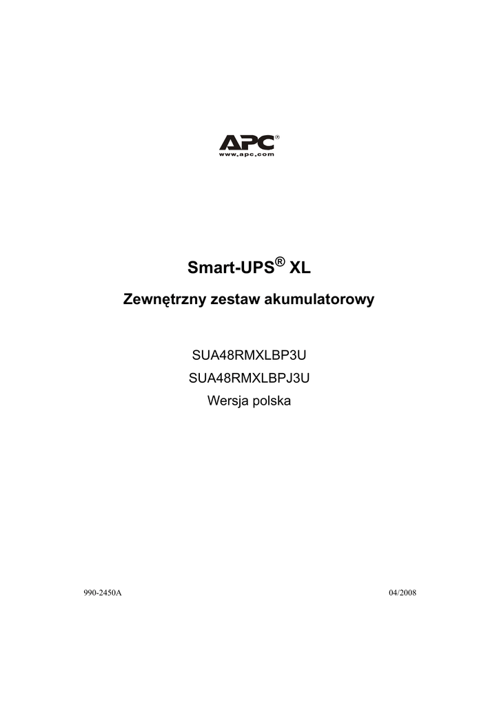 Smart-UPS® XL Zewnętrzny zestaw akumulatorowy SUA48RMXLBP3U SUA48RMXLBPJ3U Wersja polska 990-2450A 04/2008 Wstęp Wstęp Informacje ogólne o urządzeniu Urządzenie SUA48RMXLBP3U/SUA48RMXLBPJ3U należy podłączyć do zasilacza bezprzerwowego APC Smart-UPS XL. Kombinacja tych urządzeń zapewni zabezpieczenie sprzętu elektronicznego przed spadkami, wzrostami i przerwami w dostawie napięcia zasilającego. Rozpakowanie Przed rozpakowaniem urządzenia należy zapoznać się z arkuszem zawierającym instrukcje bezpieczeństwa. Należy sprawdzić urządzenie przy odbiorze. W razie stwierdzenia uszkodzeń należy powiadomić przewoźnika i sprzedawcę. Opakowanie nadaje się do przerobu wtórnego. Należy je zachować do ponownego użycia lub usunąć w sposób zgodny z przepisami. Należy sprawdzić zawartość opakowania, w którym powinny się znajdować: • Zewnętrzny zestaw akumulatorowy wraz z zainstalowanymi dwoma modułami akumulatorowymi • Panel obudowy • Zestaw szyn Pakiet z dokumentacją zawierający: • Dwie klamry do montażu w szafie • Osiem śrub z łbem płaskim • Cztery nakrętki koszyczkowe • Dokumentację produktu • Informacje na temat bezpieczeństwa • Informacje gwarancyjne UWAGA: Numer modelu i numer seryjny znajdują się na małej plakietce na panelu tylnym. W niektórych modelach dodatkowa etykieta znajduje się na obudowie pod przednim panelem. SUA48RMXLBP3U/SUA48RMXLBPJ3U Instrukcja dla użytkownika zewnętrznych zestawów akumulatorowych 3 Dane techniczne Dane techniczne Temperatura Eksploatacji Przechowywania Maksymalna wysokość Eksploatacji Przechowywania Urządzenie przeznaczone jest do użytku w pomieszczeniach od 0° do 40°C (od 32° do 104° F) W temperaturze od -15° do 45°C (od 5° do 113° F) należy zamkniętych. Podłoże w miejscu instalacji musi być odpowiednio ładować akumulatory zasilacza UPS co sześć miesięcy wytrzymałe. 3000 m (10000 stóp) 15240 m (50000 stóp) Zasilacz nie powinien być eksploatowany w pomieszczeniach, w których występuje nadmierne zapylenie, lub w których temperatura i wilgotność wykraczają poza zalecane granice. Należy się upewnić, że odpowietrzniki zasilacza nie są zablokowane. Na żywotność akumulatora mają wpływ czynniki środowiskowe. Wysokie temperatury, niska jakość zasilania sieciowego i częste, szybkie rozładowania powodują skracanie żywotności akumulatora. Wilgotność wilgotność względna od 0 do 95%, bez kondensacji Masa 18 kg (40 funtów) bez modułu akumulatorowego 68 kg (150 funtów) z modułem akumulatorowym 25 kg (55 funtów) bez modułu akumulatorowego Wymiary W x Sz x G 133 mm x 283 mm x 660 mm 5,24 cala x 11,14 cala x 26 cala Maksymalna liczba zewnętrznych pakietów akumulatorowych obsługiwanych przez zasilacz Smart-UPS XL Napięcie 4 68 kg (150 funtów) 10 48 V SUA48RMXLBP3U/SUA48RMXLBPJ3U Instrukcja dla użytkownika zewnętrznych zestawów akumulatorowych Instalacja Instalacja Posiadany model zewnętrznego zestawu akumulatorowego oraz zasilacza UPS może różnić się wyglądem od przykładów przedstawionych w instrukcji. Zasilacz i moduły akumulatorowe są ciężkie. Aby zmniejszyć wagę zasilacza podczas instalacji należy wyjąć moduły akumulatorowe. Montaż szyn w szafie Ten zasilacz jest przystosowany do montażu w szafie 19”. Szczegółowe instrukcje dotyczące montażu szyn znajdują się w dokumentacji dostarczonej w zestawie szyn. Montaż zestawu akumulatorowego w szafie Zewnętrzny zestaw akumulatorowy należy zainstalować na poziomie szafy pod zasilaczem UPS. Zasilacz UPS oraz zewnętrzny zestaw akumulatorowy należy zainstalować na możliwie najniższym poziomie szafy. Jeśli zasilacz UPS oraz zewnętrzny zestaw akumulatorowy trzeba zainstalować w sąsiednich szafach, należy skorzystać z kabli przedłużających zatwierdzonych przez firmę APC. Informacje na temat zamawiania zatwierdzonych kabli znajdują się na stronie firmy APC, www.apc.com. 4x 4x SUA48RMXLBP3U/SUA48RMXLBPJ3U Instrukcja dla użytkownika zewnętrznych zestawów akumulatorowych 5 Instalacja Podłącz zewnętrzne zestawy akumulatorowe Wykręć dwa wkręty mocujące przepust do złącza zewnętrznego akumulatora. 6 Ponownie zainstaluj przepust, mocując go dwoma wkrętami wykręconymi w kroku powyżej. SUA48RMXLBP3U/SUA48RMXLBPJ3U Instrukcja dla użytkownika zewnętrznych zestawów akumulatorowych Instalacja Konfiguracja parametrów UPS To ustawienie ma wpływ na dokładność prognozowanego czasu podtrzymania obliczanego przez zasilacz UPS podczas pracy z zasilaniem akumulatorowym. Modele Smart-UPS XL należy zaprogramować w taki sposób, aby rozpoznawały odpowiednią liczbę podłączonych zewnętrznych zestawów akumulatorowych. Istnieje pięć sposobów konfigurowania zasilacza UPS w taki sposób, aby rozpoznawał liczbę zewnętrznych zestawów akumulatorowych. 1. 2. 3. 4. 5. PowerChute® Business Edition: zob. instrukcje dołączone do oprogramowania. Interfejs sieciowy karty zarządzającej NMC: zob. instrukcje dołączone do karty NMC. Tryb terminalowy karty zarządzającej NMC: zob. instrukcje znajdujące się poniżej. Tryb terminalowy zasilacza UPS. Program narzędziowy dla zestawu akumulatorowego zasilacza Smart-UPS pobrany z witryny internetowej APC: ftp://ftp.apcc.com/apc/public/hardware/smartups/xbattpack/. Konfigurowanie ustawień połączenia UPS za pomocą trybu terminalowego NMC Podłączyć kabel szeregowy do portu szeregowego z tyłu zasilacza UPS. Jeśli do komunikacji z zasilaczem UPS wykorzystywany jest interfejs USB, kabel USB należy odłączyć przed podłączeniem kabla szeregowego. 1. Uruchomić program terminalu, np. HyperTerminal®. Na pulpicie wybrać: Start, Programy, Akcesoria, Komunikacja, HyperTerminal. 2. Postępować według wskazań w celu wybrania nazwy i ikony. Jeżeli zostanie wyświetlony komunikat „...must install a modem” (... musi zainstalować modem), zignorować go, klikając przycisk Cancel (Anuluj). 3. Pr
