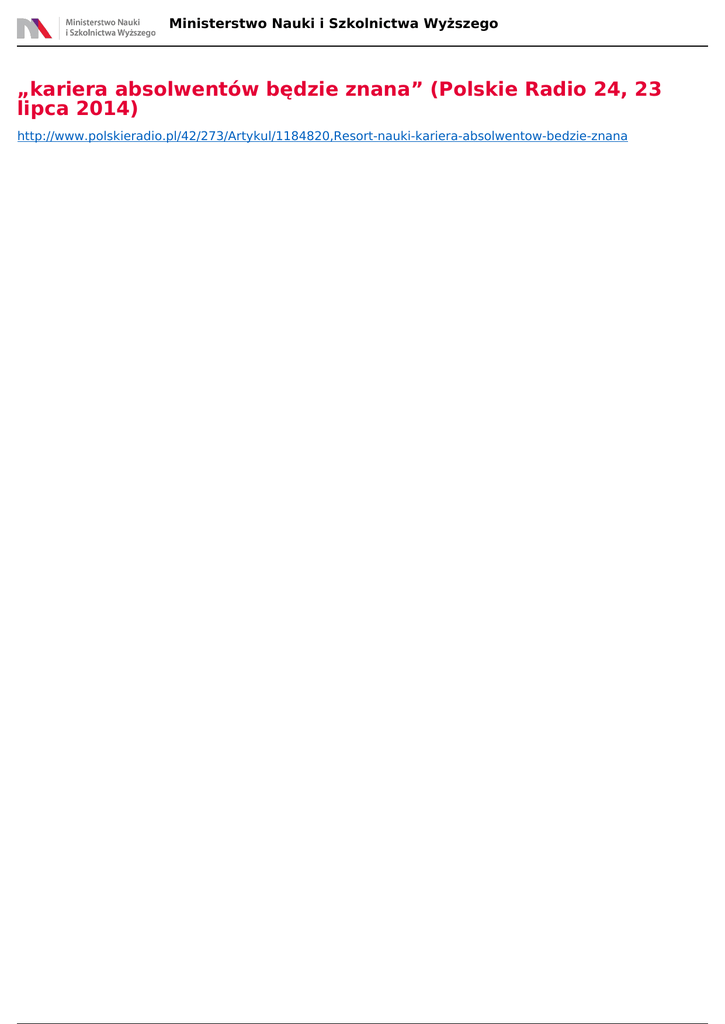 Ministerstwo Nauki i Szkolnictwa Wyższego „kariera absolwentów będzie znana” (Polskie Radio 24, 23 lipca 2014) http://www.polskieradio.pl/42/273/Artykul/1184820,Resort-nauki-kariera-absolwentow-bedzie-znana Powered by TCPDF (www.tcpdf.org)