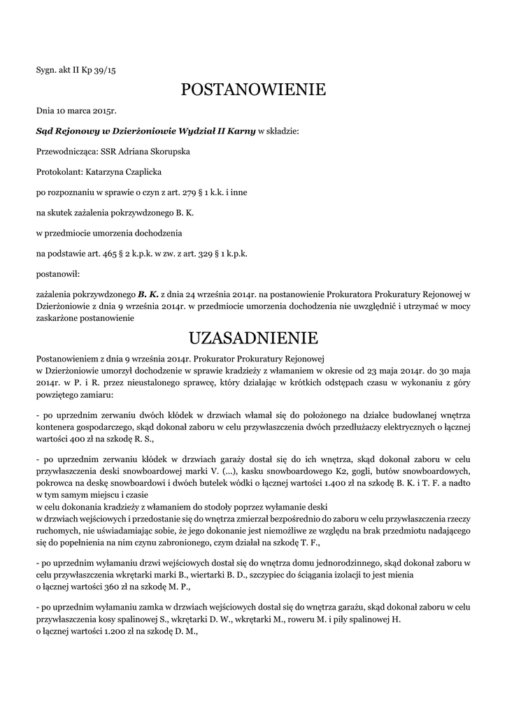 Sygn. akt II Kp 39/15 POSTANOWIENIE Dnia 10 marca 2015r. Sąd Rejonowy w Dzierżoniowie Wydział II Karny w składzie: Przewodnicząca: SSR Adriana Skorupska Protokolant: Katarzyna Czaplicka po rozpoznaniu w sprawie o czyn z art. 279 § 1 k.k. i inne na skutek zażalenia pokrzywdzonego B. K. w przedmiocie umorzenia dochodzenia na podstawie art. 465 § 2 k.p.k. w zw. z art. 329 § 1 k.p.k. postanowił: zażalenia pokrzywdzonego B. K. z dnia 24 września 2014r. na postanowienie Prokuratora Prokuratury Rejonowej w Dzierżoniowie z dnia 9 września 2014r. w przedmiocie umorzenia dochodzenia nie uwzględnić i utrzymać w mocy zaskarżone postanowienie UZASADNIENIE Postanowieniem z dnia 9 września 2014r. Prokurator Prokuratury Rejonowej w Dzierżoniowie umorzył dochodzenie w sprawie kradzieży z włamaniem w okresie od 23 maja 2014r. do 30 maja 2014r. w P. i R. przez nieustalonego sprawcę, który działając w krótkich odstępach czasu w wykonaniu z góry powziętego zamiaru: - po uprzednim zerwaniu dwóch kłódek w drzwiach włamał się do położonego na działce budowlanej wnętrza kontenera gospodarczego, skąd dokonał zaboru w celu przywłaszczenia dwóch przedłużaczy elektrycznych o łącznej wartości 400 zł na szkodę R. S., - po uprzednim zerwaniu kłódek w drzwiach garaży dostał się do ich wnętrza, skąd dokonał zaboru w celu przywłaszczenia deski snowboardowej marki V. (...), kasku snowboardowego K2, gogli, butów snowboardowych, pokrowca na deskę snowboardowi i dwóch butelek wódki o łącznej wartości 1.400 zł na szkodę B. K. i T. F. a nadto w tym samym miejscu i czasie w celu dokonania kradzieży z włamaniem do stodoły poprzez wyłamanie deski w drzwiach wejściowych i przedostanie się do wnętrza zmierzał bezpośrednio do zaboru w celu przywłaszczenia rzeczy ruchomych, nie uświadamiając sobie, że jego dokonanie jest niemożliwe ze względu na brak przedmiotu nadającego się do popełnienia na nim czynu zabronionego, czym działał na szkodę T. F., - po uprzednim wyłamaniu drzwi wejściowych dostał się do wnętrza domu jednorodzinnego, skąd dokonał zaboru w celu przywłaszczenia wkrętarki marki B., wiertarki B. D., szczypiec do ściągania izolacji to jest mienia o łącznej wartości 360 zł na szkodę M. P., - po uprzednim wyłamaniu zamka w drzwiach wejściowych dostał się do wnętrza garażu, skąd dokonał zaboru w celu przywłaszczenia kosy spalinowej S., wkrętarki D. W., wkrętarki M., roweru M. i piły spalinowej H. o łącznej wartości 1.200 zł na szkodę D. M., - w zamiarze dokonania kradzieży z włamaniem do lombardu poprzez uprzednie zerwanie kłódki w drzwiach komórki a następne w jej wnętrzu wybicie otworu w ścianie i przedostanie się przez powstały otwór do wnętrza lombardu zmierzał bezpośrednio do zaboru w celu przywłaszczenia rzeczy ruchomych, który nie nastąpił z uwagi na spłoszenie sprawcy przez załączenie alarmu, czym działał na szkodę A. L.i M. S. (1), - po uprzednim odgięciu dolnej części jednego ze skrzydeł drzwi włamał się do garażu, skąd dokonał zaboru w celu przywłaszczenia przedłużaczy elektrycznych, metalowej puszki z kształtkami hydraulicznymi o wartości 400 zł na szkodę W. S. tj. o czyn z art. 279 § 1 k.k. i art. 13 § 1 k.k. w zw. z art. 279 § 1 k.k. i art. 13 § 2 k.k. w zw. z art. 279 § 1 k.k. w zw. z art. 12 k.k. wobec niewykrycia sprawcy przestępstwa. Na powyższe postanowienie w dniu 24 września 2014r. wniósł zażalenie pokrzywdzony B. K. zaskarżając postanowienie w całości i wnosząc o uchylenie zaskarżonego postanowienia i przekazanie sprawy do dalszego prowadzenia. W uzasadnieniu podnosił, iż zaskarżone postanowienie jest nieprawidłowe i przedwczesne, bowiem z informacji uzyskanych telefonicznie od prowadzącego postępowanie przygotowawcze wynikało, że na terenie P. odnaleziono pochodzące z kradzieży rzeczy, w tym m.in. deskę snowboardową i duże lustro. Opis przedmiotowej deski przedstawiony przez pokrzywdzonego T. F. nie odpowiadał opisowi przedstawionemu przez policjanta, odnośnie natomiast lustra ustalenia były odmienne. Skarżący wskazał, że z wnętrza stodoły zginęło w dniu włamania duże kryształowe lustro oprawione w brązową drewnianą ramę, stanowiące jeden z elementów składowych mebli, zwiezionych do stodoły krótko przed włamaniem oraz od tego czasu znajdujących się tam nadal. Szacunkową wartość lustra określono na 600 – 700 zł. Z uwagi na fakt, że meble były opakowane i zabezpieczone przed uszkodzeniem, w dniu włamania nie zauważono jego braku, dopiero ponowne oględziny mebli potwierdziły brak również lustra. Dlatego też w ocenie skarżącego zasadnym jest powiązanie obu postępowań w jedno, a następnie dalsze jego prowadzenie w celu wykrycia i ukarania sprawców. W tym celu skarżący wniósł o umożliwienie oględzin rzeczy w postaci lustra, przesłuchanie właściciela pomieszczenia, w którym odnaleziono skradzione rzeczy, a w oparciu o uzyskane zeznania poczynienie dalszych ustaleń m.in. w jaki sposób wszedł w posiadanie skradzionych rzeczy (w tym lustra), ustalenie ewentualnych osób, które mu ich dostarczyły, a następnie przesłuchanie tych osób. We wniosku z dnia 28 stycznia 2015r. Prokurator Rejonowy w Dzierżoniowie zwrócił się o nieuwzględnienie zażalenia na postanowienie w przedmiocie umorzenia dochodzenia i utrzymanie w mocy przedmiotowego postanowienia. W ocenie Sądu zażalenie nie zasługuje na uwzględnienie. Sąd rozpoznając zażalenie pokrzywdzonego podzielił w pełni stanowisko Prokuratora Prokuratury Rejonowej w Dzierżoniowie, iż decyzja procesowa o umorzeniu dochodzenia podjęta przez ten organ jest w pełni zasadna i odpowiada prawu. Postępowanie przygotowawcze po złożeniu przez B. K. zażalenia zostało uzupełnione poprzez przeprowadzenie czynności wnioskowanych przez skarżącego, a mianowicie ponowne przesłuchanie w charakterze świadka B
