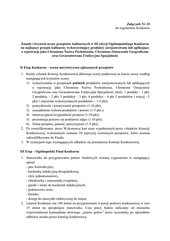 Załącznik Nr 10 do regulaminu Konkursu Zasady i kryteria oceny przepisów kulinarnych w III edycji Ogólnopolskiego Konkursu na najlepszy przepis kulinarny wykorzystujący produkty zarejestrowane lub aplikujące o rejestrację jako Chroniona Nazwa Pochodzenia, Chronione Oznaczenie Geograficzne oraz Gwarantowana Tradycyjna Specjalność II Etap Konkursu – ocena merytoryczna zgłoszonych przepisów 1. Każdy członek Komisji Konkursowej dokonuje oceny punktowej na karcie oceny według następujących kryteriów oceny: 1) wykorzystanie w przepisach polskich produktów zarejestrowanych lub aplikujących o rejestrację jako Chroniona Nazwa Pochodzenia, Chronione Oznaczenie Geograficzne oraz Gwarantowana Tradycyjna Specjalność (ilość: 1 produkt – 1 pkt; 2 produkty – 2 pkt; 3 produkty – 3 pkt; 4 produkty – 4 pkt 5 produktów i więcej - 5 pkt) i znaczenie wykorzystanych produktów – 1-5 pkt); 2) pomysłowość i kreatywność przepisów (1-10 pkt); 3) uzasadnienie wyboru produktów i potraw (1-5 pkt.); 4) innowacyjność/oryginalność przepisu (1-10 pkt); 5) prezentacja potrawy na podstawie zdjęć (1-10 pkt); 6) forma przepisu, jasność, precyzyjność (1-5 pkt); 2. Po zweryfikowaniu przez Wykonawcę kart ocen wypełnionych przez członków Komisji Konkursowej, wyłonionych zostanie 10 najwyżej ocenionych przepisów, które zostaną zakwalifikowane do Finału. 3. W sytuacjach tego wymagających odbędzie się posiedzenie Komisji Konkursowej. III Etap – Ogólnopolski Finał Konkursu 1. Stanowiska do przygotowania potraw finałowych zostaną wyposażone w następujący sprzęt: - piec konwekcyjny, - kuchenkę indukcyjną dwupalnikową, - zlew jednokomorowy, - chłodziarkę i zamrażarkę (wspólna), - garnki i miski do kuchenek indukcyjnych, - podstawowe noże, - blender, - dostęp do maszynki elektrycznej do mięsa. 2. Laureat Konkursu ma 180 minut na przygotowanie 4 porcji potrawy konkursowej w tym 15 minut na sprzątnięcie stanowiska. Czas pracy będzie naliczany od momentu wypowiedzenia komunikatu słownego „jestem gotów” przez uczestnika po uprzednim odbiorze stoiska przez komisję konkursową. 3. Do przygotowania potrawy finałowej dopuszczone jest korzystanie z wcześniej przygotowanych przez Laureata Konkursu: 1) obranych warzyw i owoców; 2) dekoracji (wyłącznie jadalnych); 3) baz sosów; 4) własnego jednego urządzenia elektrycznego typu mikser, malakser, blender; 5) własnego (odpowiednio oznakowanego) drobnego sprzętu. 4. Każdy członek Komisji Konkursowej dokonuje oceny punktowej dania (od 1 do 10 pkt) na karcie oceny według następujących kryteriów: 1) pomysłowość i kreatywność przepisu; 2) walory organoleptyczne potraw (smak, zapach, wygląd); 3) dobór składników/kompozycja; 4) pracochłonność potrawy; 5) prezentacja /wygląd /estetyka. 5. Każdy członek Komisji Technicznej dokonuje oceny punktowej procesu przygotowywania potrawy finałowej (od 1 do 5 pkt): 1) przygotowanie stanowiska pracy, produktów, narzędzi; 2) czystość pracy/dbałość o surowce 3) zachowanie prawidłowych technik kulinarnych/procesów technologicznych; 4) przestrzeganie receptury; 5) sprzątnięcie stanowiska; 6) brak opóźnień w czasie pracy - za każde 5 minut opóźnienia odejmowane będą 3 punkty techniczne. 6. Po weryfikacji przez Wykonawcę kart ocen, wypełnionych przez członków Komisji Konkursowej oraz Komisji Technicznej, zostaną wyłonione zwycięskie przepisy (miejsce I, II, III). Wybór zwycięskich przepisów odbędzie się na posiedzeniu Komisji Konkursowej podczas Finału w obecności co najmniej pięciu członków. Posiedzenie jest niejawne, odbywa się bez udziału osób trzecich. 2