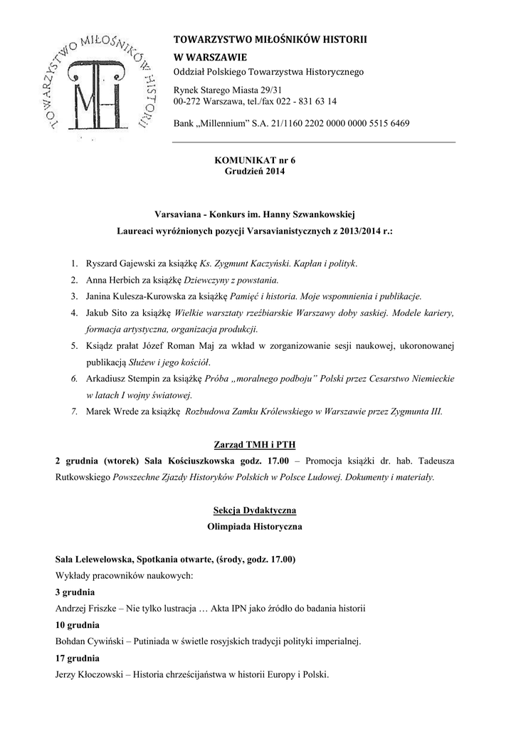 TOWARZYSTWO MIŁOŚNIKÓW HISTORII W WARSZAWIE Oddział Polskiego Towarzystwa Historycznego Rynek Starego Miasta 29/31 00-272 Warszawa, tel./fax 022 - 831 63 14 Bank „Millennium” S.A. 21/1160 2202 0000 0000 5515 6469 KOMUNIKAT nr 6 Grudzień 2014 Varsaviana - Konkurs im. Hanny Szwankowskiej Laureaci wyróżnionych pozycji Varsavianistycznych z 2013/2014 r.: 1. Ryszard Gajewski za książkę Ks. Zygmunt Kaczyński. Kapłan i polityk. 2. Anna Herbich za książkę Dziewczyny z powstania. 3. Janina Kulesza-Kurowska za książkę Pamięć i historia. Moje wspomnienia i publikacje. 4. Jakub Sito za książkę Wielkie warsztaty rzeźbiarskie Warszawy doby saskiej. Modele kariery, formacja artystyczna, organizacja produkcji. 5. Ksiądz prałat Józef Roman Maj za wkład w zorganizowanie sesji naukowej, ukoronowanej publikacją Służew i jego kościół. 6. Arkadiusz Stempin za książkę Próba „moralnego podboju” Polski przez Cesarstwo Niemieckie w latach I wojny światowej. 7. Marek Wrede za książkę Rozbudowa Zamku Królewskiego w Warszawie przez Zygmunta III. Zarząd TMH i PTH 2 grudnia (wtorek) Sala Kościuszkowska godz. 17.00 – Promocja książki dr. hab. Tadeusza Rutkowskiego Powszechne Zjazdy Historyków Polskich w Polsce Ludowej. Dokumenty i materiały. Sekcja Dydaktyczna Olimpiada Historyczna Sala Lelewelowska, Spotkania otwarte, (środy, godz. 17.00) Wykłady pracowników naukowych: 3 grudnia Andrzej Friszke – Nie tylko lustracja … Akta IPN jako źródło do badania historii 10 grudnia Bohdan Cywiński – Putiniada w świetle rosyjskich tradycji polityki imperialnej. 17 grudnia Jerzy Kłoczowski – Historia chrześcijaństwa w historii Europy i Polski. Sekcja Historii Warszawy 2 grudnia (wtorek) godz. 17.30 Sala Konferencyjna Biblioteki Publicznej m.st. Warszawy (ul. Koszykowa 26/28, wejście III, Gmach Kierbedziów) – spotkanie z Jerzym Bogdanem Raczkiem, autorem książki Transatlantycka Radiotelegraficzna Centrala Nadawcza w Babicach. Spotkanie jest współorganizowane z działem Varsavianów Biblioteki Publicznej m.st. Warszawy. Komisja Biografistyki i Studiów Krytycznych 17 grudnia (środa) godz. 17.00 Muzeum Niepodległości (Al. Solidarności 62) – Spotkanie nt. Polityka morska i rzeczna Eugeniusza Kwiatkowskiego i jego kontynuatorów. Wystąpienia: Wacław Kowalski, M.M. Drozdowski. Sekcja Antropologii Historycznej 4 grudnia (czwartek), godz. 18.30 (Sala Kościuszkowska) – Promocja Polski w latach trzydziestych. XX wieku w przewodnikach dla obcokrajowców. – wystąpienie Marii Pawlak (IH UW). 17 grudnia (środa), godz. 18.30 (Sala Kościuszkowska) – Król i Ciało Chrystusa. Transpersonalne znaczenie przyjęcia komunii przez średniowiecznego władcę, czyli o teologii politycznej raz jeszcze. – wystąpienie Pawła Figurskiego (IH UW). Konkurs im. Stanisława Herbsta Polskie Towarzystwo Historyczne i Towarzystwo Miłośników Historii w Warszawie zapraszają tegorocznych absolwentów studiów wyższych i ich opiekunów naukowych do nadsyłania prac magisterskich na kolejną edycję konkursu o nagrodę im. Profesora Stanisława Herbsta dla najlepszych prac magisterskich z historii Polski w dziedzinach: historia kultury, historia miast i historia wojskowości. Termin składania prac z opiniami promotorów upływa 31 stycznia 2015 r. Zarząd TMH 16 grudnia (wtorek) 17.00 Sala Kościuszkowska - Opłatek TMH i Komisji Zakładowej Solidarności IH PAN. Przypominamy o płaceniu składek członkowskich (Studenci, emeryci 25 zł, pozostali 50 zł) Sekretarz organizacyjny /-/Dr Maria Wiśniewska Prezes TMH /-/Prof. dr hab. Andrzej Rachuba