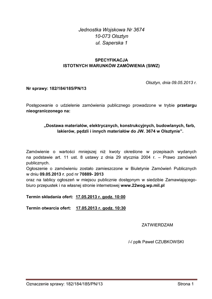 Jednostka Wojskowa Nr 3674 10-073 Olsztyn ul. Saperska 1 SPECYFIKACJA ISTOTNYCH WARUNKÓW ZAMÓWIENIA (SIWZ) Olsztyn, dnia 09.05.2013 r. Nr sprawy: 182/184/185/PN/13 Postępowanie o udzielenie zamówienia publicznego prowadzone w trybie przetargu nieograniczonego na: „Dostawa materiałów, elektrycznych, konstrukcyjnych, budowlanych, farb, lakierów, pędzli i innych materiałów do JW. 3674 w Olsztynie”. Zamówienie o wartości mniejszej niż kwoty określone w przepisach wydanych na podstawie art. 11 ust. 8 ustawy z dnia 29 stycznia 2004 r. – Prawo zamówień publicznych. Ogłoszenie o zamówieniu zostało zamieszczone w Biuletynie Zamówień Publicznych w dniu 09.05.2013 r. pod nr 70889- 2013 oraz na tablicy ogłoszeń w miejscu publicznie dostępnym w siedzibie Zamawiającegobiuro przepustek i na własnej stronie internetowej www.22wog.wp.mil.pl Termin składania ofert: 17.05.2013 r. godz. 10:00 Termin otwarcia ofert: 17.05.2013 r. godz. 10:30 ZATWIERDZAM /-/ ppłk Paweł CZUBKOWSKI Oznaczenie sprawy: 182/184/185/PN/13 Strona 1 NAZWA ORAZ ADRES ZAMAWIAJĄCEGO I. Jednostka Wojskowa 3674 ul. Saperska 1, 10-073 Olsztyn tel: 89 542 28 11, fax: 89 542 34 50 e-mail: [email protected] strona internetowa: www.22wog.wp.mil.pl NIP: 739-38-27-791 TRYB UDZIELENIA ZAMÓWIENIA II. Postępowanie o udzielenie zamówienia publicznego prowadzone jest w trybie przetargu nieograniczonego zgodnie z przepisami ustawy z 29 stycznia 2004r. Prawo zamówień publicznych (tekst jednolity Dz. U. z 2010 r. Nr 113, poz. 759 ze zmian.), zwanej dalej „ustawą”. III. OPIS PRZEDMIOTU ZAMÓWIENIA 1. Przedmiotem zamówienia jest Dostawa materiałów, elektrycznych, budowlanych, farb, lakierów, pędzli i innych materiałów do JW. 3674 w Olsztynie” w ilościach i asortymencie zawartym w poniższych tabelach: Część I – Materiały elektryczne L.p. 1 2 3 4 5 6 7 8 9 10 Przedmiotu zamówienia –opis i min. parametry Gwarancja J.m. Ilość Bezpiecznik mocy WT-00/gG, 50A. Wkładka topikowa przemysłowa zwłoczna. Bezpiecznik mocy WT-00C/gG, 40A. Wkładka topikowa przemysłowa zwłoczna. Bezpiecznik mocy, wkładka przemysłowa OEZ, PN000 gG do RBK000 - 40A. Bezpiecznik mocy, wkładka przemysłowa OEZ, PN000 gGdo RBK000 - 50A. Gniazdo n/t, hermetyczne, podwójne, 230V, prostokątne, kolor gniazda: biały, kolor klapki: biały, z uziemieniem (stykiem). Gniazdo n/t hermetyczne, pojedyncze 230V, kwadratowe, kolor gniazda: biały, kolor klapki: biały, z uziemieniem (stykiem). Gniazdo p/t, podwójne, 16A/250V, prostokątne, kolor: biały, z uziemieniem (stykiem). Gniazdo p/t, podwójne, 16A/230V, prostokątne, kolor: biały, z uziemieniem (stykiem). Korytko kablowe, kanał elektroinstalacyjny, rozm. 20x18, mateirał: twarde PCV, kolor biały. Korytko kablowe, kanał elektroinstalacyjny, rozm. 50x18, materiał: twarde PCV, kolor biały. 12 m-cy szt. 40 12 m-cy szt. 40 12 m-cy szt. 20 12 m-cy szt. 20 12 m-cy szt. 130 12 m-cy szt. 130 12 m-cy szt. 80 12 m-cy szt. 30 12 m-cy mb 80 12 m-cy mb 50 Oznaczenie sprawy: 182/184/185/PN/13 Strona 2 11 12 13 14 15 16 17 18 19 20 21 22 23 24 25 26 Korytko kablowe, kanał elektroinstalacyjny, rozm. 50x20, materiał: twarde PCV, kolor biały. Lampa metalohalogenkowa MHN-TD,150W/842 RX7S lub równoważna co do parametrów. Temepratura barwowa: 4200K, lampa metalohalogenkowa z tradycyjnym jarznikiem kwarcowym i filtrem UV. Wraz z kartką katalogową. Lampa metalohalogenkowa, MHN-TD, 70W/842 RX7S lub równoważna co do parametrów. Temperatura barwowa: 4200K, lampa metalohalogenkowa z tradycyjnym jarznikiem kwarcowym i filtrem UV. Wraz z kartą katalogową. Lampa rtęciowa LRF 125W, typ trzonka: E27, bańka eliptyczna, barwa światła: chłodnobiała. Lampa rtęciowa LRF 250W, typ trzonka: E40, bańka eliptyczna, barwa światła: chłodnobiała. Lampa sodowa WLS, 100W, typ trzonka: E40, lampa tubularna, wyładowcza, barwa światła: ciepła. 12 m-cy mb 20 12 m-cy szt. 2 12 m-cy szt. 2 12 m-cy szt. 80 12 m-cy szt. 40 12 m-cy szt. 40 Lampa sodowa WLS 150W, typ trzonka: E40, lampa tubularna, wyładowcza, barwa światła: ciepła. 12 m-cy szt. 90 Lampa sodowa WLS, 250W, typ trzonka: E40, lampa tubularna, wyładowcza, barwa światła: ciepła. Lampa sufitowa, wisząca (bilardowa), szerokość 170cm, wysokość: 100-200cm, źródło światła: E27, moc: 60W, ilość źródeł światła: 4, kolor metalu: patyna. Lampa żarowo - rtęciowa, mieszana HWL. Moc 160W, typ trzonka: E27, napięcie 235V, barwa światła: ciepła. Lampa żarowo - rtęciowa MIX, moc 125W, typ trzonka: E27. Lampa żarowo - rtęciowa MIX, moc 160W, typ trzonka: E40. Lampka biurkowa. Napięcie 230V (12Vtransformator wbudowany). Materiał: metal. Źródło światła: 1xGY 6,35, 35W (żarówka halogenowa - w komplecie). Klasa ochronności II. Wymiary: wysokość 50 cm, szerokość 15cm, głębokość 35cm. Kolor: stare złoto. Podstawa okrągła. Wraz z kartą katalogową. Listwa zaciskowa, 12 torowa, 2,5mm2. Do połączenia torów elektrycznych w różnego rodzaju urządzeniach. Listwy zaciskowa, 12 torowa, 4mm2. Do połączenia torów elektrycznych w różnego rodzaju urządzeniach. Listwa zaciskowa, 12 torowa, 6mm2. Do połączenia torów elektrycznych w różnego rodzaju urządzeniach. 12 m-cy szt. 20 12 m-cy szt. 2 12 m-cy szt. 40 12 m-cy szt. 30 12 m-cy szt. 10 12 m-cy szt. 25 12 m-cy szt. 20 12 m-cy szt. 20 12 m-cy szt. 20 Oznaczenie sprawy: 182/184/185/PN/13 Strona 3 27 28 29 30 31 32 33 34 35 36 Listwa zaciskowa, 12 torowa, 10mm2. Do połączenia torów elektrycznych w różnego rodzaju urządzeniach. Listwa zaciskowa 12 torowa, 16mm2. Do połączenia torów elektrycznych w różnego rodzaju urządzeniach. Łącznik biały, pojedynczy, hermetyczny, napięcie znamionowe 250V, prąd znamionowy 10A. Oprawa oświetleniowa hermetyczna 2x36W, IP65. Oprawa na dwie świetlówki 36W (120cm), klosz: polistyren, typ świetlówki T8. Wraz z kartką katalogową. Oprawa oświetleniowa rastrowa 2x36W, natynkowa. Podstawa wykona