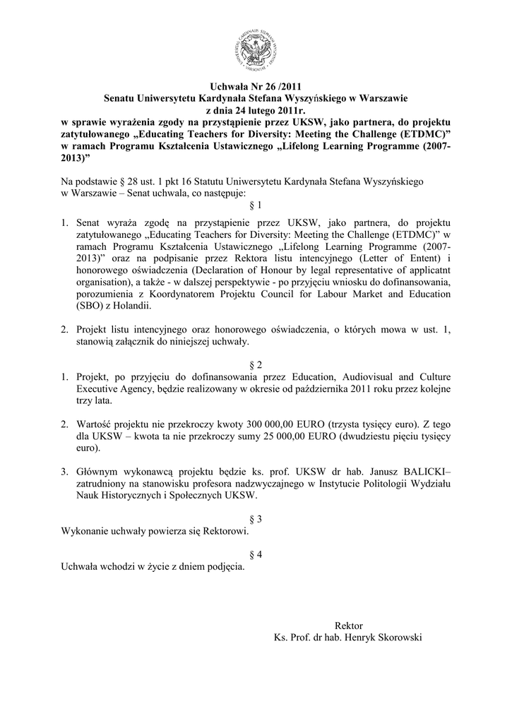 Uchwała Nr 26 /2011 Senatu Uniwersytetu Kardynała Stefana Wyszyńskiego w Warszawie z dnia 24 lutego 2011r. w sprawie wyrażenia zgody na przystąpienie przez UKSW, jako partnera, do projektu zatytułowanego „Educating Teachers for Diversity: Meeting the Challenge (ETDMC)” w ramach Programu Kształcenia Ustawicznego „Lifelong Learning Programme (20072013)” Na podstawie § 28 ust. 1 pkt 16 Statutu Uniwersytetu Kardynała Stefana Wyszyńskiego w Warszawie – Senat uchwala, co następuje: §1 1. Senat wyraża zgodę na przystąpienie przez UKSW, jako partnera, do projektu zatytułowanego „Educating Teachers for Diversity: Meeting the Challenge (ETDMC)” w ramach Programu Kształcenia Ustawicznego „Lifelong Learning Programme (20072013)” oraz na podpisanie przez Rektora listu intencyjnego (Letter of Entent) i honorowego oświadczenia (Declaration of Honour by legal representative of applicatnt organisation), a także - w dalszej perspektywie - po przyjęciu wniosku do dofinansowania, porozumienia z Koordynatorem Projektu Council for Labour Market and Education (SBO) z Holandii. 2. Projekt listu intencyjnego oraz honorowego oświadczenia, o których mowa w ust. 1, stanowią załącznik do niniejszej uchwały. §2 1. Projekt, po przyjęciu do dofinansowania przez Education, Audiovisual and Culture Executive Agency, będzie realizowany w okresie od października 2011 roku przez kolejne trzy lata. 2. Wartość projektu nie przekroczy kwoty 300 000,00 EURO (trzysta tysięcy euro). Z tego dla UKSW – kwota ta nie przekroczy sumy 25 000,00 EURO (dwudziestu pięciu tysięcy euro). 3. Głównym wykonawcą projektu będzie ks. prof. UKSW dr hab. Janusz BALICKI– zatrudniony na stanowisku profesora nadzwyczajnego w Instytucie Politologii Wydziału Nauk Historycznych i Społecznych UKSW. §3 Wykonanie uchwały powierza się Rektorowi. §4 Uchwała wchodzi w życie z dniem podjęcia. Rektor Ks. Prof. dr hab. Henryk Skorowski