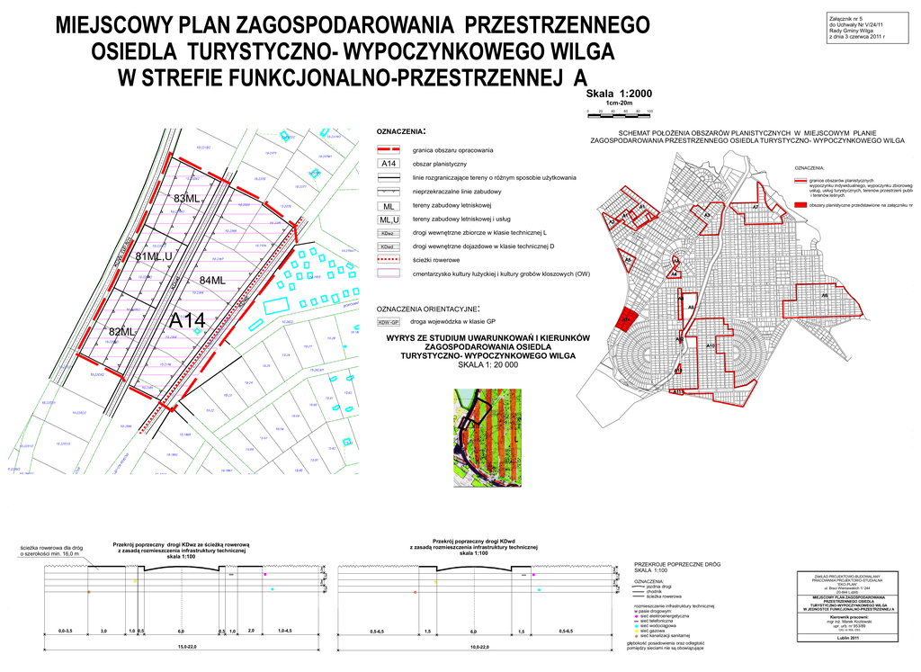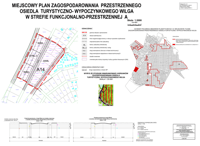 MIEJSCOWY PLAN ZAGOSPODAROWANIA PRZESTRZENNEGO OSIEDLA TURYSTYCZNO- WYPOCZYNKOWEGO WILGA W STREFIE FUNKCJONALNO-PRZESTRZENNEJ ASkala 1:2000 1cm-20m 0 OZNACZENIA: 20 40 60 80 KDwdZałącznik nr 5 do Uchwały Nr V/24/11 Rady Gminy Wilga z dnia 3 czerwca 2011 r KDwd 51UT,U A8 50ML 10 0 KDwd SCHEMAT POŁOŻENIA OBSZARÓW PLANISTYCZNYCH W MIEJSCOWYM PLANIE ZAGOSPODAROWANIA PRZESTRZENNEGO OSIEDLA TURYSTYCZNO- WYPOCZYNKOWEGO WILGA 52UT,U granica obszaru opracowania A14 A9 obszar planistyczny OZNACZENIA: linie rozgraniczające tereny o różnym sposobie użytkowania nieprzekraczalne linie zabudowy 83ML ML ML,U tereny zabudowy letniskowej obszary planistyczne przedstawione na załączniku nr 5 53UT tereny zabudowy letniskowej i usług KDwz drogi wewnętrzne zbiorcze w klasie technicznej L KDwd drogi wewnętrzne dojazdowe w klasie technicznej D . 81ML,U ścieżki rowerowe cmentarzysko kultury łużyckiej i kultury grobów kloszowych (OW) 84ML 54U,Ks,E OZNACZENIA ORIENTACYJNE: KDW -GP KDwz KDwz KDwz A14 82ML granice obszarów planistycznych wypoczynku indywidualnego, wypoczynku zbiorowego, usług, usług turystycznych, terenów przestrzeni publiczne i terenów leśnych droga wojewódzka w klasie GP WYRYS ZE STUDIUM UWARUNKOWAŃ I KIERUNKÓW ZAGOSPODAROWANIA OSIEDLA TURYSTYCZNO- WYPOCZYNKOWEGO WILGA SKALA 1: 20 000 KDwd 80ML 56UT KDwd KDwd 79RL A12 ścieżka rowerowa dla dróg o szerokości min. 16,0 m r r 0,0-3,5 Przekrój poprzeczny drogi KDwd z zasadą rozmieszczenia infrastruktury technicznej skala 1:100 Przekrój poprzeczny drogi KDwz ze ścieżką rowerową z zasadą rozmieszczenia infrastruktury technicznej skala 1:100 r 3,0 r 1,0 0,5 r r 6,0 15,0-22,0 0,5 r r 1,0 r 2,0 r 1,0-4,5 r r r r r r r r r r r r r r 0,5-6,5 r 1,5 r 6,0 10,0-22,0 r 1,5 r 0,5-6,5 r r PRZEKROJE POPRZECZNE DRÓG SKALA 1:100 OZNACZENIA: jezdnia drogi chodnik ścieżka rowerowa rozmieszczenie infrastruktury technicznej w pasie drogowym: sieć elektroenergetyczna sieć telefoniczna sieć wodociągowa sieć gazowa sieć kanalizacji sanitarnej głębokość posadowienia oraz odległość pomiędzy sieciami nie są obowiązujące ZAKŁAD PROJEKTOWO-BUDOWALANY PRACOWANIA PROJEKTOWO-STUDIALNA “EKO-PLAN” ul. Braci Wieniawskich 1/ 244 20-844 Lublib MIEJSCOWY PLAN ZAGOSPODAROWANIA PRZESTRZENNEGO OSIEDLA TURYSTYCZNO-WYPOCZYNKOWEGO WILGA W JEDNOSTCE FUNKCJONALNO-PRZESTRZENNEJ A Kierownik pracowni: mgr inż. Marek Kozłowski upr. urb. nr 953/89 OIU nr WA -093 Lublin 2011