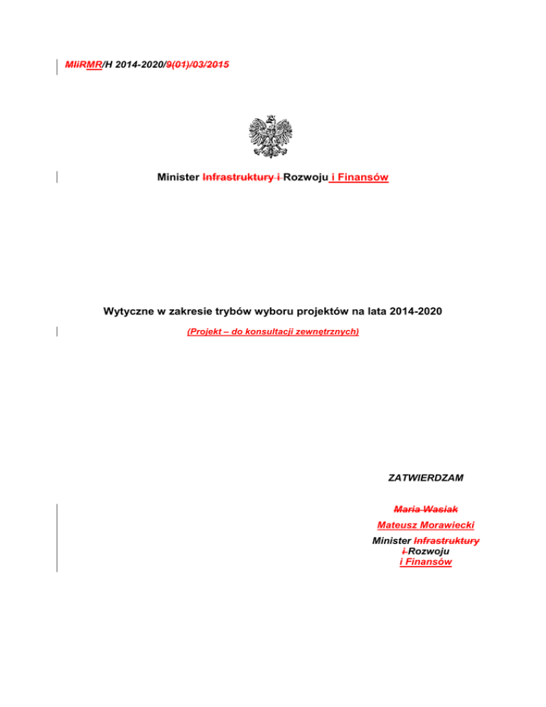 MIiRMR/H 2014-2020/9(01)/03/2015 Minister Infrastruktury i Rozwoju i Finansów Wytyczne w zakresie trybów wyboru projektów na lata 2014-2020 (Projekt – do konsultacji zewnętrznych) ZATWIERDZAM Maria Wasiak Mateusz Morawiecki Minister Infrastruktury i Rozwoju i Finansów Warszawa, 31 marca 2015 2016 r. SPIS TREŚCI Słownik pojęć .......................................................................................................................................... 4 Rozdział 1 – Podstawy prawne ............................................................................................................. 8 Rozdział 2 – Zakres i cel wytycznych .................................................................................................... 8 Rozdział 3 – Podstawowe zasady prawa w zakresie wyboru projektów ............................................ 9 Rozdział 4 – Ogólne warunki wyboru projektów ................................................................................. 10 Rozdział 5 – Kryteria wyboru projektów .............................................................................................. 15 Rozdział 6 – Tryby wyboru projektów.................................................................................................. 18 Rozdział 7 – Tryb konkursowy ............................................................................................................. 19 Podrozdział 7.1 – Cel i ogólne zasady konkursu ................................................................................ 19 Podrozdział 7.2 – Organizacja konkursu............................................................................................. 19 Podrozdział 7.3 – Ocena projektów..................................................................................................... 24 Podrozdział 7.4 – Rozstrzygnięcie konkursu i wybór projektów do dofinansowania ........................ 28 Podrozdział 7.5 – Harmonogram konkursów...................................................................................... 33 Rozdział 8 – Tryb pozakonkursowy..................................................................................................... 34 Podrozdział 8.1 – Zastosowanie trybu pozakonkursowego ............................................................... 34 Podrozdział 8.2 – Zgłaszanie i identyfikacja projektów w trybie pozakonkursowym ....................... 36 Podrozdział 8.3 – Pozostałe etapy wyboru projektów pozakonkursowych do dofinansowania ...... 39 Rozdział 9 – Eksperci ........................................................................................................................... 41 Podrozdział 9.1 – Informacje ogólne ................................................................................................... 41 Podrozdział 9.2 – Kandydaci na ekspertów ........................................................................................ 42 Podrozdział 9.3 – Umowa z ekspertem .............................................................................................. 44 Podrozdział 9.4 – Ocena pracy ekspertów i akredytacja kandydata na eksperta ........................... 47 Rozdział 10 – Szczegółowe procedury wyboru projektów EFS ........................................................ 48 Podrozdział 10.1 – Ogólne warunki opracowywania kryteriów w ramach EFS ................................ 48 Podrozdział 10.2 – Polityka szkoleniowa ............................................................................................ 49 Podrozdział 10.3 – Procedury oceny projektów w trybie konkursowym w ramach EFS................. 50 Podrozdział 10.4 – Negocjacje w ramach konkursowego trybu wyboru projektów w ramach EFS 53 Podrozdział 10.5 – Etap preselekcji w ramach EFS........................................................................... 54 Podrozdział 10.6 – Etap weryfikacji fiszek projektowych w ramach EFS.......................................... 56 Podrozdział 10.7 – Etap oceny strategicznej w ramach EFS ............................................................ 57 Podrozdział 10.8 – Wybór projektów współpracy ponadnarodowej i projektów innowacyjnych w ramach EFS .......................................................................................................................................... 59 Rozdział 11 – Wybór projektów w ramach Zintegrowanych Inwestycji Terytorialnych (ZIT) ........... 60 Rozdział 12 – Wybór projektów zintegrowanych ................................................................................ 61 2 Wykaz skrótów ...................................................................................................................................... 3 Słownik pojęć .......................................................................................................................................... 4 Rozdział 1 – Podstawy prawne ............................................................................................................. 8 Rozdział 2 – Zakres i cel wytycznych .................................................................................................... 8 Rozdział 3 – Podstawowe zasady prawa w zakresie wyboru projektów ............................................ 9 Rozdział 4 – Ogólne warunki wyboru projektów ................................................................................. 10 Rozdział 5 – Kryteria wyboru projektów .............................................................................................. 15 Rozdział 6 – Tryb konkursowy ............................................................................................................. 18 Podrozdział 6.1 – Cel i ogólne zasady konkursu ................................................................................ 19 Podrozdział 6.2 – Wymogi forma