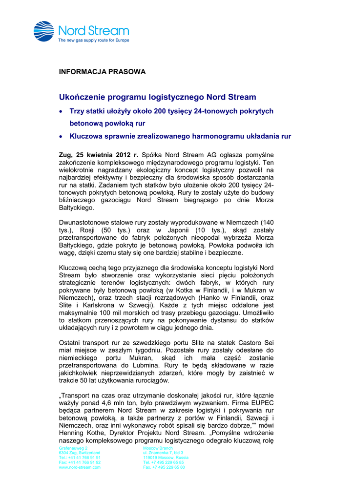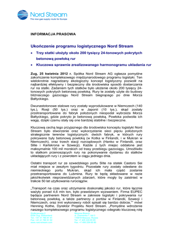 INFORMACJA PRASOWA Ukończenie programu logistycznego Nord Stream Trzy statki ułożyły około 200 tysięcy 24-tonowych pokrytych betonową powłoką rur Kluczowa sprawnie zrealizowanego harmonogramu układania rur Zug, 25 kwietnia 2012 r. Spółka Nord Stream AG ogłasza pomyślne zakończenie kompleksowego międzynarodowego programu logistyki. Ten wielokrotnie nagradzany ekologiczny koncept logistyczny pozwolił na najbardziej efektywny i bezpieczny dla środowiska sposób dostarczania rur na statki. Zadaniem tych statków było ułożenie około 200 tysięcy 24tonowych pokrytych betonową powłoką. Rury te zostały użyte do budowy bliźniaczego gazociągu Nord Stream biegnącego po dnie Morza Bałtyckiego. Dwunastotonowe stalowe rury zostały wyprodukowane w Niemczech (140 tys.), Rosji (50 tys.) oraz w Japonii (10 tys.), skąd zostały przetransportowane do fabryk położonych nieopodal wybrzeża Morza Bałtyckiego, gdzie pokryto je betonową powłoką. Powłoka podwoiła ich wagę, dzięki czemu stały się one bardziej stabilne i bezpieczne. Kluczową cechą tego przyjaznego dla środowiska konceptu logistyki Nord Stream było stworzenie oraz wykorzystanie sieci pięciu położonych strategicznie terenów logistycznych: dwóch fabryk, w których rury pokrywane były betonową powłoką (w Kotka w Finlandii, i w Mukran w Niemczech), oraz trzech stacji rozrządowych (Hanko w Finlandii, oraz Slite i Karlskrona w Szwecji). Każde z tych miejsc oddalone jest maksymalnie 100 mil morskich od trasy przebiegu gazociągu. Umożliwiło to statkom przenoszących rury na pokonywanie dystansu do statków układających rury i z powrotem w ciągu jednego dnia. Ostatni transport rur ze szwedzkiego portu Slite na statek Castoro Sei miał miejsce w zeszłym tygodniu. Pozostałe rury zostały odesłane do niemieckiego portu Mukran, skąd ich mała część zostanie przetransportowana do Lubmina. Rury te będą składowane w razie jakichkolwiek nieprzewidzianych zdarzeń, które mogły by zaistnieć w trakcie 50 lat użytkowania rurociągów. „Transport na czas oraz utrzymanie doskonałej jakości rur, które łącznie ważyły ponad 4,6 mln ton, było prawdziwym wyzwaniem. Firma EUPEC będąca partnerem Nord Stream w zakresie logistyki i pokrywania rur betonową powłoką, a także partnerzy z portów w Finlandii, Szwecji i Niemczech, oraz inni wykonawcy robót spisali się bardzo dobrze,”” mówi Henning Kothe, Dyrektor Projektu Nord Stream. „Pomyślne wdrożenie naszego kompleksowego programu logistycznego odegrało kluczową rolę Grafenauweg 2 6304 Zug, Switzerland Tel.: +41 41 766 91 91 Fax: +41 41 766 91 92 www.nord-stream.com Moscow Branch ul. Znamenka 7, bld 3 119019 Moscow, Russia Tel. +7 495 229 65 85 Fax. +7 495 229 65 80 w zapewnieniu sprawnego harmonogramu układania rur, które zakończyło się kilka tygodni przed czasem,” dodaje. Zbudowanie nowych fabryk w pobliżu trasy przebiegu rurociągu zamiast wykorzystania tych już istniejących, ale zlokalizowanych w większej odległości, pozwoliło na środowiskowe i ekonomiczne oszczędności: redukcja 200 tysięcy ton emisji CO2 oraz 60 mln euro mniej w kosztach transportu. Kiedy tylko było to możliwe przy budowie gazociągu korzystano ze środków transportu charakteryzujących się niską emisją dwutlenku węgla: 96 procent całego transportu przy projekcie Nord Stream odbywało się przy użyciu statków i kolei. Werner Rott, Dyrektor Techniczny Nord Stream dodaje: „Nasz program logistyki pozwolił na elastyczne reagowanie na zmieniające się wymagania podczas pracy nawet z trzema statkami układającymi rury jednocześnie, nawet w trudnych warunkach zimowych. W trakcie całego procesu układania trwającego około 20 tysięcy godzin odnotowano jedynie 24 godziny łącznie, w trakcie których rury nie mogły być dostarczone. Miało to miejsce podczas wyjątkowo mroźnej zimy na przełomie 2020 i 2011 roku.” Łączna wartość surowców i robocizny dla fazy obejmującej pokrywanie rur betonową powłoką oraz logistykę wynosiła około 650 mln euro, z czego 100 mln euro zainwestowane zostało w infrastrukturę logistyczną. Inwestycje wywarły pozytywny wpływ na rozwój biznesu oraz zatrudnienie w sposób bezpośredni jak i pośredni, we wszystkich pięciu lokalizacjach. Dalszych informacji udzielają: Ulrich Lissek, dyrektor ds. komunikacji, tel.kom.: +41 79 874 31 58 Jens Müller, zastępca dyrektora ds. komunikacji, tel. kom.: +41 79 295 96 08 Minna Sundelin, menedżer ds. komunikacji projektu w Finlandii, tel. kom. + 41 79 874 31 41 E-mail: [email protected] Uwagi dla wydawców Nord Stream (Gazociąg Północny) jest gazociągiem biegnącym po dnie Morza Bałtyckiego i łączącym Rosję z krajami Unii Europejskiej. W 2009 r. Unia Europejska zaimportowała ok. 312 mld metrów sześciennych gazu ziemnego, a do 2030 r. liczba ta ma wzrosnąć do ponad 523 mld metrów sześciennych. Do tego czasu UE potrzebować będzie dodatkowych dostaw gazu wynoszących 211 metrów sześciennych gazu ziemnego rocznie. (Źródło: IEA, 2011). Gazociąg Północny, łączący jedne z największych złóż gazu ziemnego z Europą, będzie pokrywał ponad jedną czwartą zapotrzebowania na dodatkowy gaz. Projekt będzie istotnym wkładem w długoterminowe zabezpieczenie dostaw i kamieniem milowym w energetycznym partnerstwie pomiędzy Unią Europejską a Rosją. Grafenauweg 2 6304 Zug, Switzerland Tel.: +41 41 766 91 91 Fax: +41 41 766 91 92 www.nord-stream.com Moscow Branch ul. Znamenka 7, bld 3 119019 Moscow, Russia Tel. +7 495 229 65 85 Fax. +7 495 229 65 80 Pierwsza z dwóch równoległych nitek gazociągu została uruchomiona w listopadzie 2011 r. Obie nitki będą mieć po ok. 1220 km i przepustowość po 27,5 mld metrów sześciennych surowca rocznie. Budowa drugiej nitki została zakończona. Pełna przepustowość gazociągu, czyli 55 mld metrów sześciennych, będzie możliwa po uruchomieniu drugiej nitki pod koniec 201