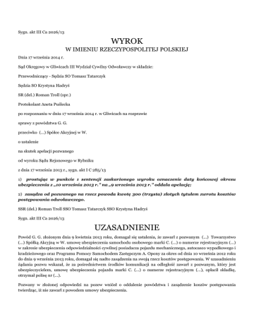 Sygn. akt III Ca 2026/13 WYROK W IMIENIU RZECZYPOSPOLITEJ POLSKIEJ Dnia 17 września 2014 r. Sąd Okręgowy w Gliwicach III Wydział Cywilny Odwoławczy w składzie: Przewodniczący - Sędzia SO Tomasz Tatarczyk Sędzia SO Krystyna Hadryś SR (del.) Roman Troll (spr.) Protokolant Aneta Puślecka po rozpoznaniu w dniu 17 września 2014 r. w Gliwicach na rozprawie sprawy z powództwa G. G. przeciwko (...) Spółce Akcyjnej w W. o ustalenie na skutek apelacji pozwanego od wyroku Sądu Rejonowego w Rybniku z dnia 17 września 2013 r., sygn. akt I C 285/13 1) prostując w punkcie 1 sentencji zaskarżonego wyroku oznaczenie daty końcowej okresu ubezpieczenia z „10 września 2013 r.” na „9 września 2013 r.” oddala apelację; 2) zasądza od pozwanego na rzecz powoda kwotę 300 (trzysta) złotych tytułem zwrotu kosztów postępowania odwoławczego. SSR (del.) Roman Troll SSO Tomasz Tatarczyk SSO Krystyna Hadryś Sygn. akt III Ca 2026/13 UZASADNIENIE Powód G. G. złożonym dnia 9 kwietnia 2013 roku, domagał się ustalenia, że zawarł z pozwanym (...) Towarzystwo (...) Spółką Akcyjną w W. umowę ubezpieczenia samochodu osobowego marki C. (...) o numerze rejestracyjnym (...) w zakresie ubezpieczenia odpowiedzialności cywilnej posiadacza pojazdu mechanicznego, autocasco wypadkowego i kradzieżowego oraz Programu Pomocy Samochodem Zastępczym A. Opony za okres od dnia 10 września 2012 roku do dnia 9 września 2013 roku, domagał się nadto zasądzenia na swoją rzecz kosztów postępowania. W uzasadnieniu żądania pozwu wskazał, że za pośrednictwem środków komunikacji na odległość zawarł z pozwanym, który jest ubezpieczycielem, umowę ubezpieczenia pojazdu marki C. (...) o numerze rejestracyjnym (...), opłacił składkę, otrzymał polisę nr (...). Pozwany w złożonej odpowiedzi na pozew wniósł o oddalenie powództwa i zasądzenie koszów postępowania twierdząc, iż nie zawarł z powodem umowy ubezpieczenia. Sąd Rejonowy w Rybniku ustalił następujący stan faktyczny: Pismem z dnia 6 września 2012 roku, nadanym 7 września 2012 r., powód G. G. wypowiedział pozwanemu umowę ubezpieczenia (...) swojego pojazdu marki C. o numerze rejestracyjnym (...). Pozwany otrzymał to pismo w dniu 13 września 2012 roku. Po wypowiedzeniu umowy ubezpieczenia z powodem skontaktowali się telefonicznie przedstawiciele pozwanego i zaoferowali mu nową umowę, a powód przystał na te warunki i pozwany polisą numer (...) z dnia 10 września 2012 roku potwierdził powodowi zawarcie umowy ubezpieczenia samochodu powoda marki C. (...) o numerze rejestracyjnym (...) w następującym zakresie i terminach: - Auto Casco wypadkowe w/g OWU Auto Casco obowiązujących od dnia 17 stycznia 2012 roku - począwszy od dnia 10 września 2012 roku do dnia 9 września 2013 roku; - Auto Casco kradzieżowe w/g OWU Auto Casco obowiązujących od dnia 17 stycznia 2012 roku - począwszy od dnia 10 września 2012 roku do dnia 9 września 2013 roku; - OC - odpowiedzialności cywilnej posiadacza pojazdu mechanicznego - począwszy od dnia 10 września 2012 roku do dnia 9 września 2013 roku; - Programu Pomocy z Samochodem Zastępczym i A. Opony w/g OWU Program Pomocy z Samochodem Zastępczym i A. Opony obowiązujących od dnia 12 kwietnia 2012 roku - począwszy od dnia 10 września 2012 roku do dnia 9 września 2013 roku. Całkowita składka do zapłacenia z tytułu polisy numer (...) z dnia 10 września 2012 roku, zgodnie z treścią polisy wyniosła 1 601,19 zł, w tym kwota z tytułu OC w wysokości 650,20 zł. Dokumenty te pozwany przesłał powodowi. Powód otrzymał od pozwanego również Certyfikat Polisy OC - numer polisy: (...) - seria certyfikatu (...). W treści wskazanego certyfikatu podano, że dotyczy on umowy zawartej z (...) Towarzystwo (...) Spółką Akcyjną w W., oznaczono okres ubezpieczenia od dnia 10 września 2012 roku do dnia 9 września 2013 roku, podano całkowitą składkę za polisę w kwocie 1 601,19 zł oraz wypisano dane powoda G. G. jako właściciela pojazdu marki C. (...) o numerze rejestracyjnym (...). W dniu 17 września 2012 roku powód przelewem opłacił składkę w wysokości 1 601,19 zł na rzecz pozwanej, wpisując w tytule wskazanego przelewu „Składka za ubezpieczenie, nr polisy (...) za C.”. Pozwany dokonaną przez powoda w dniu 17 września 2012 roku wpłatę składki za polisę numer (...) przyjął bez zastrzeżeń. Pismem z dnia 31 stycznia 2013 roku pełnomocnik powoda podniósł, że powód nie jest w stanie zgłosić telefonicznie szkody, która nastąpiła w pojeździe ponieważ osoby przyjmujące zawiadomienia odmawiają rejestracji szkody. Pozwany, pismem z dnia 21 lutego 2013 roku, poinformował pełnomocnika powoda, że umowa ubezpieczenia sygnowana (...) została przez ubezpieczającego wypowiedziana dnia 7 września 2012 roku poprzez dostarczenie towarzystwu ubezpieczeń pisemnego oświadczenia o rezygnacji z przedłużenia polisy zgodnie z zapisem art. 28 ustawy z dnia 22 maja 2013 roku o ubezpieczeniach obowiązkowych oraz wskazała, że opłacenie składki po fakcie nieprzedłużenia polisy nie jest równoznaczne z prolongacją umowy ubezpieczenia, i poinformował, że w związku z powyższym ochrona ubezpieczeniowa zakończyła się z dniem 9 września 2012 roku. W tak ustalonym stanie faktycznym Sąd Rejonowy w Rybniku wyrokiem z dnia 17 września 2013 r. ustalił, że powód G. G. zawarł z pozwanym (...) Spółka Akcyjna w W. umowę ubezpieczenia samochodu osobowego marki C. (...) numer rejestracyjny (...) A w zakresie ubezpieczenia odpowiedzialności cywilnej posiadacza pojazdu mechanicznego, autocasco wypadkowego i kradzieżowego oraz Programu Pomocy z Samochodem Zastępczym i A. Opony na okres od 10 września 2012 roku do 10 września 2013 roku (pkt 1) oraz zasądził od pozwanego (...) Spółka Akcyjna w W. na rzecz powoda G. G. kwotę 647 zł tytułem zwrotu kosztów postępowania, w tym kwotę 600 zł tytułem zwrotu kosztów zas