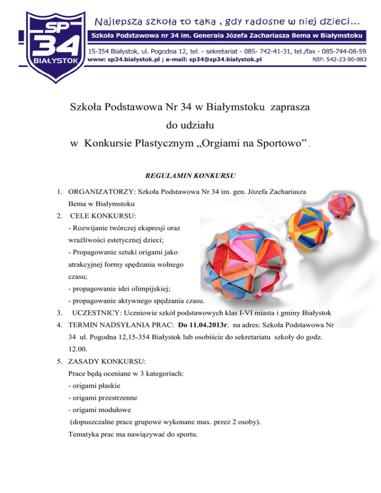 h Białystok 30.12.2011 r. Szkoła Podstawowa Nr 34 w Białymstoku zaprasza do udziału w Konkursie Plastycznym „Orgiami na Sportowo” . REGULAMIN KONKURSU 1. ORGANIZATORZY: Szkoła Podstawowa Nr 34 im. gen. Józefa Zachariasza Bema w Białymstoku 2. CELE KONKURSU: - Rozwijanie twórczej ekspresji oraz wrażliwości estetycznej dzieci; - Propagowanie sztuki origami jako atrakcyjnej formy spędzania wolnego czasu; - propagowanie idei olimpijskiej; - propagowanie aktywnego spędzania czasu. 3. UCZESTNICY: Uczniowie szkół podstawowych klas I-VI miasta i gminy Białystok 4. TERMIN NADSYŁANIA PRAC: Do 11.04.2013r. na adres: Szkoła Podstawowa Nr 34 ul. Pogodna 12,15-354 Białystok lub osobiście do sekretariatu szkoły do godz. 12.00. 5. ZASADY KONKURSU: Prace będą oceniane w 3 kategoriach: - origami płaskie - origami przestrzenne - origami modułowe (dopuszczalne prace grupowe wykonane max. przez 2 osoby). Tematyka prac ma nawiązywać do sportu. 6. KOMISJA KONKURSOWA oceni i wytypuje prace z uwzględnieniem grup wiekowych: klasy I-III, klasy IV-VI. Wszystkie prace powinny być opisane: tytuł pracy, imię i nazwisko autora, do której klasy uczęszcza, nazwa placówki z nr tel., e-mail, imię i nazwisko opiekuna. 7. JURY OCENIAĆ BĘDZIE: - pomysłowość, wyobraźnię oraz oryginalność ujęcia tematu, - estetykę wykonania, - atrakcyjność wizualną. Prace zrolowane lub zniszczone w wyniku niewłaściwego opakowania, również nadesłane po terminie nie będą oceniane. 8. FINAŁ KONKURSU odbędzie się 16.04 2013r. podczas DNIA OLIMPIJSKIEGO w Szkole Podstawowej Nr 34 w Białymstoku , ul. Pogodna 12. 9. Najlepsze prace zostaną wyeksponowane na wystawie pokonkursowej w siedzibie organizatora. 10. Laureaci konkursu otrzymają nagrody rzeczowe i dyplomy, a opiekunowie podziękowania. Lista nagrodzonych osób zamieszczona będzie na stronie internetowej Szkoły Podstawowej Nr 34 w Białymstoku. do dnia 14.04.2013r. 11. Nadesłane prace jak też prawa autorskie przechodzą na własność organizatorów. 12. Administrowanie danych osobowych uczestników konkursu przez organizatorów odbywać się będzie wyłącznie w celach związanych z organizacją niniejszego konkursu. Organizatorzy zastrzegają sobie prawo do publikowania danych osobowych tj. imię i nazwisko, klasa do której uczestnik uczęszcza, tytuł pracy, nazwę i adres szkoły. Szczegółowych informacji udzielają: Małgorzata Szczech-Wojciechowska, Ewa Zarzecka Kontakt : 857424131, 519779049, 608525554. Szkoła ubiega się o objęcie Konkursu honorowym patronatem Podlaskiego Kuratora Oświaty, Podlaskiej Rady Olimpijskiej PKOl oraz Klubu Sportowego „Jagiellonia Białystok” Zapraszamy do udziału.