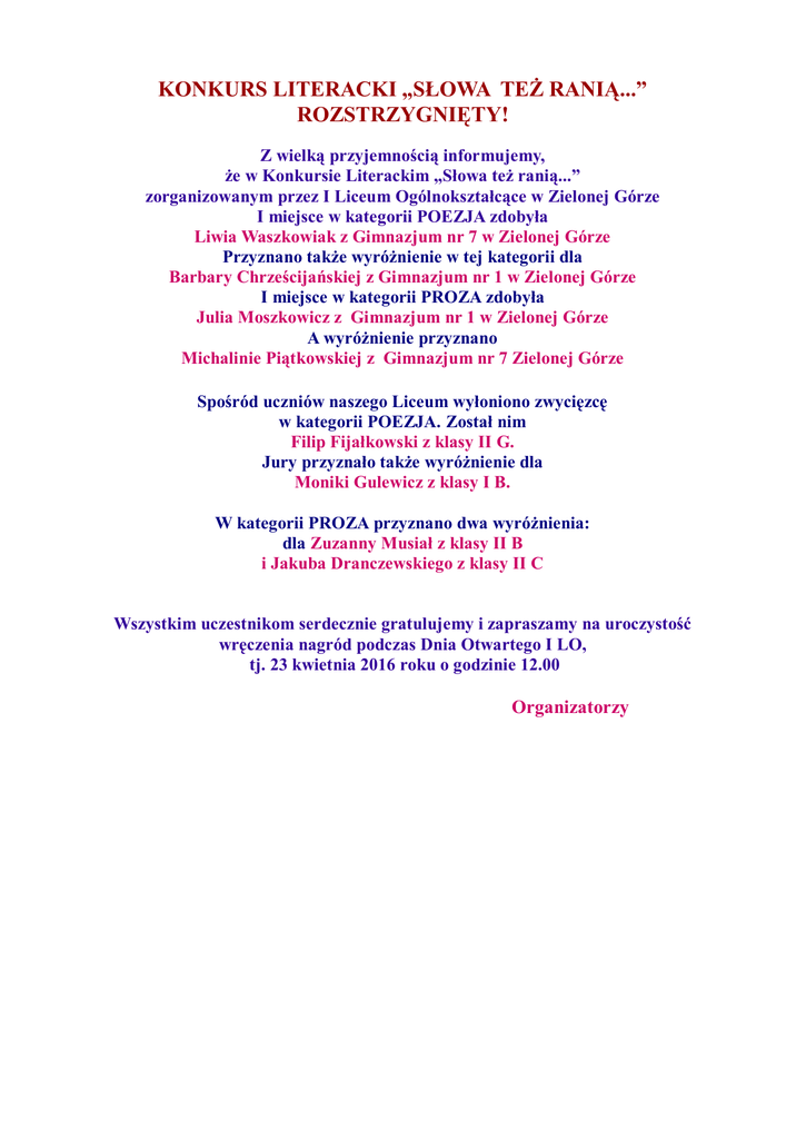 KONKURS LITERACKI „SŁOWA TEŻ RANIĄ...” ROZSTRZYGNIĘTY! Z wielką przyjemnością informujemy, że w Konkursie Literackim „Słowa też ranią...” zorganizowanym przez I Liceum Ogólnokształcące w Zielonej Górze I miejsce w kategorii POEZJA zdobyła Liwia Waszkowiak z Gimnazjum nr 7 w Zielonej Górze Przyznano także wyróżnienie w tej kategorii dla Barbary Chrześcijańskiej z Gimnazjum nr 1 w Zielonej Górze I miejsce w kategorii PROZA zdobyła Julia Moszkowicz z Gimnazjum nr 1 w Zielonej Górze A wyróżnienie przyznano Michalinie Piątkowskiej z Gimnazjum nr 7 Zielonej Górze Spośród uczniów naszego Liceum wyłoniono zwycięzcę w kategorii POEZJA. Został nim Filip Fijałkowski z klasy II G. Jury przyznało także wyróżnienie dla Moniki Gulewicz z klasy I B. W kategorii PROZA przyznano dwa wyróżnienia: dla Zuzanny Musiał z klasy II B i Jakuba Dranczewskiego z klasy II C Wszystkim uczestnikom serdecznie gratulujemy i zapraszamy na uroczystość wręczenia nagród podczas Dnia Otwartego I LO, tj. 23 kwietnia 2016 roku o godzinie 12.00 Organizatorzy