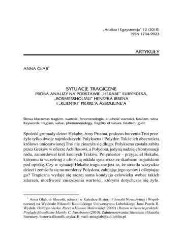 „Analiza i Egzystencja” 12 (2010) ISSN 1734-9923 ARTYKUŁY ANNA GŁĄB* SYTUACJE TRAGICZNE PRÓBA ANALIZY NA PODSTAWIE „HEKABE” EURYPIDESA, „ROSMERSHOLMU” HENRYKA IBSENA I „KLIENTKI” PIERRE’A ASSOULINE’A Słowa kluczowe: tragizm, wartość, fenomenologia, kruchość wartości, fatalizm, wina Keywords: tragism, value, phenomenology, fragility of values, fatalism, gulit Spośród gromady dzieci Hekabe, żony Priama, podczas burzenia Troi przeżyło tylko dwoje najmłodszych: Polyksena i Polydor. Także ich obecnością królowa unicestwionej Troi nie cieszyła się długo. Polyksena została zabita przez Greków w ofierze Achillesowi, a Polydora, jedyną nadzieję kontynuacji rodu, zamordował król konnych Traków, Polymestor – przyjaciel Hekabe, któremu ta wcześniej z ufnością oddała syna wraz ze skarbami trojańskimi pod opiekę. Czy w sytuacji Hekabe tragiczne jest to, że straciła wszystkie dzieci i zemściła się na mordercy Polydora, zabijając jego synów i oślepiając go? Tragiczna wydaje się raczej sama kondycja człowieka wobec takich zdarzeń, możliwość zniszczenia wartości, którymi dotychczas się żyło. * Anna Głąb, dr filozofii, adiunkt w Katedrze Historii Filozofii Nowożytnej i Współczesnej na Wydziale Filozofii Katolickiego Uniwersytetu Lubelskiego Jana Pawła II. Wydała: Ostryga i łaska. Rzecz o Hannie Malewskiej (2009) i Rozum w świecie praktyki. Poglądy filozoficzne Marthy C. Nussbaum (2010). Zainteresowania: literatura i filozofia literatury, historia filozofii, etyka. E-mail: [email protected]. 184 Anna Głąb „Jeszcze przed śmiercią umarłam – od nieszczęść”1, mówi królowa trojańska, która życie kończy jako, przemieniona przed śmiercią, suka wyjąca na grobie syna. Ten symbol to sugerowany przez Eurypidesa klucz do upadku Hekabe, a także alegoryczne ukazanie prawdziwego wymiaru jej nieszczęścia. Czy jednak „krach” wartości w jej życiu jest jednoznaczny z „krachem” jej człowieczeństwa? Rebeka West po latach upokorzeń chce zdobyć pozycję społeczną. Kiedy przybywa do Rosmersholmu i zadomawia się jako gospodyni w domu pastora Jana Rosmera, udaje się jej dokonać „psychicznego morderstwa”2 na jego żonie Beacie poprzez wmówienie jej, iż usunięcie się jej z życia męża będzie dla niego najlepsze. Po samobójczej śmierci Beaty, której nie pozostaje nic innego, jak rzucić się z kładki w spieniony nurt rzeki, Rebeka zostaje w domu pastora i za sprawą oddziaływania jego osobowości przeżywa moralną przemianę. Gdy Rosmer prosi ją o rękę, Rebeka – mimo że zrobiła wszystko, aby do tego doszło – musi odmówić. Jest już inna. Sam Rosmer wstrząśnięty po „spowiedzi” Rebeki, a także przygnębiony porażką na forum publicznym, nie widzi innej możliwości ucieczki od problemów, jak pójść w ślady Beaty. Żądając dowodu miłości od Rebeki, pociąga ją za sobą – w przepaść wody. To dla niego rodzaj ekspiacji za śmierć żony, czego nie kwestionuje Rebeka. Oboje poddają się tragicznemu zapętleniu w swym życiu. Wolni, kochający się, z perspektywą dalszego, dobrego przecież życia, dobrowolnie wybierają śmierć. Na moment odsłania się wykrzywiona twarz tragizmu – koniecznego i nieuniknionego pierwiastka konfliktu wartości. Z powodu haniebnego donosu Cécile Armand-Cavelli, ginie w czasie drugiej wojny światowej niemal cała rodzina żydowskich kuśnierzy Fechnerów. Na donos ten w bibliotece rękopisów trafia bezimienny narrator 1 Eurypides, Hekabe, 430–435, [w:] Eurypides, Tragedie, t. 1, tłum. J. Łanowski, Warszawa: Prószyński i S-ka 2005. 2 Tego porównania używa August Strindberg w artykule Morderstwo psychiczne (A propos „Rosmersholm”). Twierdzi w nim, że Rebeka jest „jak gdyby nieświadomym kanibalem, który pożarł duszę pani Rosmer. Realizując swe podświadome plany zawładnięcia domem, zachowywała się w sposób wysoce podejrzany. Pani Rosmer podejrzewała – przejrzała – Rebekę, która ukryła swe plany i uratowała się przekonując panią Rosmer, że cierpi na podejrzliwość. Rzecz jasna, jej podejrzliwość wzrosła w wyniku obserwacji i niemożności zebrania dowodów. [...] Wtedy Rebece było już łatwo doprowadzić ją do szaleństwa”. Cyt. za: O. Dobijanka-Witczakowa, Wstęp, [w:] H. Ibsen, Wybór dramatów, t. 1, Wrocław: Biblioteka Narodowa 1984, s. LXXXI–LXXXII. Sytuacje tragiczne 185 powieści Assouline’a. Powodowany pragnieniem, a z czasem narastającą obsesją zrozumienia, stopniowo odkrywa ułamki przeszłości i nieświadom całej prawdy o historii Cécile Armand-Cavelli, żąda od niej przysłowiowego posypania głowy popiołem. Gdy zostanie zerwana ostatnia zasłona, przez nagą, bezbronną prawdę prześwieca tragizm sytuacji, w jakiej znalazła się i Cécile, i jej aktualny kat. Tragizm Cécile Armand dlatego, że nie tylko dopuściła się zła, ale i zła doznała; była nie tylko katem, ale również ofiarą. „Było w niej tyle samo grzechu, co cierpienia”3. Za cenę kolaboracji chciała uratować ukochanego brata w myśl rzuconego na odchodnym zdania inspektora, że może uratować albo brata, albo Fechnerów. Ostatecznie brata nie uratowała, a po wyzwoleniu została okrutnie upokorzona przez mieszkańców dzielnicy, w której prowadziła kwiaciarnię. Chłodny oddech tragedii wyczuć można także w sytuacji narratora, ponieważ jego z początku dobre, zrozumiałe intencje – poprzez stopniowe, zakamuflowane poddanie się złu – zamieniają się w to, co on sam nazwie „wrogością wrodzoną”4. Dopiero poznanie całej prawdy uświadomi mu tragedię pani Armand, której częścią stał się on sam. Tragizm ujawnia się ponownie jako podszewka świata wartości. Celem niniejszego artykułu nie jest dociekanie definicji tragizmu poprzez śledzenie artystycznych środków przekazu czy posługiwanie się literacko użytecznymi, ale nieposiadającymi rzeczywis