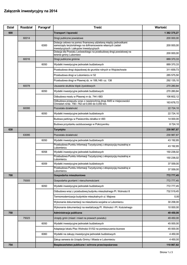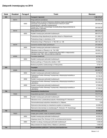 Załącznik inwestycyjny na 2014 Dział 600 Rozdział Paragraf 60014 Drogi publiczne powiatowe 6300 60016 Transport i łączność Treść 6050 Dotacja celowa na pomoc finansową udzielaną między jednostkami samorządu terytorialnego na dofinansowanie własnych zadań inwestycyjnych i zakupów inwestycyjnych Dotacja dla Powiatu Lwóweckiego na przebudowę drogi powiatowej na terenie gminy Lubomierz Drogi publiczne gminne Wydatki inwestycyjne jednostek budżetowych 60095 630 6050 6058 6059 700 70005 6050 Usuwanie skutków klęsk żywiołowych Wydatki inwestycyjne jednostek budżetowych Odbudowa mostu w Pławnej nr dz. 744 i 683 Pozostała działalność Wydatki inwestycyjne jednostek budżetowych Budowa parkingu w Pasieczniku działka nr 493 Pozostała działalność Wydatki inwestycyjne jednostek budżetowych Przebudowa Punktu Informacji Turystycznej z ekspozycją muzealną w Lubomierzu Wydatki inwestycyjne jednostek budżetowych 6050 6060 754 889 370,33 285 575,50 270 280,84 270 280,84 106 602,12 163 678,72 22 724,10 22 724,10 14 000,00 8 724,10 230 987,87 230 987,87 43 192,85 43 192,85 150 236,02 150 236,02 Przebudowa Punktu Informacji Turystycznej z ekspozycją muzealną w Lubomierzu 37 559,00 Wydatki inwestycyjne jednostek budżetowych 37 559,00 Gospodarka mieszkaniowa 772 777,45 Wydatki inwestycyjne jednostek budżetowych 772 777,45 Gospodarka gruntami i nieruchomościami Odbudowa wraz z przebudową budynku mieszkalnego Pl. Wolności 8 772 777,45 732 519,45 0,00 Wykonanie dokumentacji na mieszkania socjalne w Lubomierzu 30 258,00 Administracja publiczna 49 450,00 Wykonanie dokumentacji na rewitalizację Pl. Wolności i Pl. Kościelnego 75023 889 370,33 Przebudowa Punktu Informacji Turystycznej z ekspozycją muzealną w Lubomierzu Termomodernizacja budynków mieszkalnych ul. Majowa 750 200 000,00 292 135,10 Turystyka 6050 200 000,00 Przebudowa drogi w Pławnej dz. nr 106,148 i cz. 138 Budowa przystanku autobusowego w Pokrzywniku 63095 200 000,00 311 659,73 Odbudowa przepustu wraz z nawierzchnią drogi AM3 w miejscowości Chmieleń nr/dz. 756 i 762 od 0,000 do 0,050 km. 6050 1 382 375,27 Przebudowa drogi dojazdowej do gruntów rolnych w Wojciechowie Przebudowa drogi w Lubomierzu nr 52 60078 Wartość Urzędy gmin (miast i miast na prawach powiatu) Wydatki inwestycyjne jednostek budżetowych Adaptacja lokalu Plac Wolności 51/52 na pomieszczenia biurowe Wydatki na zakupy inwestycyjne jednostek budżetowych Zakup serwera do Urzędu Gminy i Miasta w Lubomierzu Bezpieczeństwo publiczne i ochrona przeciwpożarowa 10 000,00 49 450,00 45 000,00 45 000,00 4 450,00 4 450,00 110 867,82 Strona 1 z 3 75412 6050 6060 Ochotnicze straże pożarne Wydatki inwestycyjne jednostek budżetowych 16 787,42 Wydatki na zakupy inwestycyjne jednostek budżetowych 43 580,40 Budowa remizy strażackiej w Milęcicach Zakup samochodu dla OSP Chmieleń 854 900 Zakup sprzętu dla OSP Pasiecznik 80104 85410 90001 6060 6050 6050 6230 90015 6050 Zakup zmywarki 10 000,00 10 000,00 Edukacyjna opieka wychowawcza 226 837,57 Wydatki inwestycyjne jednostek budżetowych 226 837,57 Internaty i bursy szkolne Klatka schodowa przeciwpożarowa oraz schody zewnętrzne do celów ewakuacji z budynku "B" internatu Zespołu Szkół w Lubomierzu Wykonanie dokumentacji na termomodernizację budynku internatu Zespołu Szkół w Lubomierzu 226 837,57 176 837,57 50 000,00 Gospodarka komunalna i ochrona środowiska 929 520,86 Wydatki inwestycyjne jednostek budżetowych 483 897,33 Gospodarka ściekowa i ochrona wód Budowa ekologicznej oczyszczalni ścieków w Olesznej Podgórskiej Przebudowa sieci kanalizacji sanitarnej ul. Kościuszki w Lubomierzu Wydatki inwestycyjne jednostek budżetowych Budowa sieci kanalizacji sanitarnej wraz z przebudową sieci wodociągowej ul. Sportowa w Lubomierzu Wydatki inwestycyjne jednostek budżetowych Budowa sieci kanalizacji sanitarnej wraz z przebudową sieci wodociągowej ul. Sportowa w Lubomierzu Dotacje celowe z budżetu na finansowanie lub dofinansowanie kosztów realizacji inwestycji i zakupów inwestycyjnych jednostek nie zaliczanych do sektora finansów publicznych 897 500,00 45 000,00 60 000,00 336 397,33 23 000,00 19 500,00 242 702,00 242 702,00 80 900,67 80 900,67 90 000,00 Dotacja na budowę przydomowych oczyszczalni ścieków 90 000,00 Wydatki inwestycyjne jednostek budżetowych 32 020,86 Oświetlenie ulic, placów i dróg Budowa nowych lamp oświetleniowych w Golejowie Kultura i ochrona dziedzictwa narodowego 6050 4 580,40 10 000,00 Budowa nowych lamp oświetleniowych w Radoniowie 92109 0,00 Wydatki na zakupy inwestycyjne jednostek budżetowych Przedszkola Budowa nowych lamp oświetleniowych w Popielówku 921 39 000,00 10 000,00 Przebudowa sieci kanalizacji sanitarnej ul. Asnyka w Lubomierzu 6059 50 500,00 Oświata i wychowanie Budowa ekologicznych oczyszczalni ścieków w Popielówku i Wojciechowie Budowa sieci kanalizacji sanitarnej wraz z przebudową sieci wodociągowej ul. Sportowa w Lubomierzu 6058 67 287,42 Budowa placu manewrowego wraz z infrastrukturą przy remizie OSP Wojciechów Zakup sprzętu dla OSP Milęcice 801 110 867,82 Domy i ośrodki kultury, świetlice i kluby Wydatki inwestycyjne jednostek budżetowych 32 020,86 16 900,47 7 000,00 8 120,39 6 765,00 6 765,00 0,00 Budowa altany przy świetlicy wiejskiej w Chmieleniu 0,00 Budowa pomieszczenia gospodarczego przy świetlicy w Olesznej Podgórskiej Przebudowa pomieszczeń po klasztorze sióstr Benedyktynek na potrzeby utworzenia biblioteki jako centrum społeczno-kulturalne w Lubomierzu 0,00 0,00 Strona 2 z 3 6060 926 92695 6050 Wydatki na zakupy inwestycyjne jednostek budżetowych 6 765,00 Zakup sprzętu do świetlicy wiejskiej w Olesznej Podgórskiej 6 765,00 Kultura fizyczna 274 818,62 Wydatki inwestycyjne jednostek budżetowych 274 818,62 Pozostała działalność 274 818,62 Budowa boiska sportowego w Pławnej Dolnej Budowa placu zabaw wraz z zagospodarowaniem terenu w Lubomierzu Przebudowa boiska sportowego w Pławnej Górn