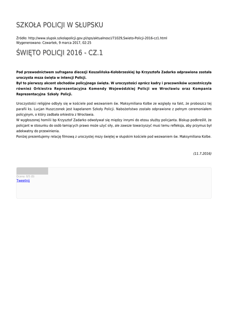 SZKOŁA POLICJI W SŁUPSKU Źródło: http://www.slupsk.szkolapolicji.gov.pl/sps/aktualnosci/71029,Swieto-Policji-2016-cz1.html Wygenerowano: Czwartek, 9 marca 2017, 02:25 ŚWIĘTO POLICJI 2016 - CZ.1 Pod przewodnictwem sufragana diecezji Koszalińska-Kołobrzeskiej bp Krzysztofa Zadarko odprawiona została uroczysta msza święta w intencji Policji. Był to pierwszy akcent obchodów policyjnego święta. W uroczystości oprócz kadry i pracowników uczestniczyła również Orkiestra Reprezentacyjna Komendy Wojewódzkiej Policji we Wrocławiu oraz Kompania Reprezentacyjna Szkoły Policji. Uroczystości religijne odbyły się w kościele pod wezwaniem św. Maksymiliana Kolbe ze względy na fakt, że proboszcz tej parafii ks. Lucjan Huszczonek jest kapelanem Szkoły Policji. Nabożeństwo zostało odprawione z pełnym ceremoniałem policyjnym, o który zadbała orkiestra z Wrocławia. W wygłoszonej homilii bp Krzysztof Zadarko odwoływał się między innymi do etosu służby policjanta. Biskup podkreślił, że policjant w stosunku do osób łamiących prawo może użyć siły, ale zawsze towarzyszyć musi temu refleksja, aby przymus był adekwatny do przewinienia. Poniżej prezentujemy relację filmową z uroczystej mszy świętej w słupskim kościele pod wezwaniem św. Maksymiliana Kolbe. (11.7.2016) Ocena: 0/5 (0) Tweetnij