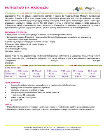 HUTNICTWO NA MAZOWSZU Zapraszamy Was do odbycia niesamowitej podróży w czasie do Pruszkowskiego Muzeum Starożytnego Hutnictwa. Otwarta w 2014 roku nowoczesna, multimedialna ekspozycja jest obecnie unikatową na skalę Polski wystawą prezentującą fascynującą historię starożytnej metalurgii w kompletnym ujęciu. Zwiedzając ekspozycję obejrzymy, między innymi, film 360 stopni o życiu w starożytnej osadzie a także zobaczymy holograficzny kielich – najcenniejszy eksponat muzeum. Wspaniałym dopełnieniem będą warsztaty, na których będzie można wykonać krajkę albo garnek, poznać sekrety diety hutników czy metalowej biżuterii. PROGRAM WYCIECZKI Przejazd do Muzeum Starożytnego Hutnictwa Mazowieckiego w Pruszkowie Zwiedzanie wystawy Przedświt – Mazowieckie Centrum Metalurgiczne z przełomu er, połączone z warsztatami - tematyka do wyboru: Czymże się przepasać? czyli jak wykonać sznurek i krajkę, Tańcowała igła z nitką czyli jak zostać krawcem, Jak wykonać garnek, Co jedli starożytni hutnicy (Nie)złota biżuteria. Zajęcia mają na celu popularyzację wiedzy archeologicznej i historycznej, a uczestnicy mogą w bezpośredni sposób zapoznać się z oryginalnymi zabytkami oraz wziąć aktywny udział w warsztatach z podstawowych umiejętności znanych naszym przodkom. Cena wycieczki Liczba uczestników Cena od 20-24 osoby 25-29 osób 30-34 osoby 35-39 osób 40-44 osoby 45-49 osób + 2 op. + 2 op. + 2 op. + 3 op. + 3 op. + 4 op. 113,00 zł 101,00 zł 94,00 zł 89,00 zł 81,00 zł 78,00 zł CENA ZAWIERA transport autokarem/busem wycieczkowym w zależności od wielkości grupy opiekę pilota-przewodnika podczas wycieczki realizację programu oraz bilety wstępu ubezpieczenie uczestników od NNW na kwotę 10000 zł 1 opiekun na 15 osób gratis opłaty drogowe i parkingowe podatek VAT UWAGI Przedstawione programy wycieczek są ramowe i można je modyfikować zgodnie z zapotrzebowaniem Dostępność biletów w poszczególnych obiektach jest potwierdzana po uzgodnieniu terminu wycieczki. Biuro Usług Turystycznych WIGRA s.c. ul. Człuchowska 25, 01-360 Warszawa tel/fax 22 664 94 86, 22 665 06 06 www.wigra.com.pl; [email protected]