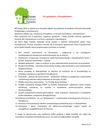 Po spotkaniu z Prezydentem… 08 lutego 2013 w szkole przy Hezjoda odbyło się spotkanie Prezydenta Poznania Ryszarda Grobelnego z mieszkańcami. Spotkanie odbyło się z inicjatywy Prezydenta, w ramach konsultacji z mieszkańcami. Plan spotkania był 3-częściowy: najpierw spotkanie z Radą Osiedla, później spotkanie otwarte dla mieszkańców a na końcu spotkania indywidualne. Do biura Rady Osiedla wpłynęły liczne prośby o zadanie konkretnych pytań Panu Prezydentowi. Prawie wszystkie mieściły się w tematach zgłoszonych Panu Prezydentowi przez Radę Osiedla, która proponowała rozmowę na tematy: 1. Sieć ścieżek rowerowych na Strzeszynie i połączenia z już istniejącymi umożliwiającymi bezpieczne komunikowanie się w mieście. 2. Możliwości i propozycje rozwiązania węzła komunikacyjnego z bezkolizyjnymi lewo- i prawo- skrętami Koszalińska - Lutycka. 3. Wiadukt golęciński - zapis w studium w celu zabezpieczenia przestrzeni na przyszłość. 4. Rondo Koszalińska - Literacka konieczność budowy jako priorytet w celu poprawienia bezpieczeństwa. 5. Nowy przebieg ul. Biskupińskiej na odcinku od Instytutu do ul Koszalińskiej za istniejącą zabudową a ogródkami działkowymi. 6. Przystanki - perony dla szyno busów - możliwości realizacji w połączeniu z planowaną rewitalizacją odcinka trakcji kolejowej w kierunku na Piłę. 7. Kładka rowerowa nad Lutycką - czy istnieją plany budowy. 8. Projekt wywołania nowego MPZP na Osiedlu Wojskowym z głównym celem zmiany kanalizacji sanitarnej na szamba w kontekście zanieczyszczenia jeziora Strzeszyńskiego. 9. Zespół przedszkolno-szkolno-gimnazjalny - brak celowości utworzenia w kontekście liczby oddziałów i prognozie demograficznej. 10. Budowa przedszkola - na „os. Wojskowym”- z ewentualną zamianą gruntu lub przy ul. Wergiliusza. 11. Starania o komunalizację obiektu oświatowego-przedszkola przy ul. Biskupińskiej. 12. Koncepcja i plany rozwojowe dla północno-zachodniego rejonu miasta ze szczególnym uwzględnieniem Strzeszyna. Z uwagi na ograniczony czas spotkania (tylko godzina z Radą Osiedla) nie udało się oczywiście wszystkich tematów poruszyć, na część zaś odpowiedzi nie padły. Strona 1 z 5 Z najważniejszych kwestii usłyszeliśmy, że na realizację wiaduktu golęcińskiego szans nie ma z uwagi na brak środków w budżecie Miasta, które nie będzie realizowało projektów ze środków własnych, lecz w pierwszej kolejności takie, które będą zasilane środkami zewnętrznymi. Tu bardziej realny jest wiadukt Lutycka/Koszalińska. Przypominam, iż Rada Osiedla wystąpiła o zabezpieczenie przestrzeni pod wiadukt w miejscowym planie zagospodarowania, ale wniosek nie został uwzględniony, m.in. z uwagi na brak takiego zapisu w studium (aktualnie wystąpiliśmy również o zmianę studium zagospodarowania w tym zakresie). Ponieważ na spotkaniu obecny był również przedstawiciel m.in. Wydziału Oświaty p. Dyrektor Przemysław Foligowski - uzyskaliśmy zapewnienie o odstąpieniu, na chwilę obecną, z łączenia Zespołu Szkół nr 9 i Przedszkola nr 121 w zespół szkolno -przedszkolny, o co wnioskowaliśmy. Uważamy, iż połączenie w zespół nie przyniesie korzyści finansowych (są minimalne) a uniemożliwi utworzenie nowych miejsc dla przedszkolaków. Naszym celem powinna być budowa nowego lub rozbudowa starego przedszkola. Dużą część spotkania zdominował temat koncepcji rozwojowych dla Strzeszyna. Prezydent nie ukrywał, iż dla Miasta najbardziej wartościowym terenem jest taki teren, który można drogo sprzedać, a więc teren pod budownictwo wielorodzinne. Zwróciliśmy uwagę na kanalizację na Starym Strzeszynie a także na wniosek kilku osób fizycznych o zmianę planu zagospodarowania osiedla wojskowego i umożliwienie budowy szamb. Rada Osiedla uważa taką zmianę za niedopuszczalną i bardzo niekorzystną dla osiedla i Jeziora Strzeszyńskiego w kontekście jego zanieczyszczenia. Co więcej taki precedens stworzy możliwości dla innych inwestorów, zwłaszcza, że nie dla wszystkich terenów mamy uchwalone plany zagospodarowania (np. pola przy Literackiej). Podkreślaliśmy brak rozwiązań transportowych dla Strzeszyna, każdy wyjazd z osiedla musi odbywać się bowiem przez tory kolejowe, a także skomunikowanie Strzeszyna Starego z Greckim i Literackim oraz z centrum. Prezydent poinformował o pojawieniu się szansy na szynobus oraz o tym, że działania Miasta będą się odbywały w kierunku rozwijania komunikacji publicznej. Strona 2 z 5 Stanowisko Prezydenta Ryszarda Grobelnego w wybranych sprawach: Jakie tematy nurtują Prezydenta na terenie Rady Osiedla? Jaka jest jego wizja rozwoju Strzeszyna na tle Miasta? a) Stosunek Prezydenta do samorządów lokalnych - jest bardzo pozytywny, b) Studium Kierunków i Uwarunkowań Zagospodarowania Przestrzennego - potrzebna i wskazana ewolucyjna zmiana Studium. Kierunek: zwiększenie terenów mieszkaniowych, kosztem terenów przemysłowych; ale oczekiwania inwestorów i środowiska też trzeba uwzględnić. Poznań narzeka na brak inwestorów, c) Rozwój rejonu Strzeszyna - raczej problem realizacji zamierzeń, które istnieją, a nie wprowadzanie nowych. Raczej intensywna funkcja i szukanie kompromisów. Zbyt mała intensywność zabudowy powoduje, że niska jest wartość terenu. Niemniej, zbyt intensywne zagospodarowanie terenu - też nie jest idealne. Problemów przestrzennych nie widzi, raczej problem realizacji. W miarę wzrostu liczby mieszkańców problemy się intensyfikują, które dostrzega. Strzeszyn jest rozwojowy, inwestycyjny, liczba mieszkańców rośnie - tymczasem Śródmieście przegęszczone, d) Newralgiczna dla Strzeszyna jest dyskusja o połączeniach komunikacyjnych ze Śródmieściem-Ważne jest połączenie kolejowe typu podmiejskiego. Liczy wstępnie, że jest około 60 dworców w Poznaniu i powiecie, które nie wrócą do tej funkcji, e) Budowa wiaduktu na ul. Lechickiej w