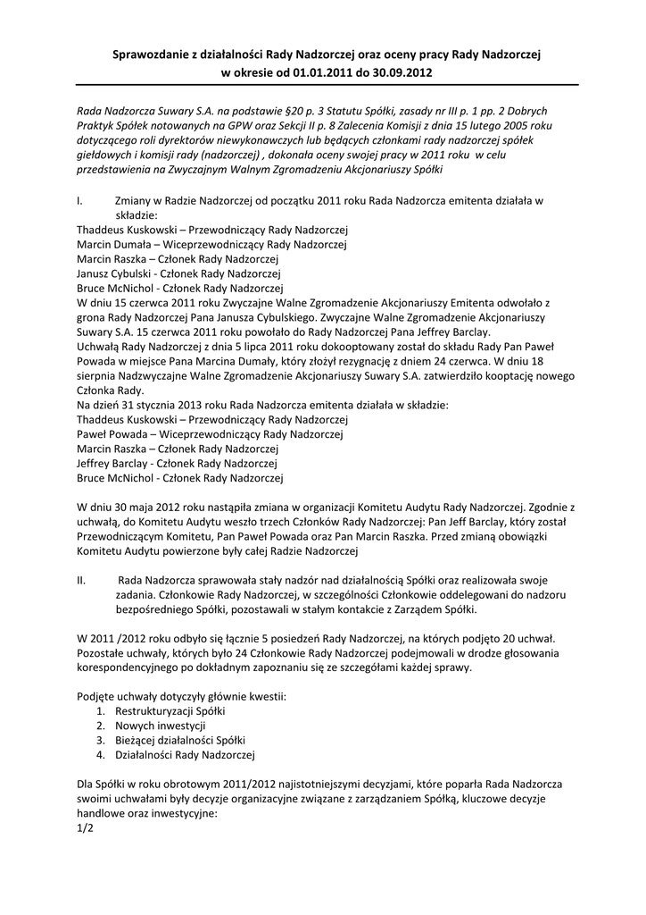 Sprawozdanie z działalności Rady Nadzorczej oraz oceny pracy Rady Nadzorczej w okresie od 01.01.2011 do 30.09.2012 Rada Nadzorcza Suwary S.A. na podstawie §20 p. 3 Statutu Spółki, zasady nr III p. 1 pp. 2 Dobrych Praktyk Spółek notowanych na GPW oraz Sekcji II p. 8 Zalecenia Komisji z dnia 15 lutego 2005 roku dotyczącego roli dyrektorów niewykonawczych lub będących członkami rady nadzorczej spółek giełdowych i komisji rady (nadzorczej) , dokonała oceny swojej pracy w 2011 roku w celu przedstawienia na Zwyczajnym Walnym Zgromadzeniu Akcjonariuszy Spółki I. Zmiany w Radzie Nadzorczej od początku 2011 roku Rada Nadzorcza emitenta działała w składzie: Thaddeus Kuskowski – Przewodniczący Rady Nadzorczej Marcin Dumała – Wiceprzewodniczący Rady Nadzorczej Marcin Raszka – Członek Rady Nadzorczej Janusz Cybulski - Członek Rady Nadzorczej Bruce McNichol - Członek Rady Nadzorczej W dniu 15 czerwca 2011 roku Zwyczajne Walne Zgromadzenie Akcjonariuszy Emitenta odwołało z grona Rady Nadzorczej Pana Janusza Cybulskiego. Zwyczajne Walne Zgromadzenie Akcjonariuszy Suwary S.A. 15 czerwca 2011 roku powołało do Rady Nadzorczej Pana Jeffrey Barclay. Uchwałą Rady Nadzorczej z dnia 5 lipca 2011 roku dokooptowany został do składu Rady Pan Paweł Powada w miejsce Pana Marcina Dumały, który złożył rezygnację z dniem 24 czerwca. W dniu 18 sierpnia Nadzwyczajne Walne Zgromadzenie Akcjonariuszy Suwary S.A. zatwierdziło kooptację nowego Członka Rady. Na dzień 31 stycznia 2013 roku Rada Nadzorcza emitenta działała w składzie: Thaddeus Kuskowski – Przewodniczący Rady Nadzorczej Paweł Powada – Wiceprzewodniczący Rady Nadzorczej Marcin Raszka – Członek Rady Nadzorczej Jeffrey Barclay - Członek Rady Nadzorczej Bruce McNichol - Członek Rady Nadzorczej W dniu 30 maja 2012 roku nastąpiła zmiana w organizacji Komitetu Audytu Rady Nadzorczej. Zgodnie z uchwałą, do Komitetu Audytu weszło trzech Członków Rady Nadzorczej: Pan Jeff Barclay, który został Przewodniczącym Komitetu, Pan Paweł Powada oraz Pan Marcin Raszka. Przed zmianą obowiązki Komitetu Audytu powierzone były całej Radzie Nadzorczej II. Rada Nadzorcza sprawowała stały nadzór nad działalnością Spółki oraz realizowała swoje zadania. Członkowie Rady Nadzorczej, w szczególności Członkowie oddelegowani do nadzoru bezpośredniego Spółki, pozostawali w stałym kontakcie z Zarządem Spółki. W 2011 /2012 roku odbyło się łącznie 5 posiedzeń Rady Nadzorczej, na których podjęto 20 uchwał. Pozostałe uchwały, których było 24 Członkowie Rady Nadzorczej podejmowali w drodze głosowania korespondencyjnego po dokładnym zapoznaniu się ze szczegółami każdej sprawy. Podjęte uchwały dotyczyły głównie kwestii: 1. Restrukturyzacji Spółki 2. Nowych inwestycji 3. Bieżącej działalności Spółki 4. Działalności Rady Nadzorczej Dla Spółki w roku obrotowym 2011/2012 najistotniejszymi decyzjami, które poparła Rada Nadzorcza swoimi uchwałami były decyzje organizacyjne związane z zarządzaniem Spółką, kluczowe decyzje handlowe oraz inwestycyjne: 1/2 1. Powołanie Prezesa Zarządu, Powołanie Wiceprezesa zarządu. Ustalenie warunków zatrudnienia Prezesa Zarządu. 2. Przyjęcie Przyjęcie jednolitego tekstu Statutu Suwary S.A. 3. Zatwierdzenie umów z wiodącymi klientami Lotos Oil i Orlen Oil. 4. Upoważnienia Zarządu Spółki do zakupu linii produkcyjnej do produkcji opakowan do 2l 5. Upoważnienie Zarządu do zakupu wtryskarek do produkcji zakretki bezpiecznej 6. Wyrażenie zgody na zakup gniazda produkcyjnego do produkcji zakrętki ø38B Ponadto Rada Nadzorcza brała czynny udział w realizacji procesu restrukturyzacji Spółki oraz w podejmowaniu decyzji istotnych dla bieżącej działalności Suwary S.A. podejmując m. in. uchwały w sprawie: 1. Zatwierdzenia budżetu na 2011 rok oraz na okres od 01.01.2012 do 30.09.2012r. 2. Podpisanie umowy sprzedaży znaku towarowego z podmiotem powiązanym Kartpol Group Sp. z o.o. 3. Wyrażenie zgody na podpisanie aneksu do przedwstępnej umowy sprzedaży udziałów z Panem Szczepanem Kwiatkiem. 4. Określenie przez Zarząd ceny emisyjnej akcji serii C 2. Pozbawienie akcjonariuszy prawa poboru III. Na posiedzeniach Rada Nadzorcza otrzymywała od Zarządu informacje o bieżącej działalności Spółki przygotowane według danych za ostatni zakończony miesiąc i narastająco od początku roku: - rachunek zysków i strat w układzie kalkulacyjnym i porównawczym - bilans - rachunek przepływów pieniężnych - sprawozdanie z wykonania planu sprzedaży - sprawozdanie z wykonania kosztów wg rodzaju - bieżące informacje dotyczące Spółki oraz planowanych inwestycji Podejmowane i analizowane przez Radę problemy miały na celu usprawnienie zarządzania Spółką w celu uzyskania maksymalizacji osiąganych przez nią wyników finansowych, wzrostu jej wartości i zapewnienia długofalowego rozwoju. Rada Nadzorcza formułowała pod adresem Zarządu wskazówki dotyczące sposobu osiągania wymienionych celów. Rada Nadzorcza podjęła takżedecyzje usprawniajęce jej prace przyjmując na posiedzeniu w dniu 18.08.2011 nowy Regulamin Rady Nadzorczej. IV. Rada Nadzorcza wypełniała obowiązki komitetu audytu dd początku okresu sprawozdawczego do powołania Komitetu Audytu w dniu 30 maja 2012. Obowiązki Przewodniczącego objął Pan Jeff Barclay, obowiązki Członków Komitetu: Pan Paweł Powada i Pan Marcin Raszka. V. Przedstawione sprawozdanie zawiera kierunki głównych działań Rady Nadzorczej w 2011/2012 roku. Każdy Członek Rady Nadzorczej dołożył należytej staranności oraz zaangażowania w wykonywanie swoich obowiązków w Radzie. Mając powyższe na uwadze Rada Nadzorcza pozytywnie ocenia swoją pracę w Suwary S.A. w okresie od 01.01.2011 roku do 30.09.2012 roku oraz współpracę z Zarządem Spółki. Marzec 2013r. 2/2
